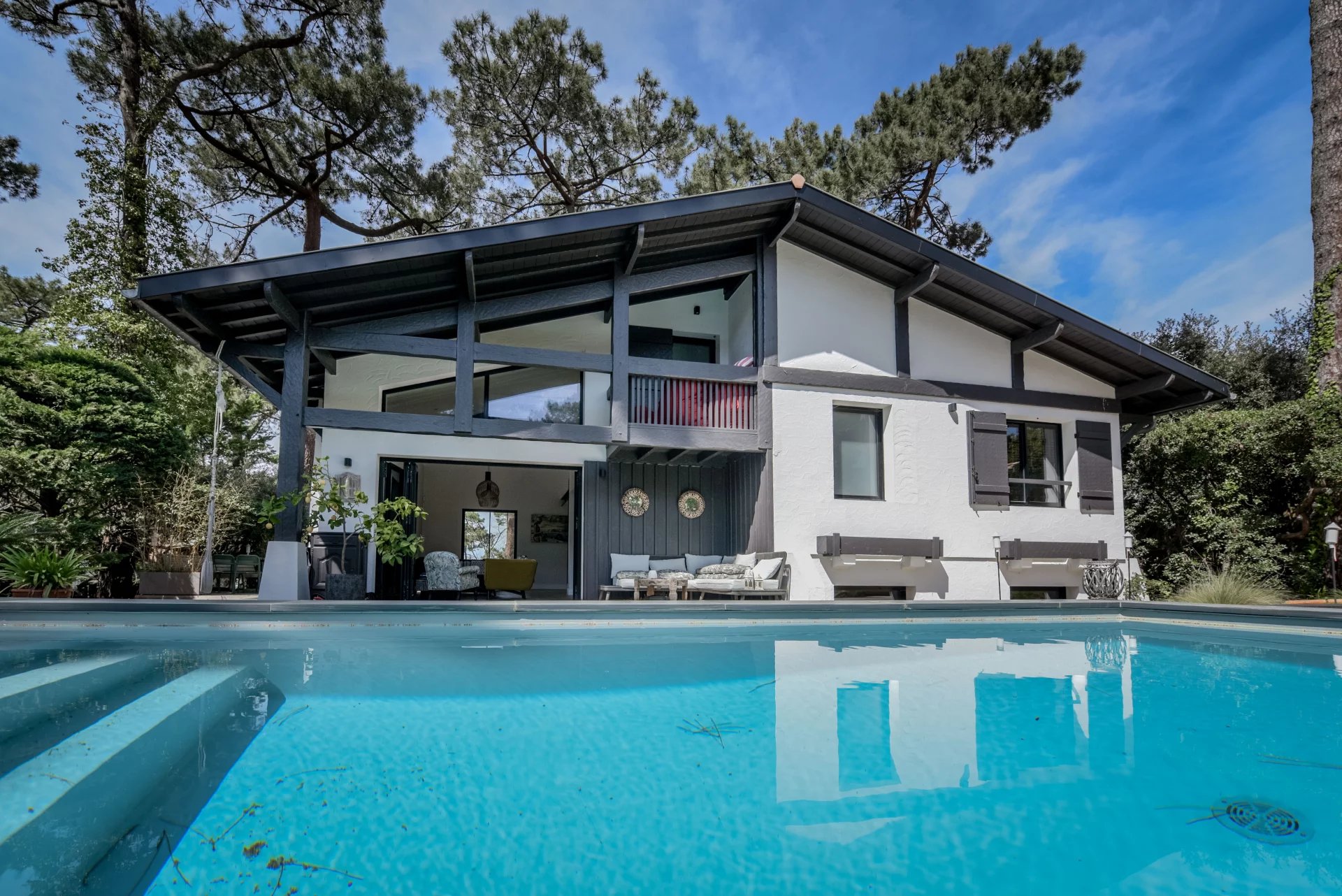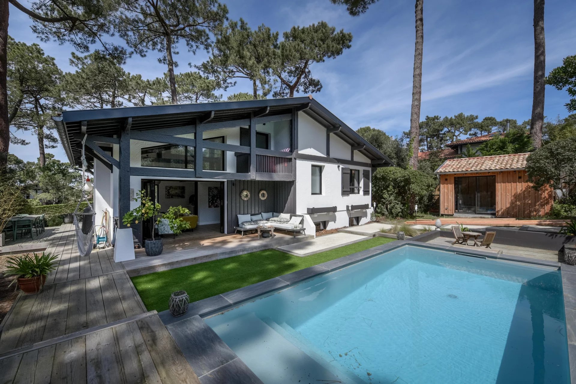 The luxury villas for sale in Gujan-Mestras generally have landscaped parks, heated private pools, and other leisure facilities that allow you to fully enjoy the Mediterranean environment. The beautiful wooden or stone terraces often overlook gardens adorned with local species adapted to the mild and humid climate of the Arcachon Bay.