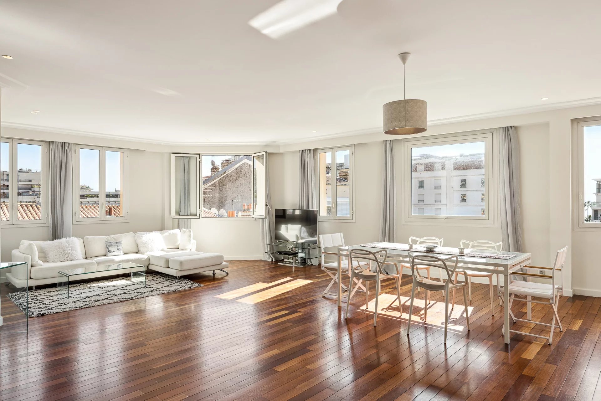 Ideally located just a few meters from the famous Croisette, on the 4th and top floor of a luxury residence, this 91 sqm 3-room apartment in excellent condition offers an...