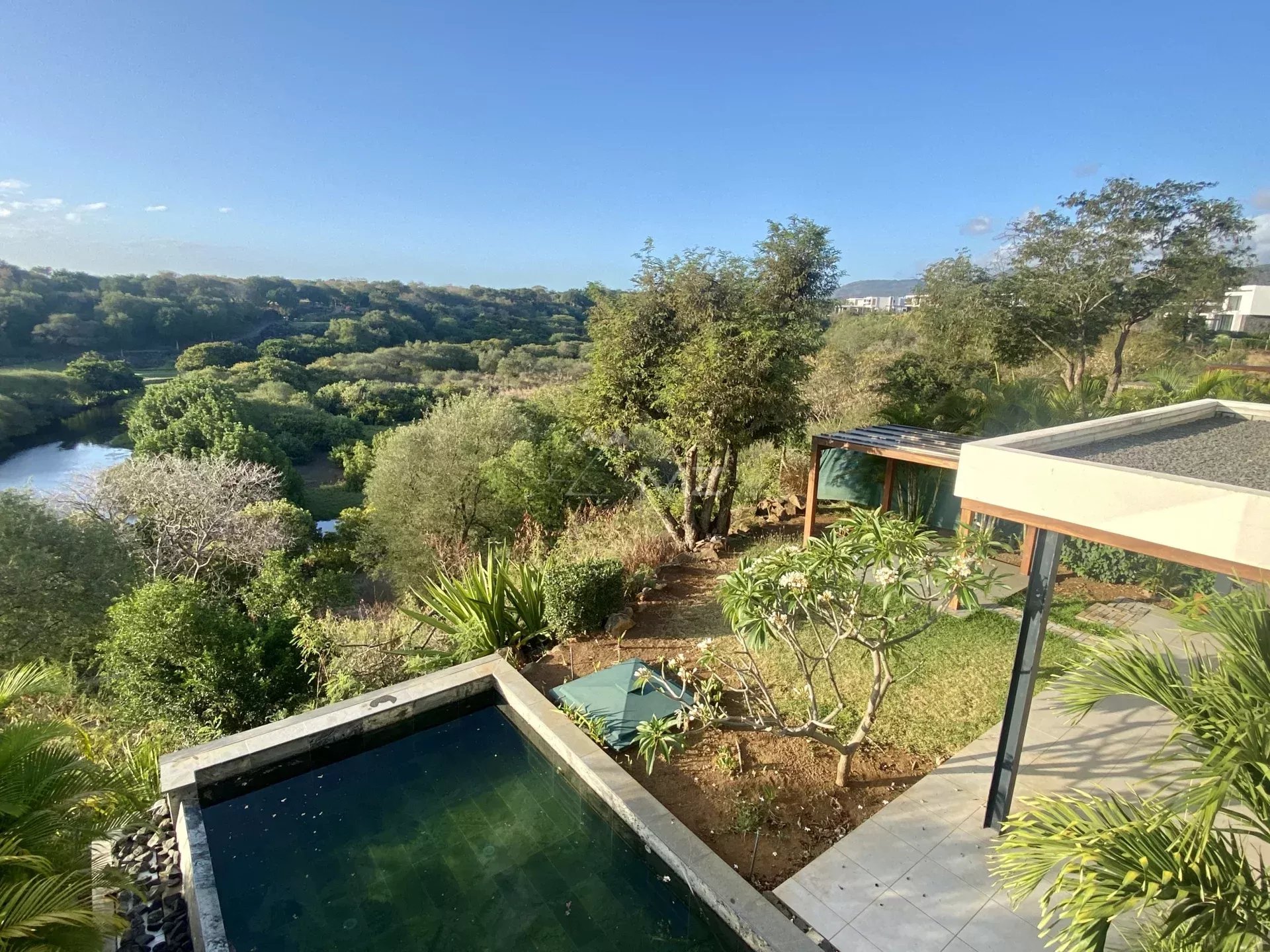 Located in a secure residence, this villa is nestled in a preserved, calm and green environment, on the west coast of Mauritius. The estate is bordered by the prestigious 18-hole Tamarina golf course and the river that flows into the sea, creating a splendid natural peninsula. This unique place, perched nearly 30 meters above the surrounding nature, offers a panoramic view, with a gentle slope leading the river to Tamarin Bay.