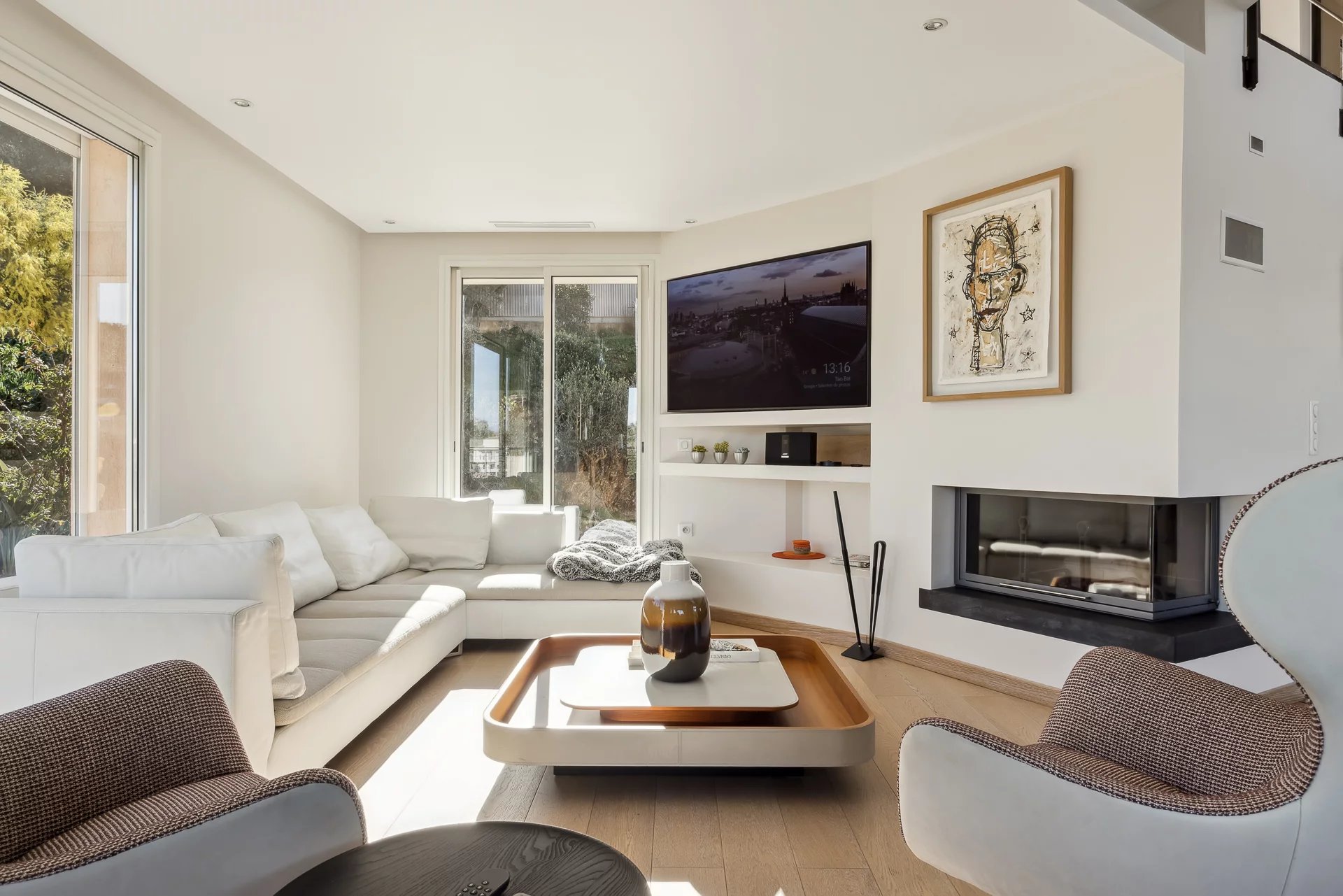 In the heart of the residential area of Super-Cannes, in absolute peace and quiet, majestic modern Provencal-style villa of around 390 sqm metres, in perfect condition and completely renovated in a contemporary style. The east-west facing villa boasts incredible light and a clear view over a forest of mimosa trees (a green zone classified as a woodland that cannot be built on) and the mountains. With its beautiful Gaggenau-equipped Poliform kitchen, en suite dining room, living room with wood-burning fireplace and 5 en suite bedrooms with bathroom or shower, it offers comfort and privacy to the family and its guests.