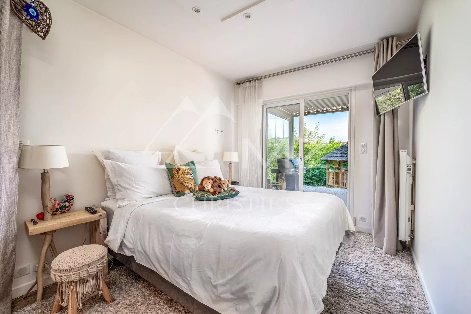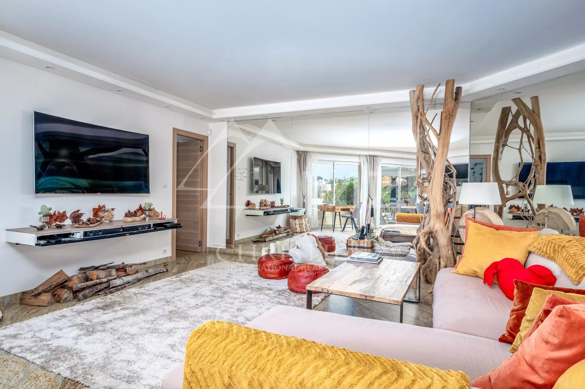 Offering approximately 265 sqm of living space across two levels, the property features on the garden level spacious reception areas of around 65 sqm with a fully equipped open-plan kitchen, extending onto a vast terrace of approximately 300 sqm and the swimming pool. Two suites are located on this level, including a magnificent master suite with a large walk-in closet.