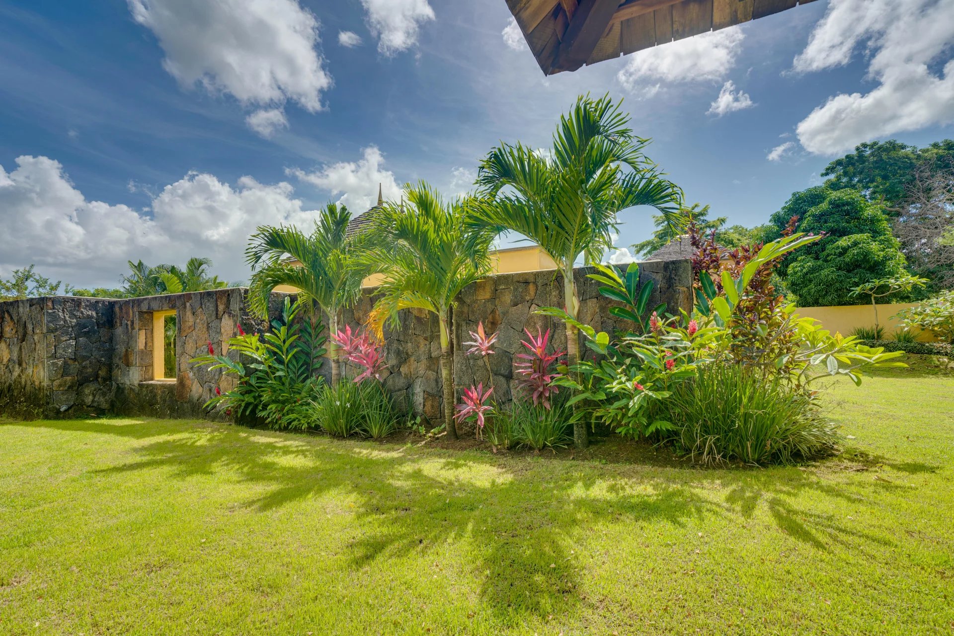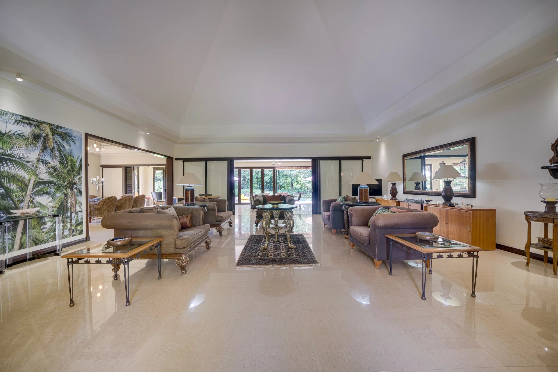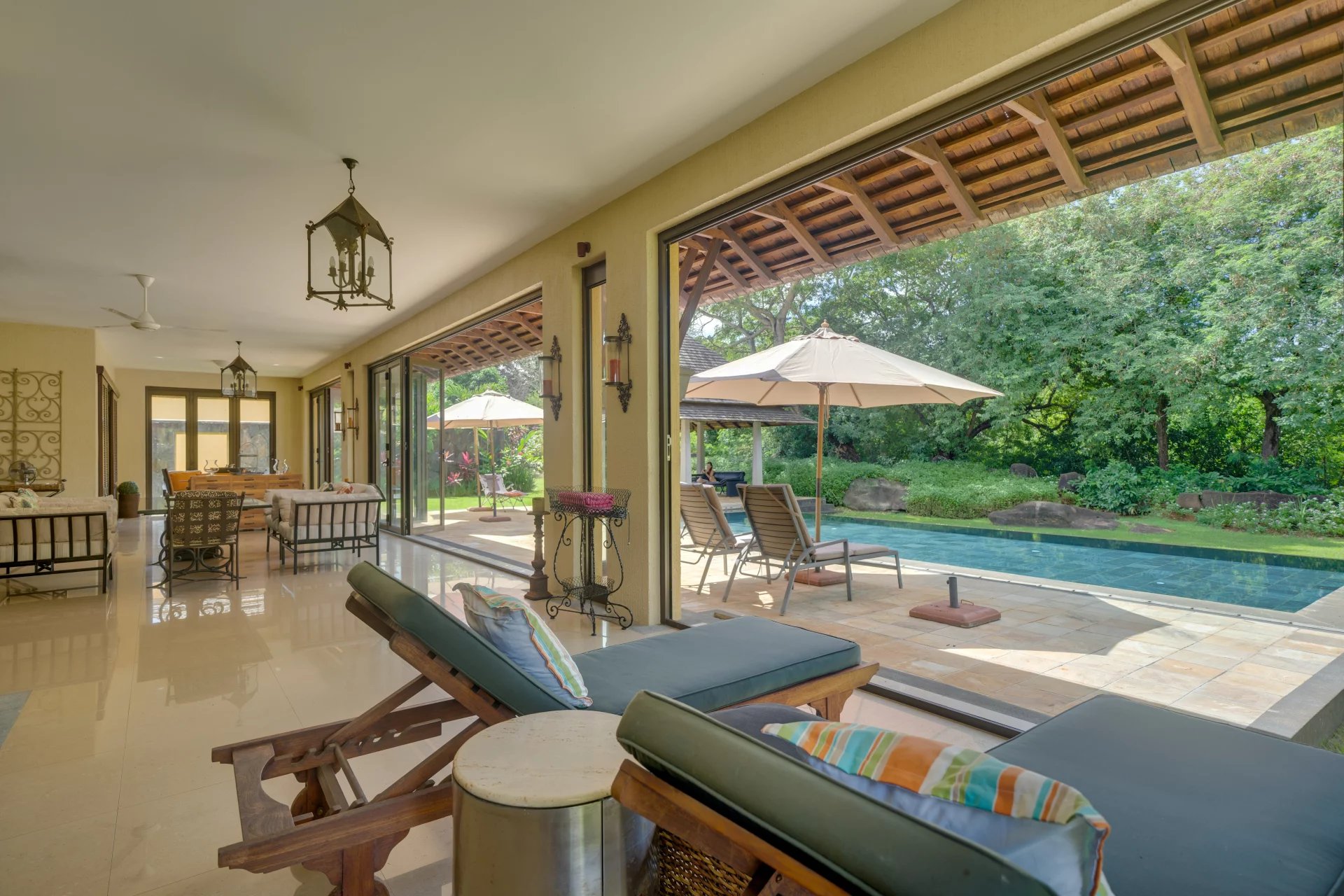 Large bay windows flood the interiors with natural light and open onto a spacious covered veranda offering breathtaking views of the lush gardens.