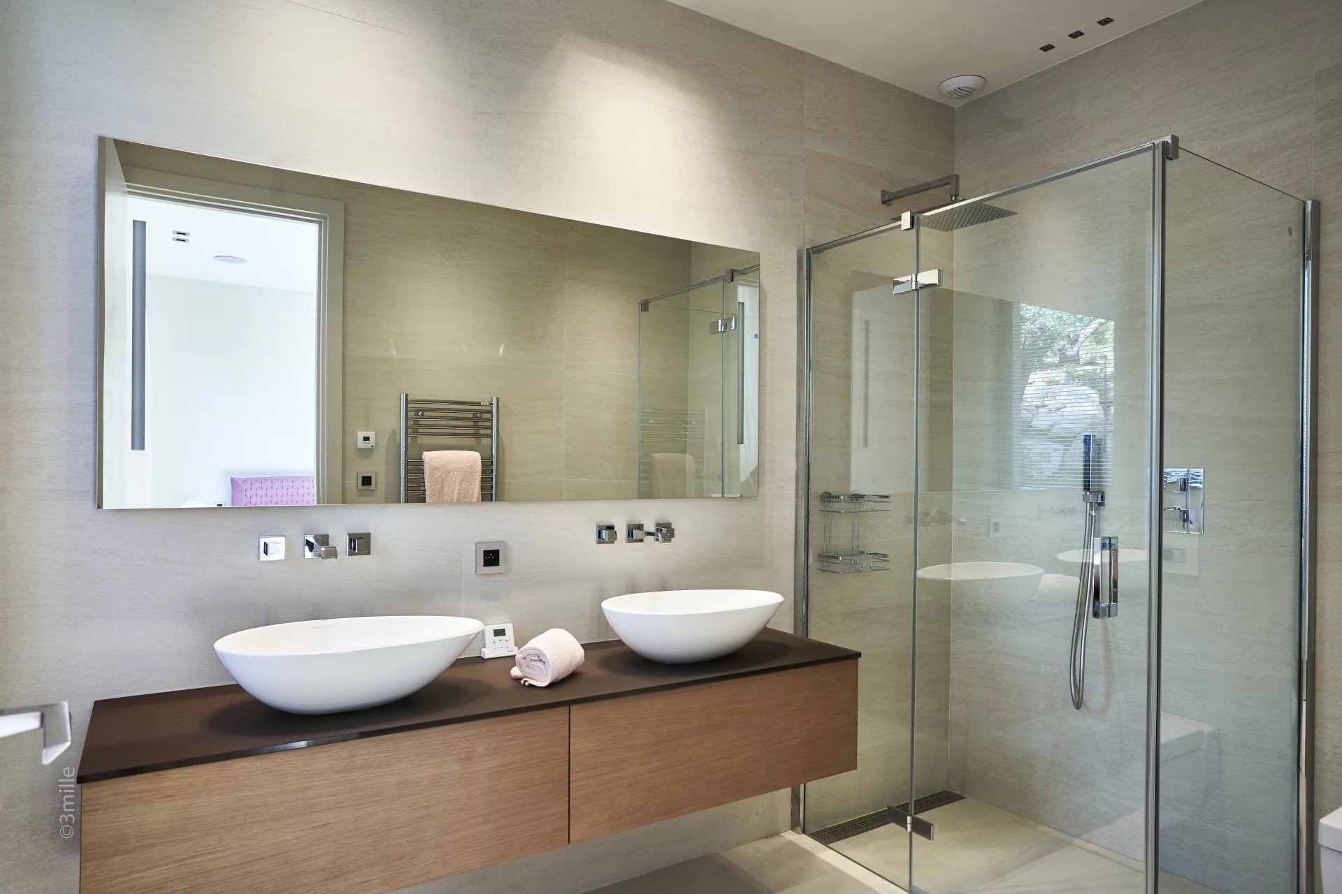 The villa includes five en-suite bedrooms: on the ground floor, two suites with either a bath or shower room, and a single bedroom with its own shower room. Upstairs, one suite with bath and shower, and a spacious master suite with bath, shower, walk-in wardrobe, and a separate lounge with a sofa bed and an additional shower room that can serve as a sixth bedroom.