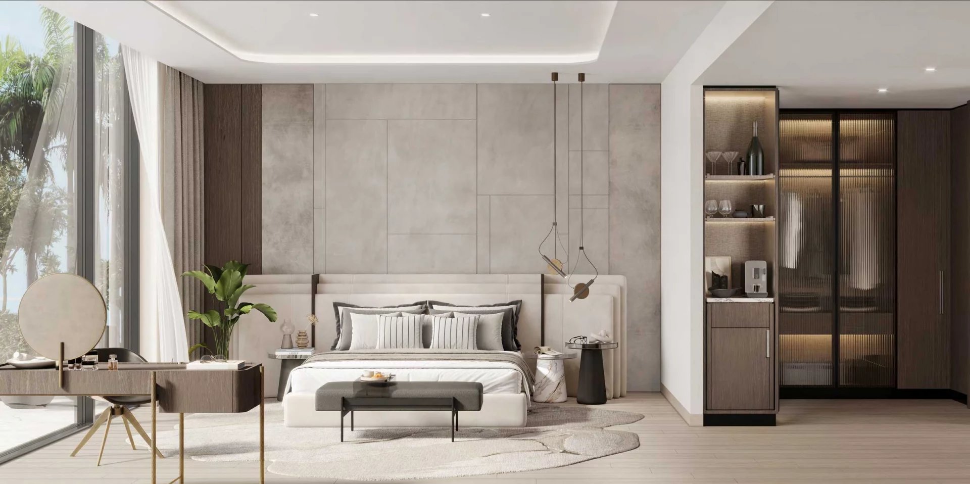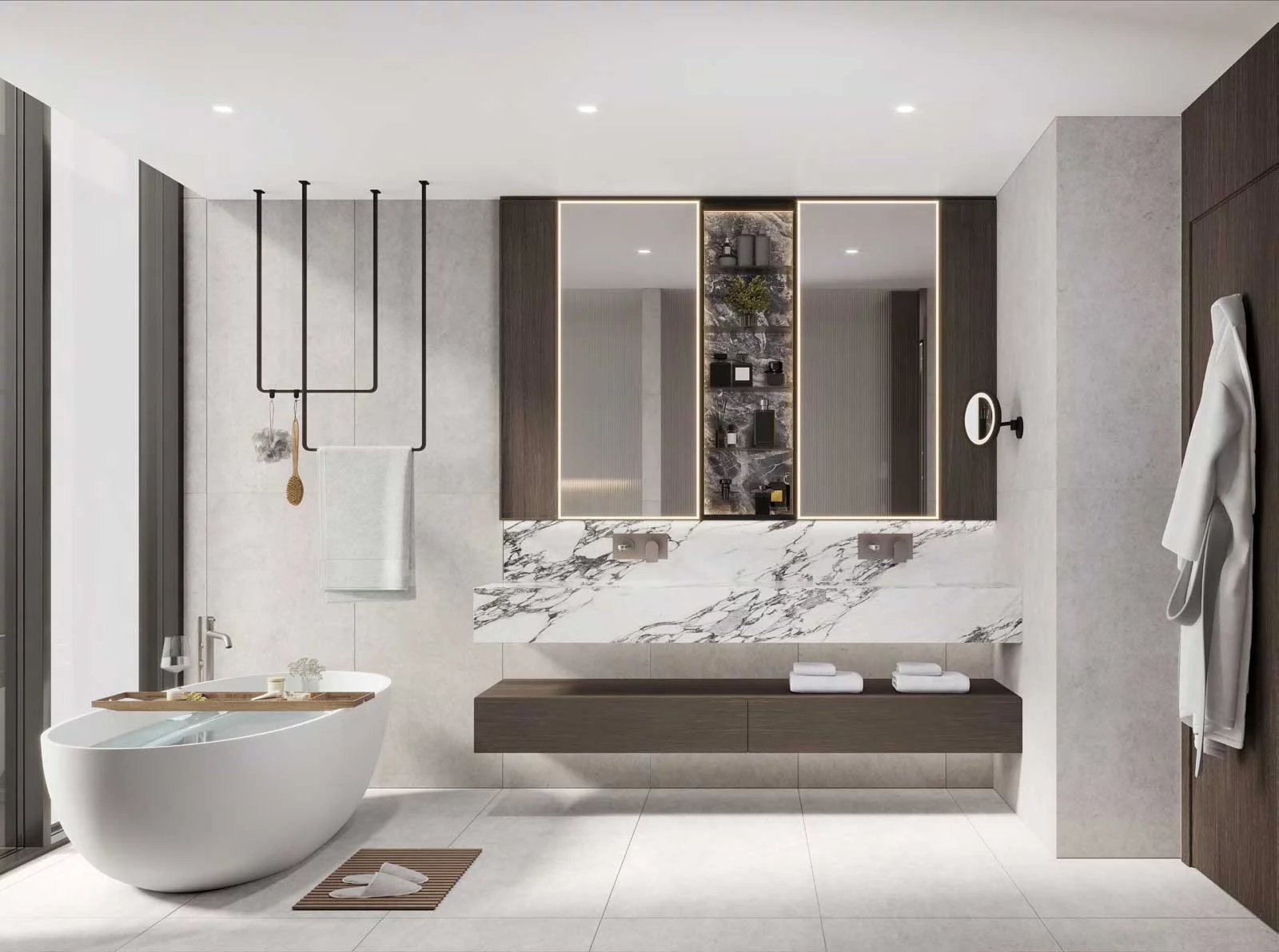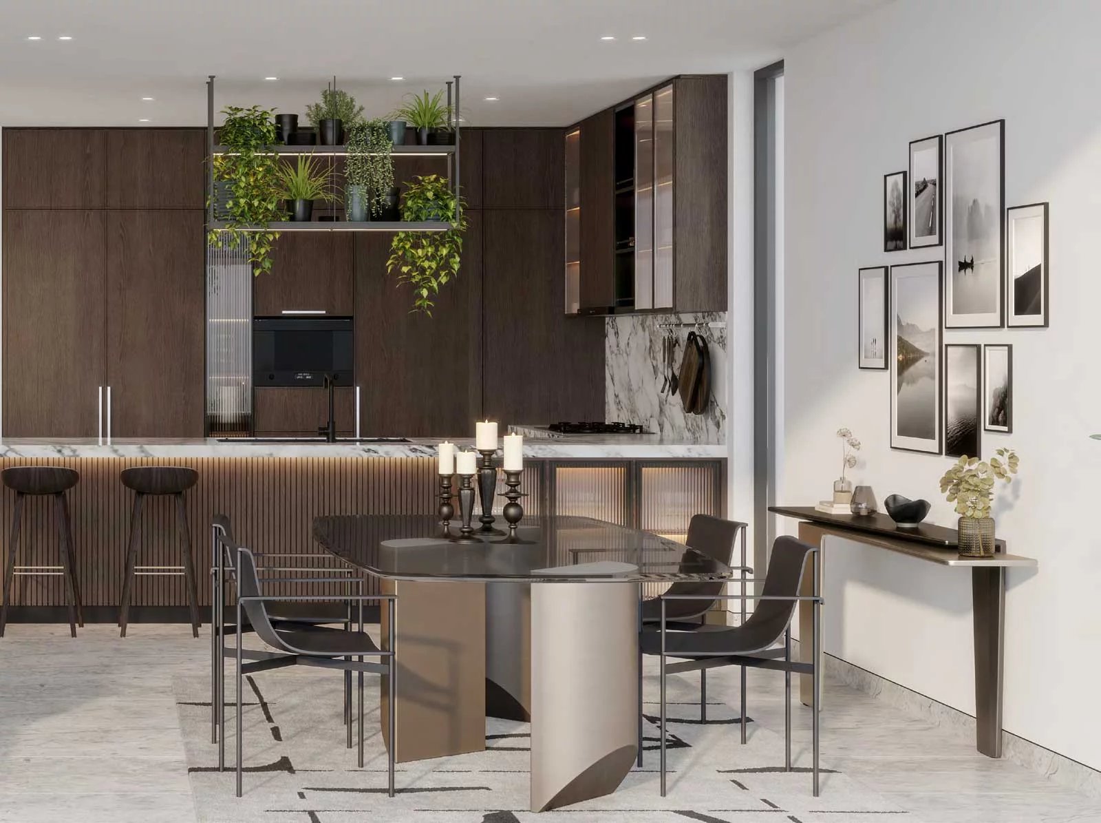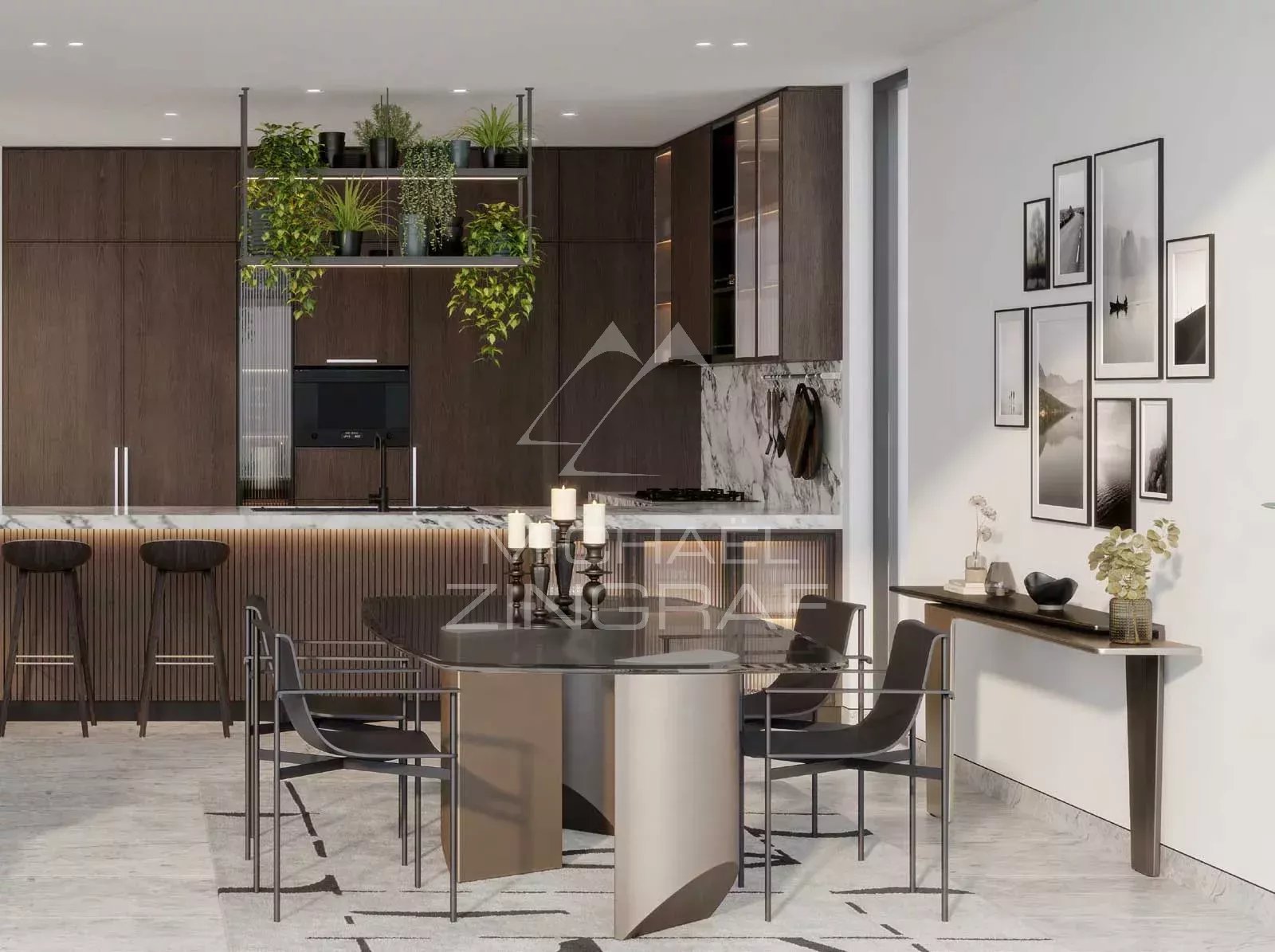 Built-in freezer and fridge and dishwasher from a prestigious brand (Smeg or equivalent). High-end counter kitchen countertop. Premium quality large size sink with accessories. High-quality faucet with features (Franke or equivalent). Kitchen cabinetry features a combination of natural wood veneer and high-quality laminate. European ironmongery hinges and handles (Hafele or equivalent). Premium accessories such as pull-out waste bin, pull-out spice rack, tip-out tray, and handling rail.
