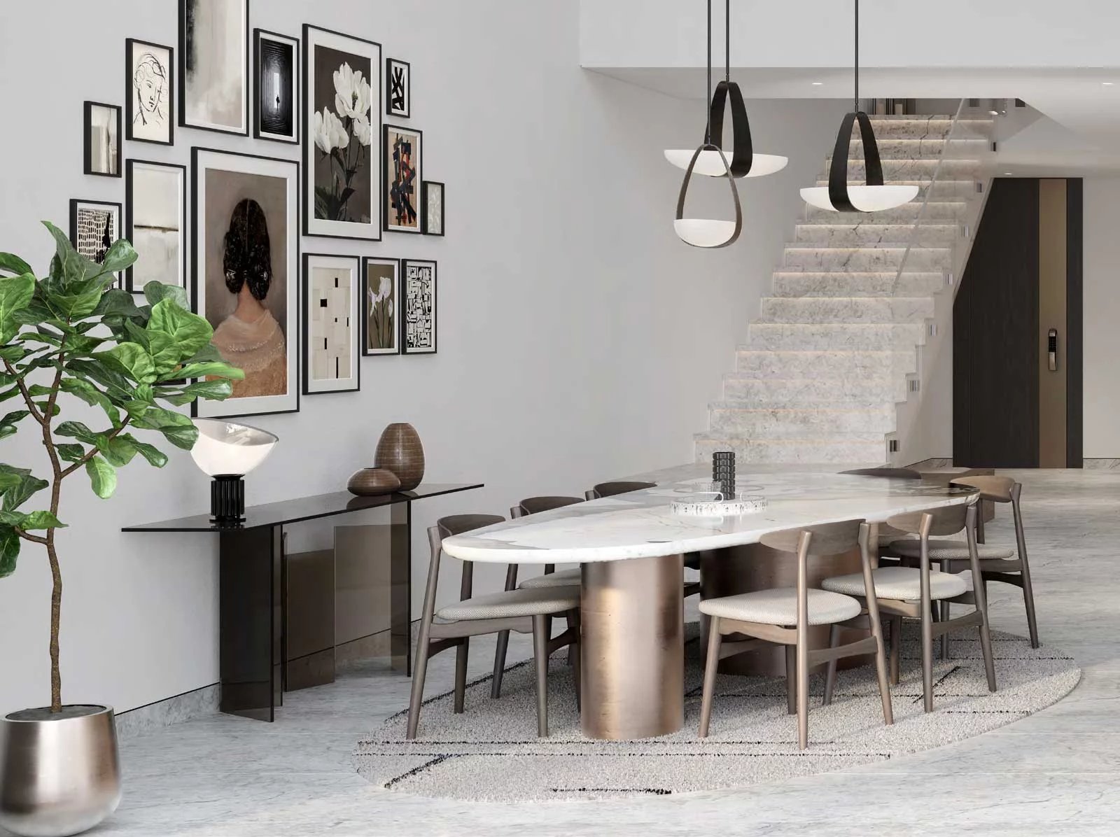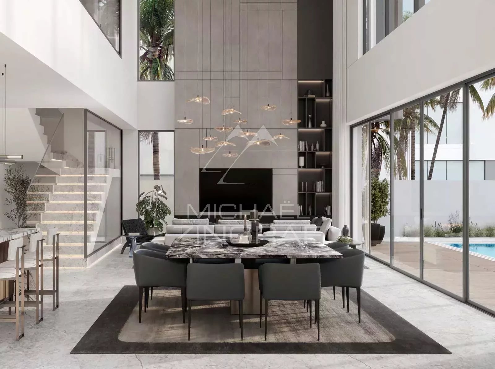 Finishing and materials: Grand, full-height statement entrance door with a smart lock system. Floor-to-ceiling glass panels. High quality wooden-look flooring on the First and Second Floors. Welcoming foyer with natural light illumination from the upper window. Feature staircase with an elegantly designed handrail and premium marble steps. Dedicated Laundryroom. High-quality ironmongery and hardware by Hafele or equivalent for the front-of-house door. Dedicated Maid’s room with bathroom. Elegantly designed front-of-house full-height door with fixed panels above. Marble flooring on the Ground Floor and staircase on all levels. All bedrooms have en-suite bathrooms and high-end, fully fitted walk-in closets.