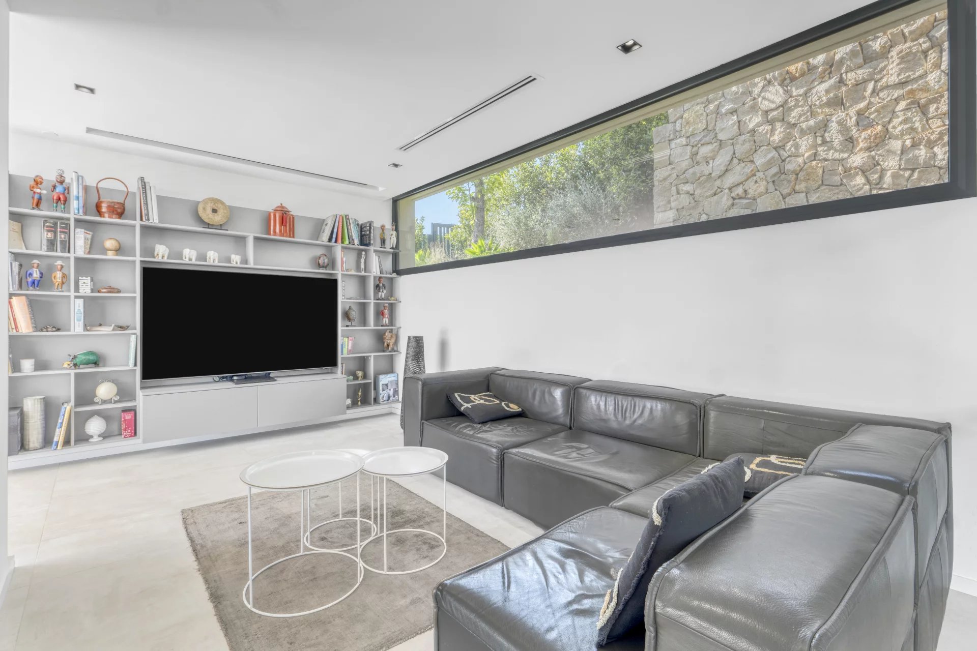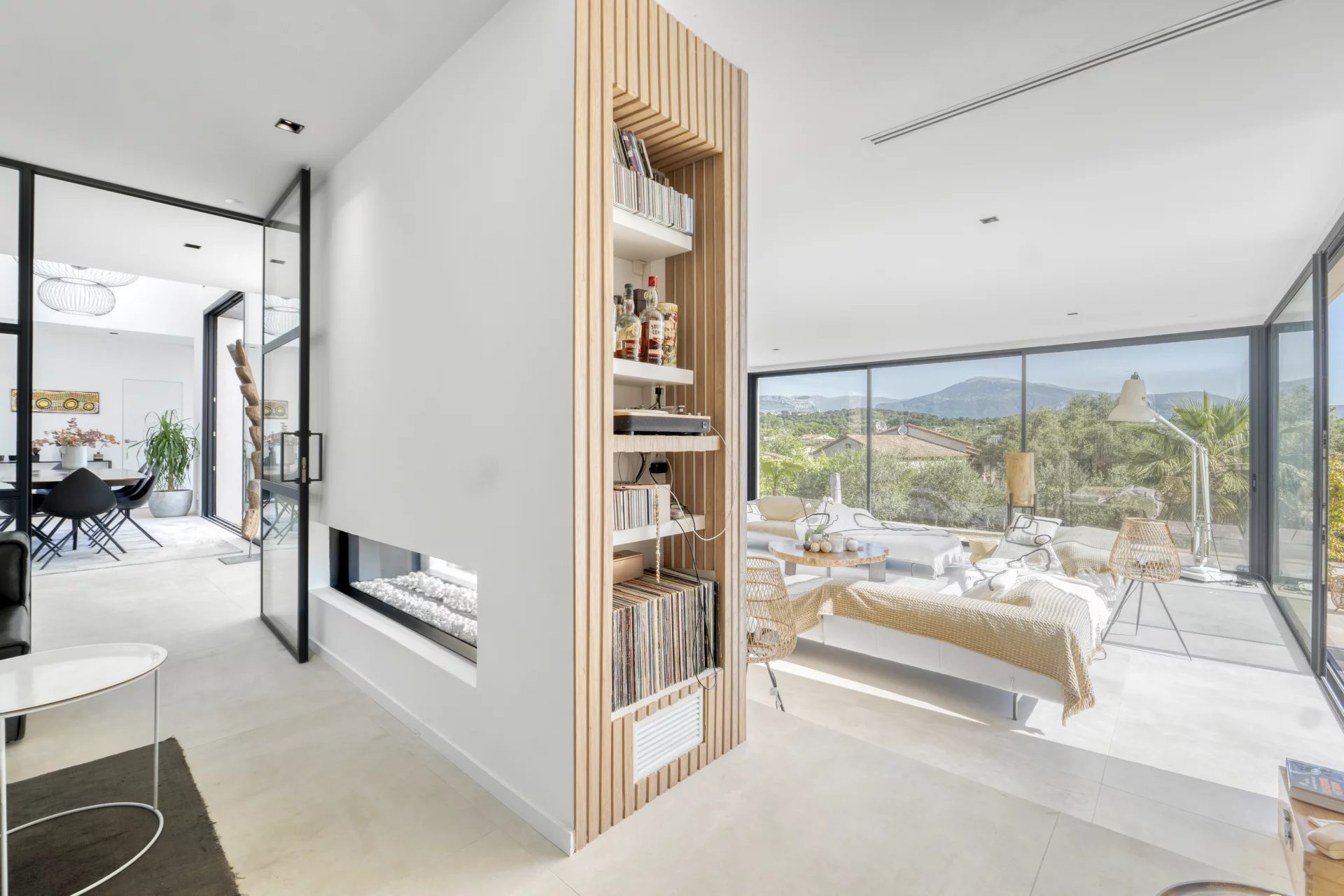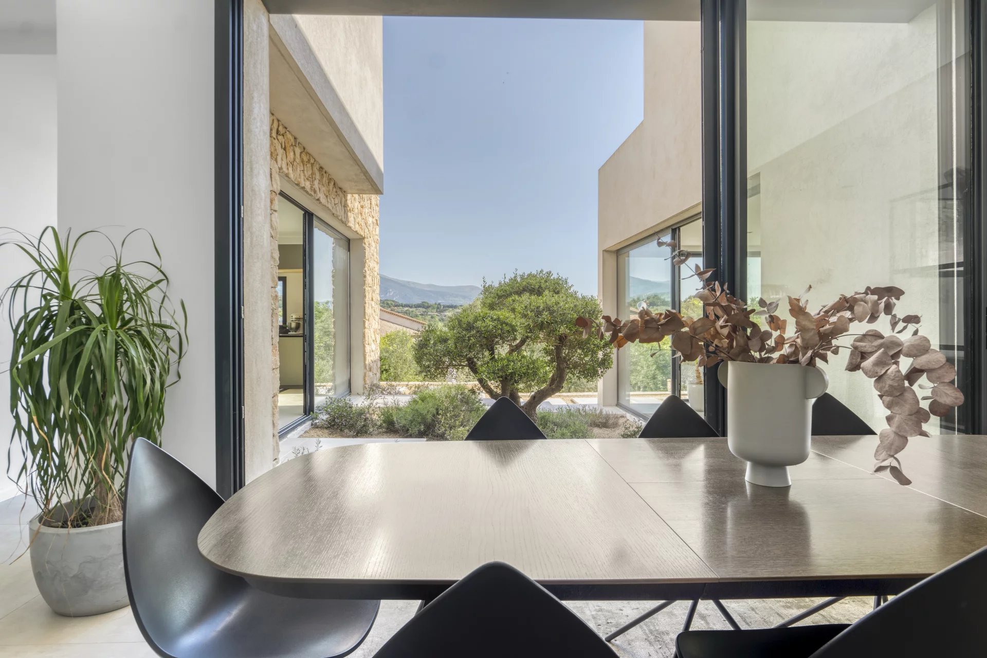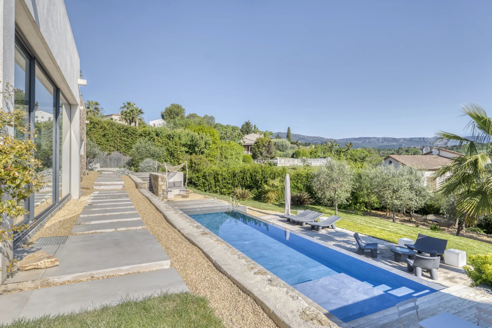 Located just a few minutes’ walk from the village of Valbonne, this contemporary villa offers approximately 300 m² of living space on a 1,545 m² plot. It enjoys open views of the surrounding hills.