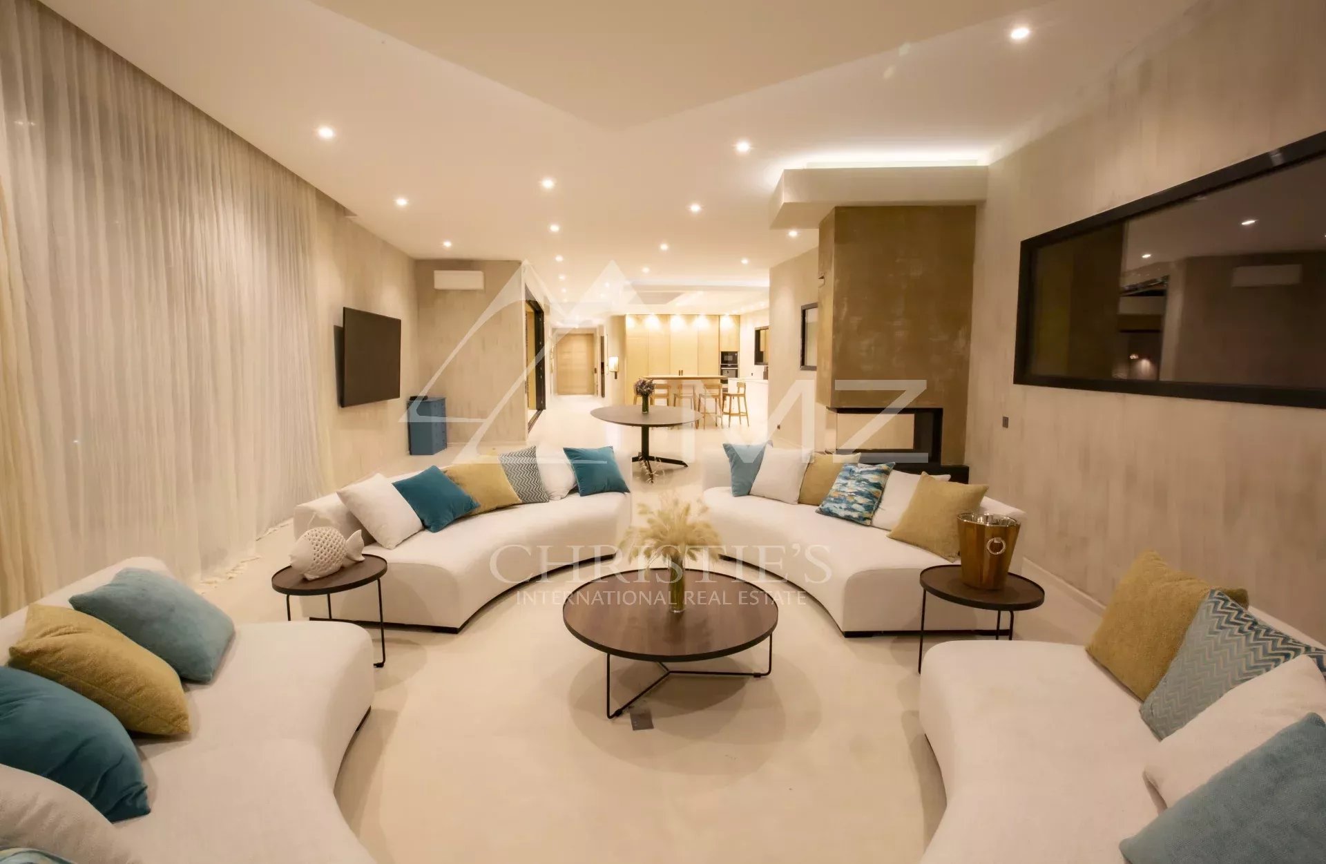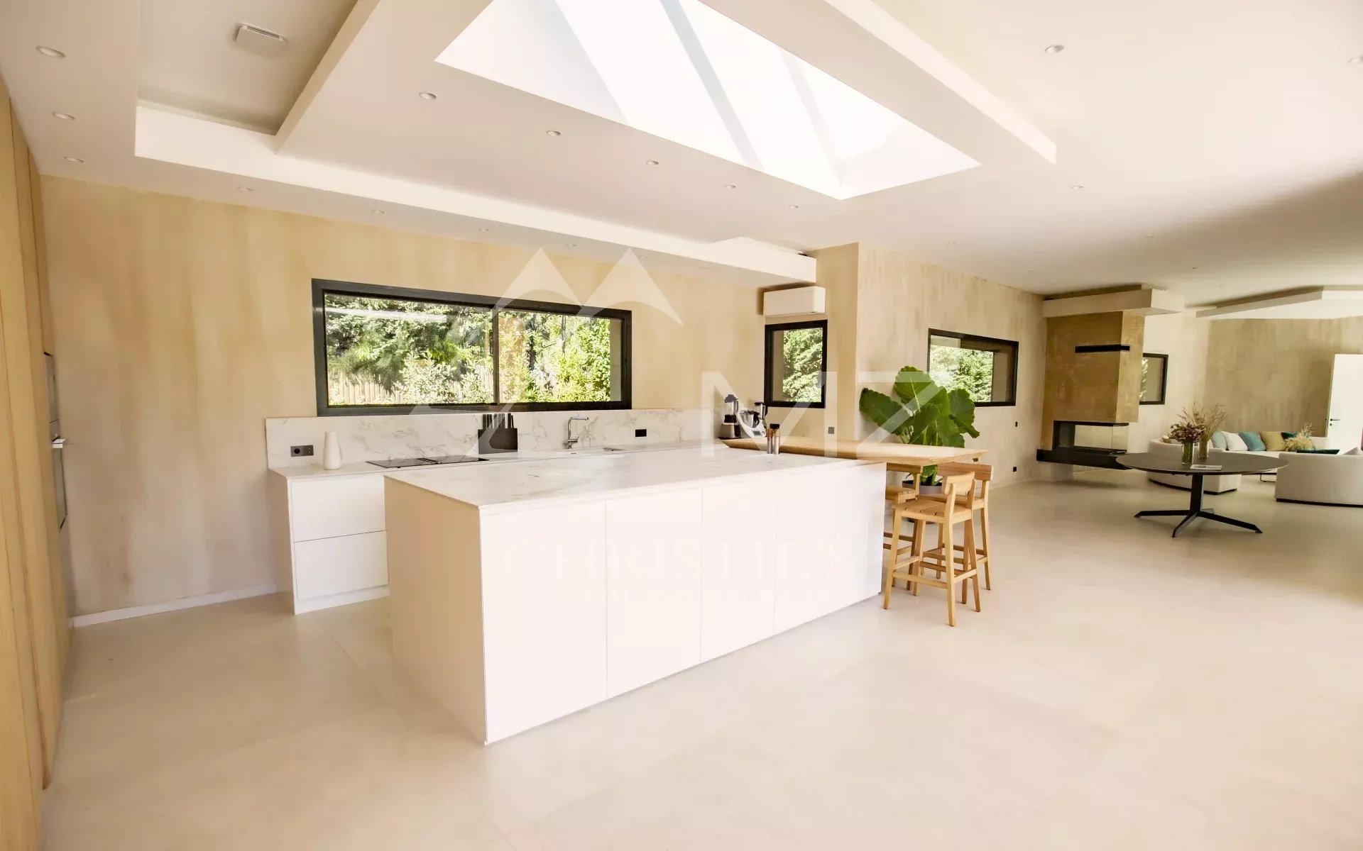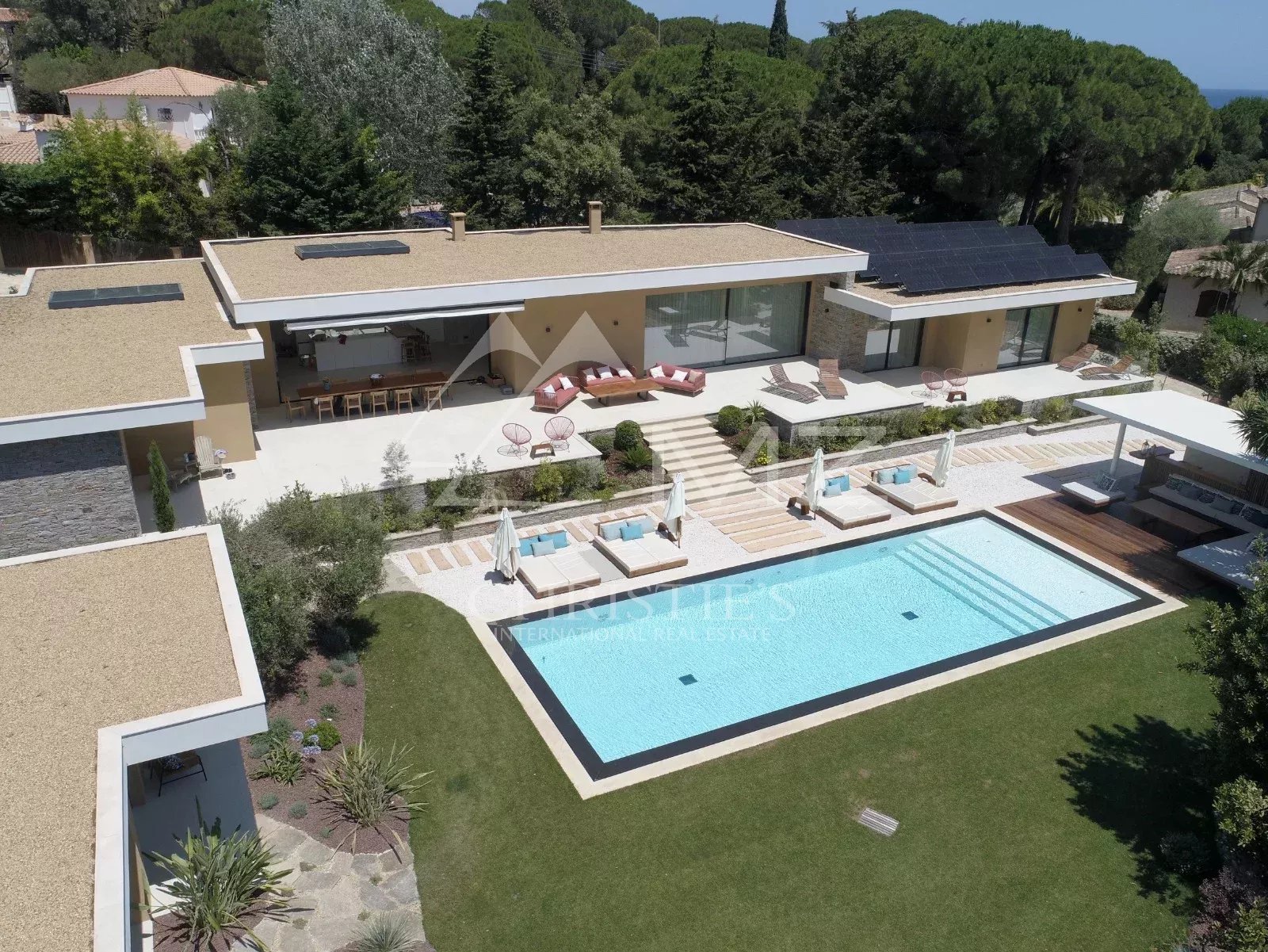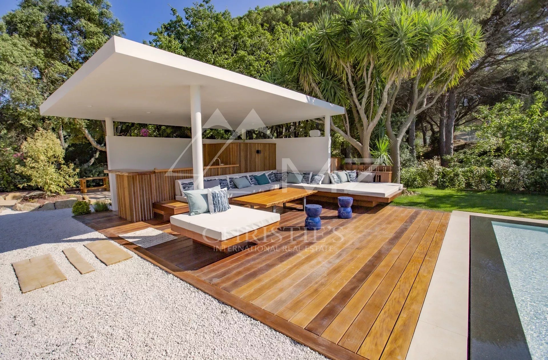 Very refined Californian-style villa, ideally located 8 minutes walk from the beaches of Pampelonne, offers generous volumes and consists of a contemporary living room with its fireplace opening onto the garden, a dining room, a kitchen also open to the sheltered terrace, 6 en-suite bedrooms including one in an independent apartment.