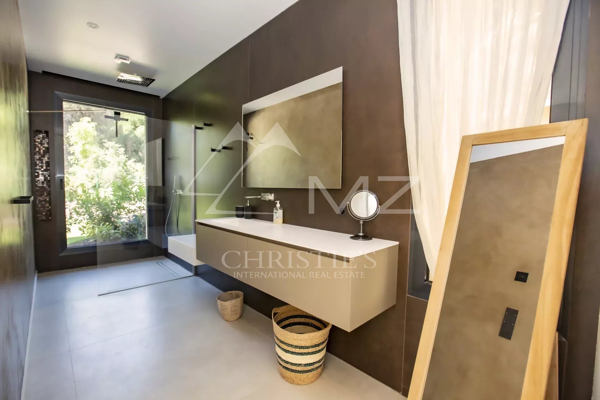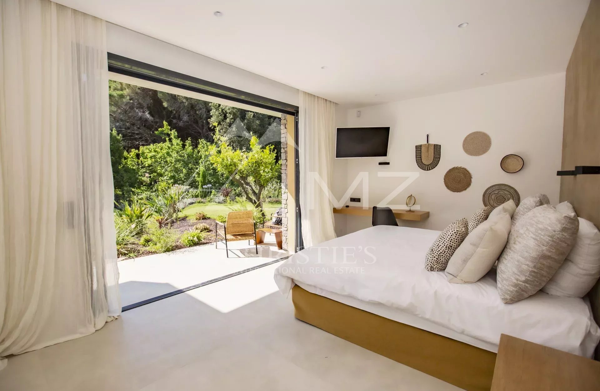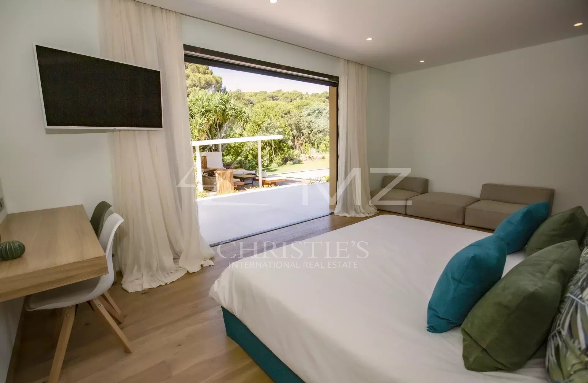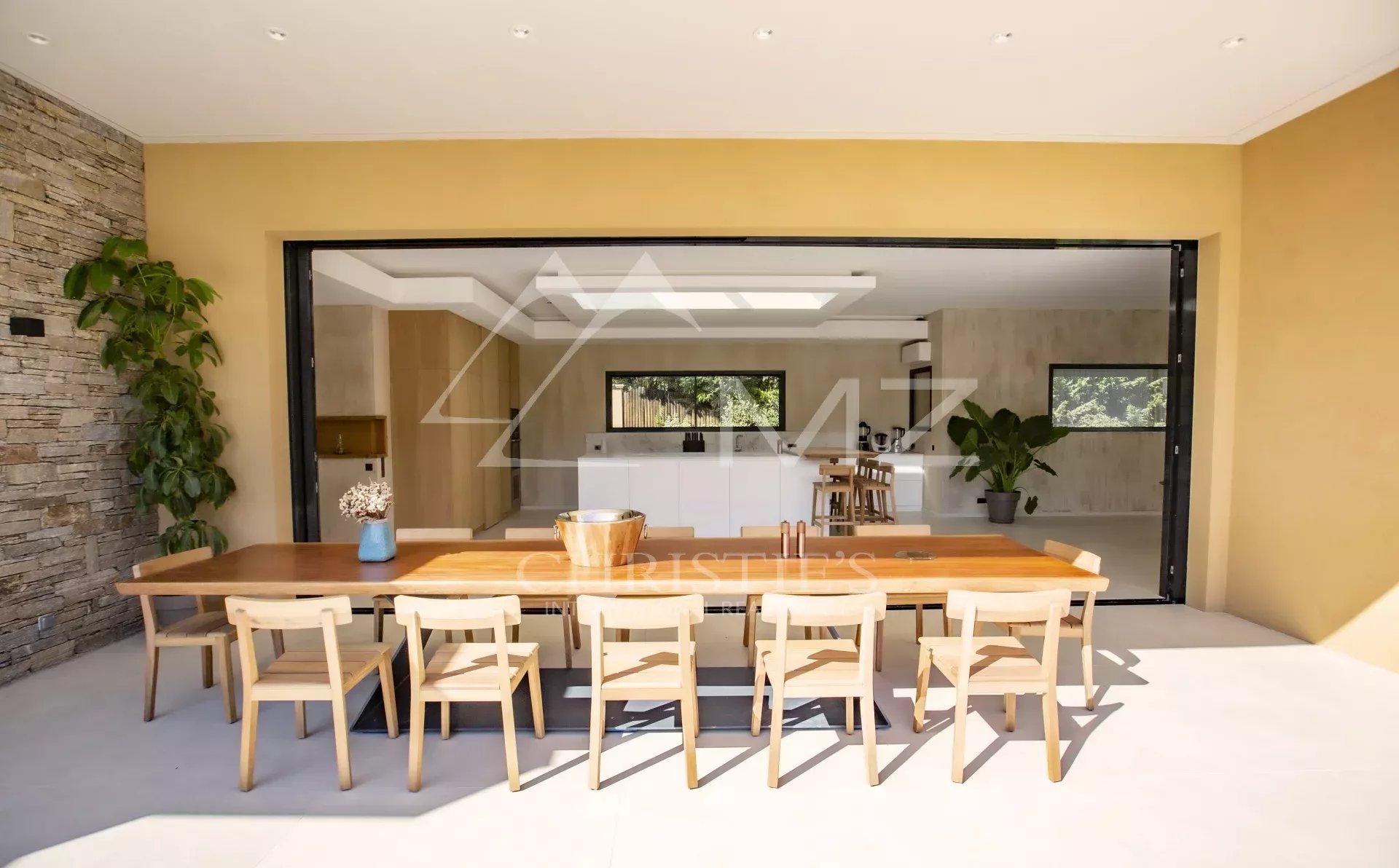 Very refined Californian-style villa, ideally located 8 minutes walk from the beaches of Pampelonne, offers generous volumes and consists of a contemporary living room with its fireplace opening onto the garden, a dining room, a kitchen also open to the sheltered terrace, 6 en-suite bedrooms including one in an independent apartment.