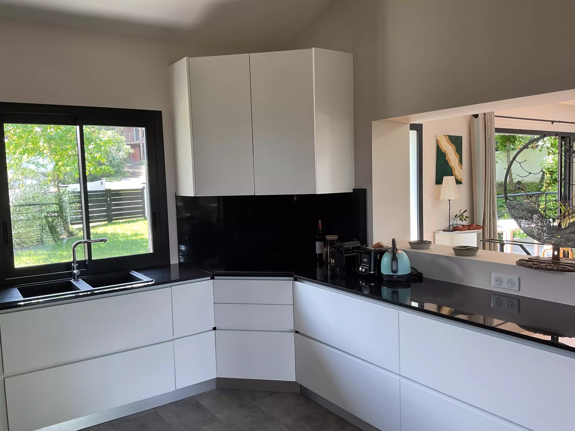 _ a huge living room with fully equipped open kitchen, dining area and lounge area.