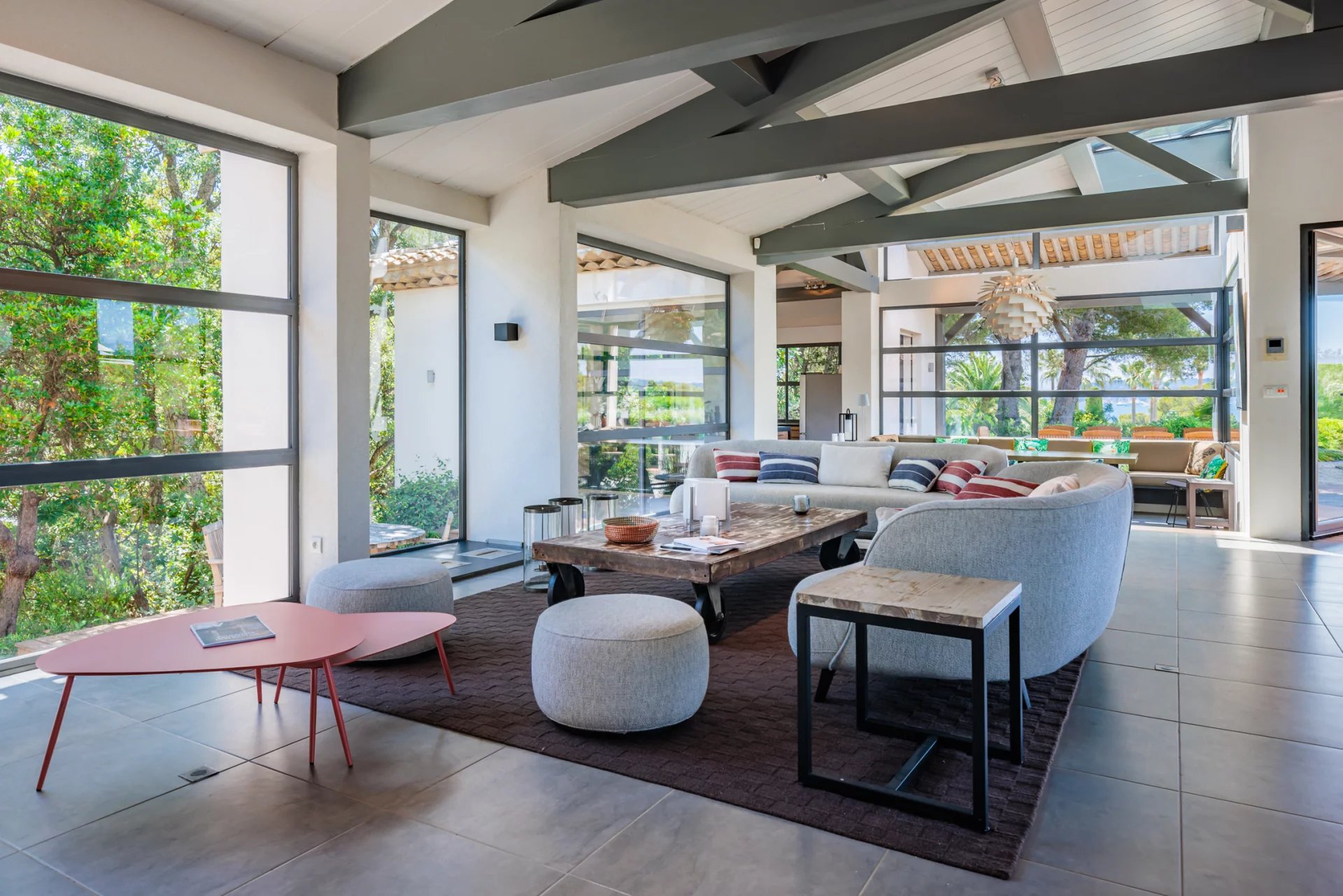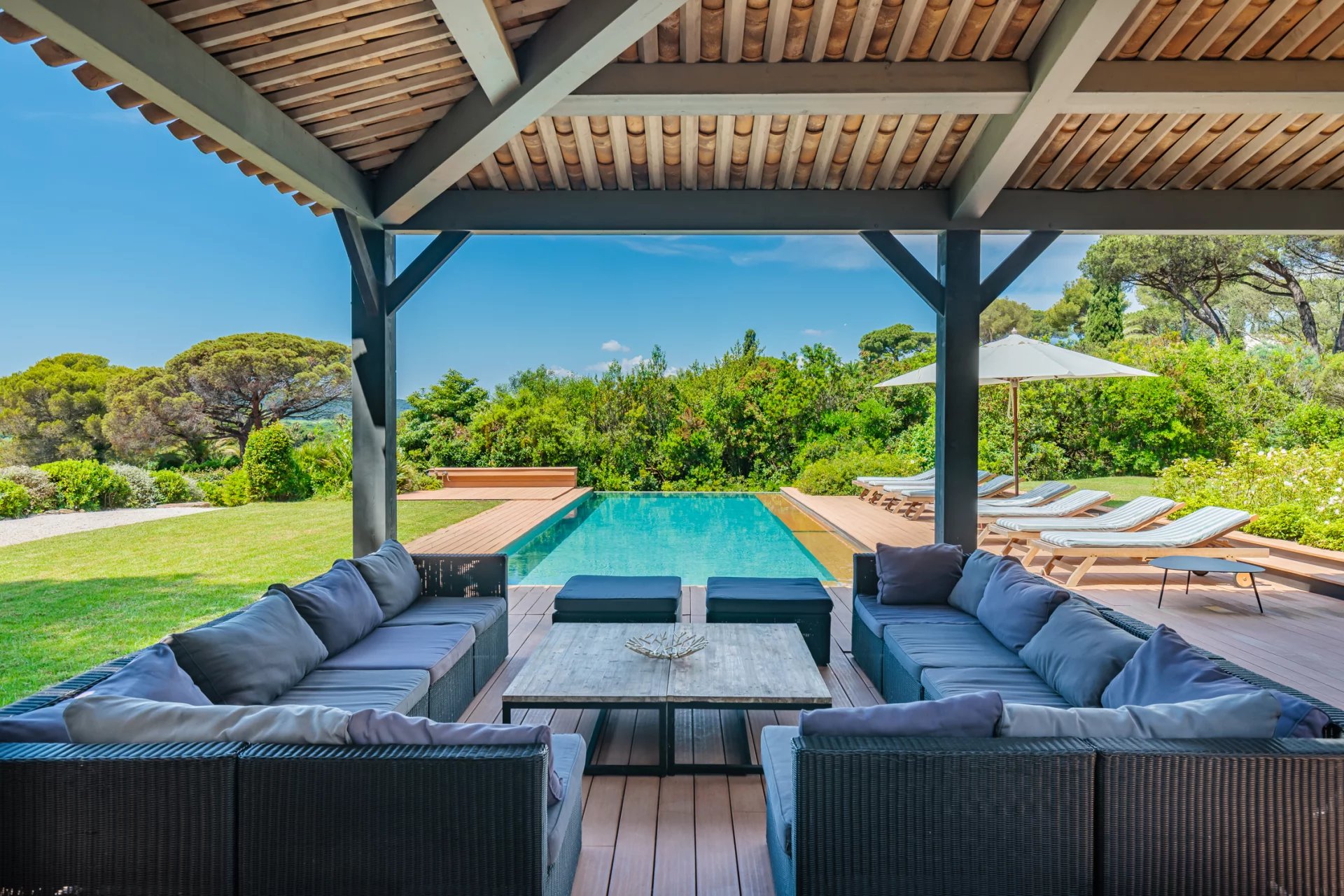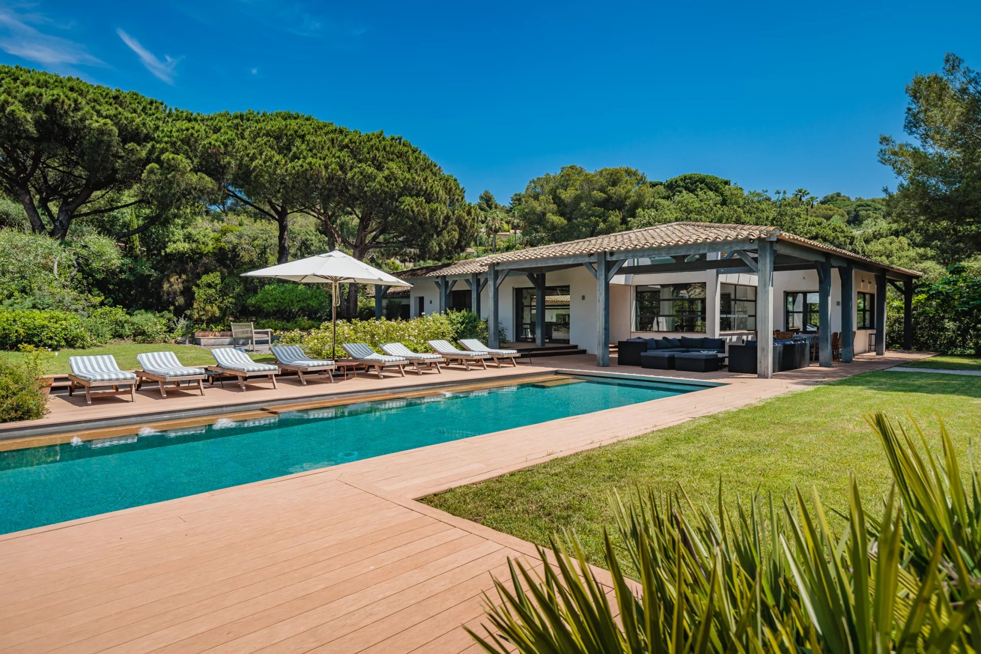 This charming modern villa, ideally located in a quiet and gated domain, has direct access to the beaches of Pampelonne and a lovely waterfront terrace.