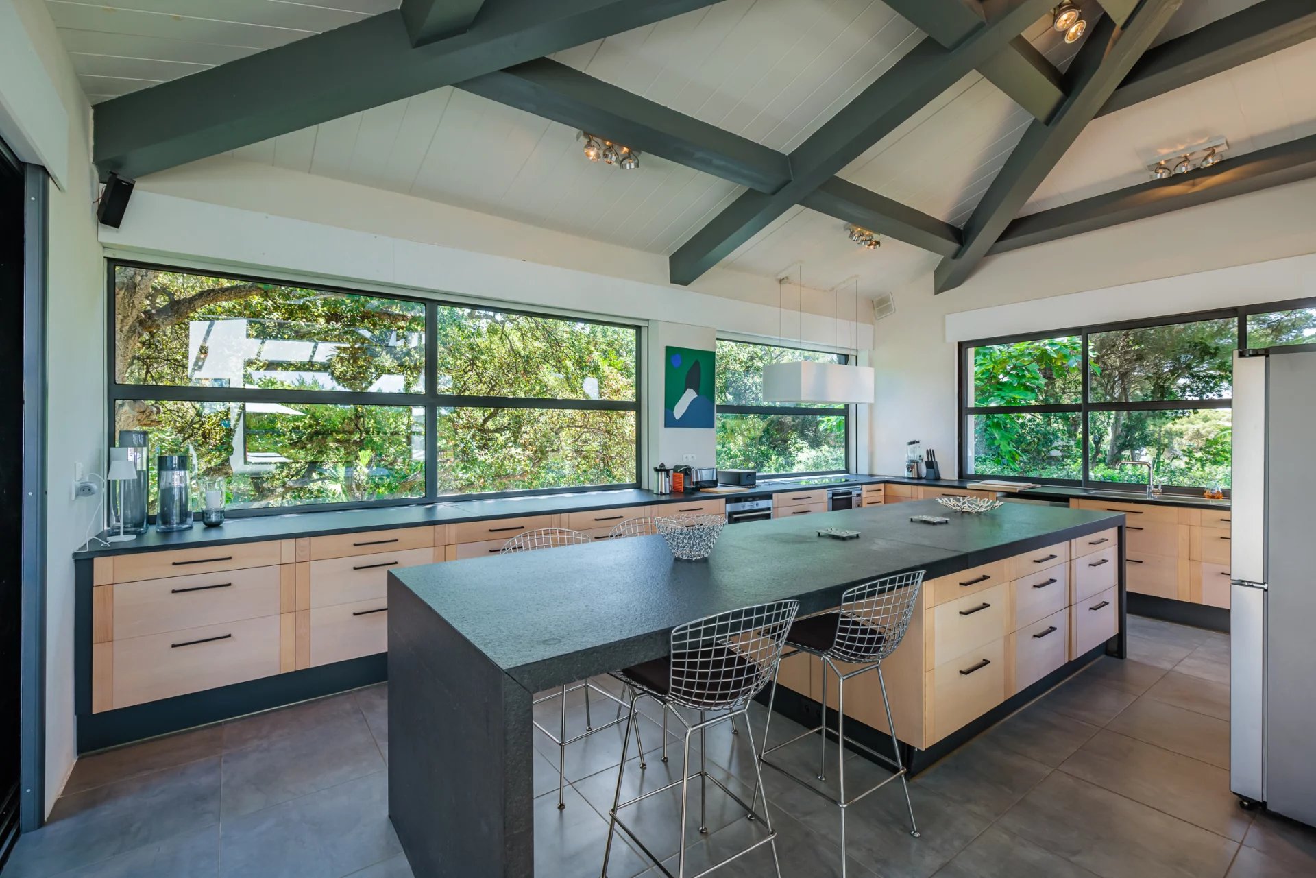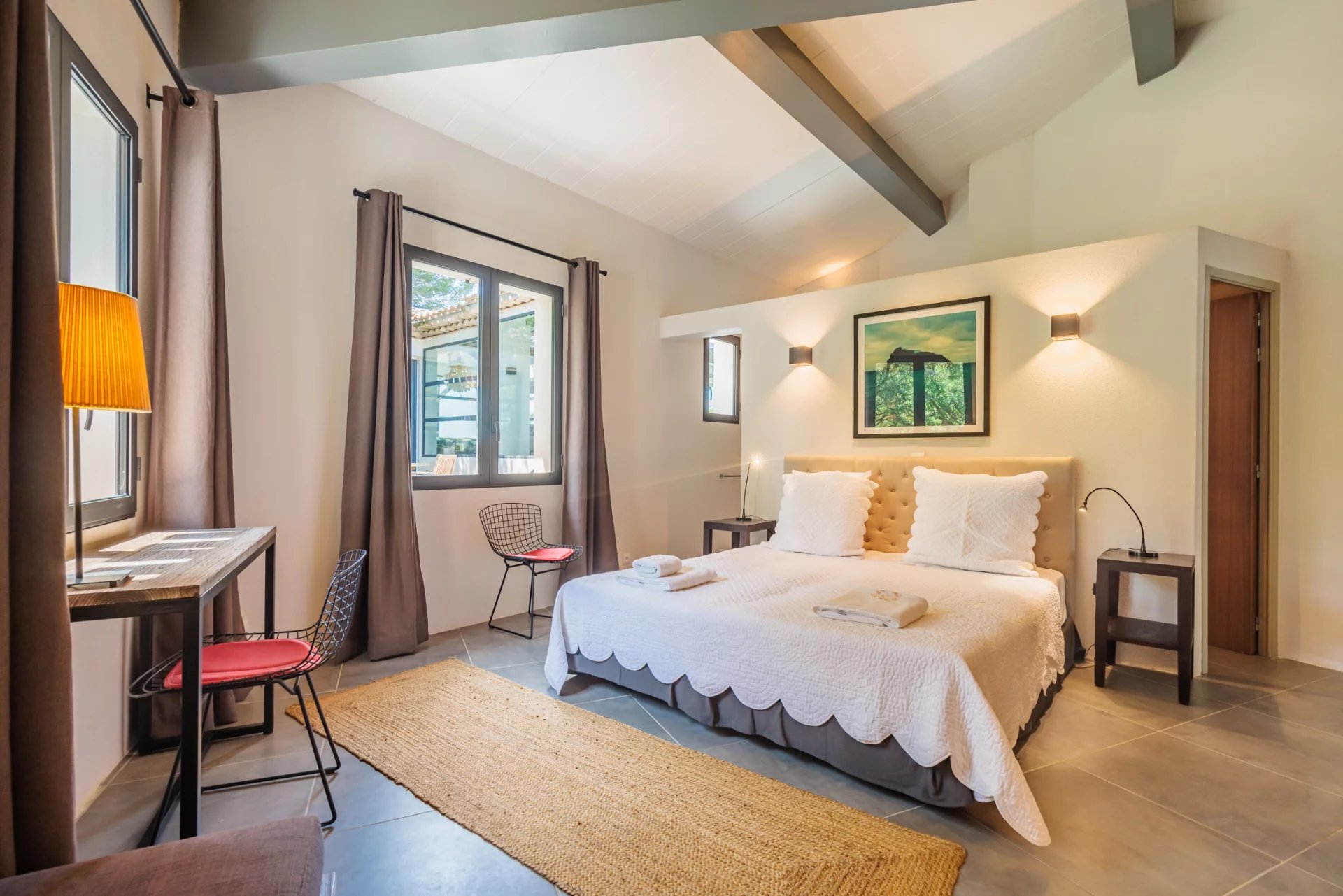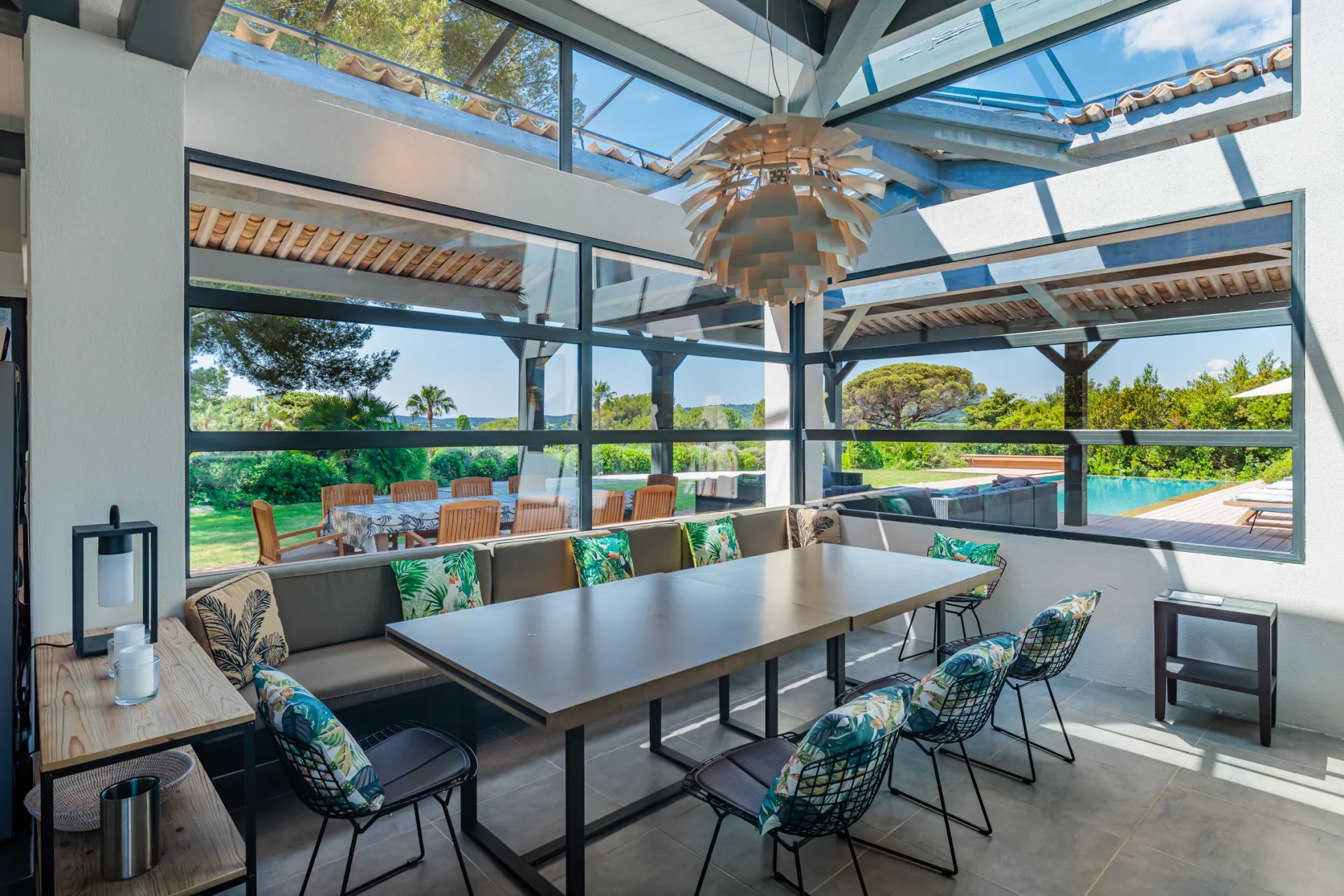 This charming modern villa, ideally located in a quiet and gated domain, has direct access to the beaches of Pampelonne and a lovely waterfront terrace.