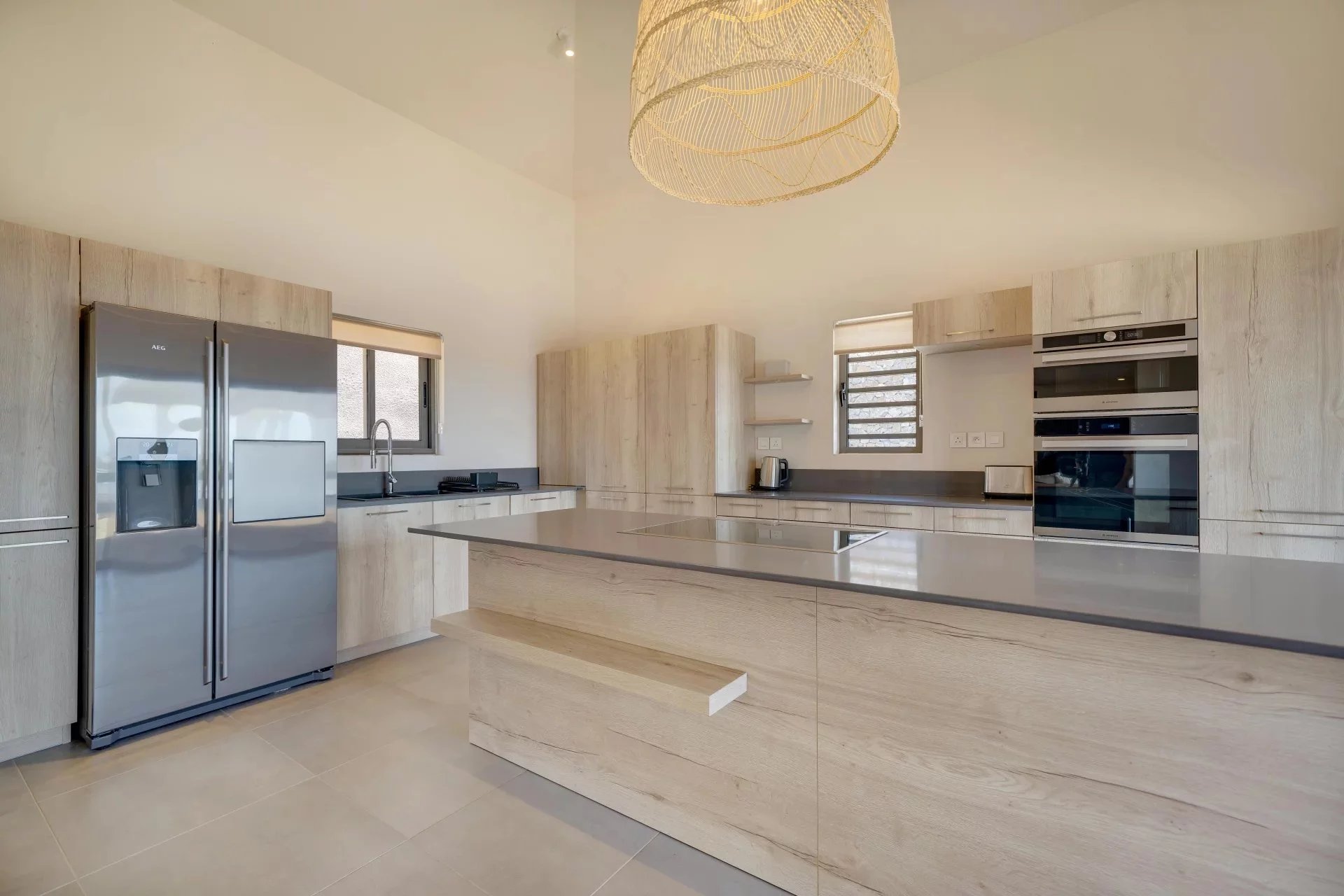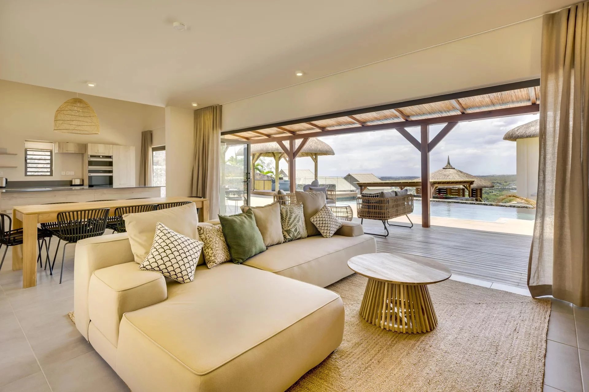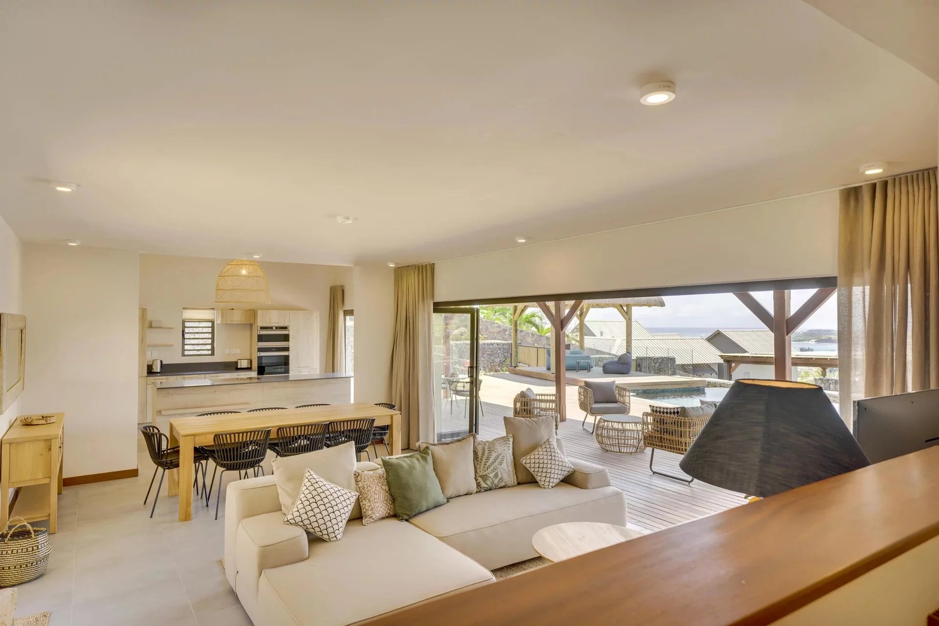 This stunning 4-bedroom villa, located on the heights of La Tourelle, combines elegance and authenticity. Inspired by African lodge style, it offers an exceptional 180° view of the sea, mountains, and Tamarin Bay.