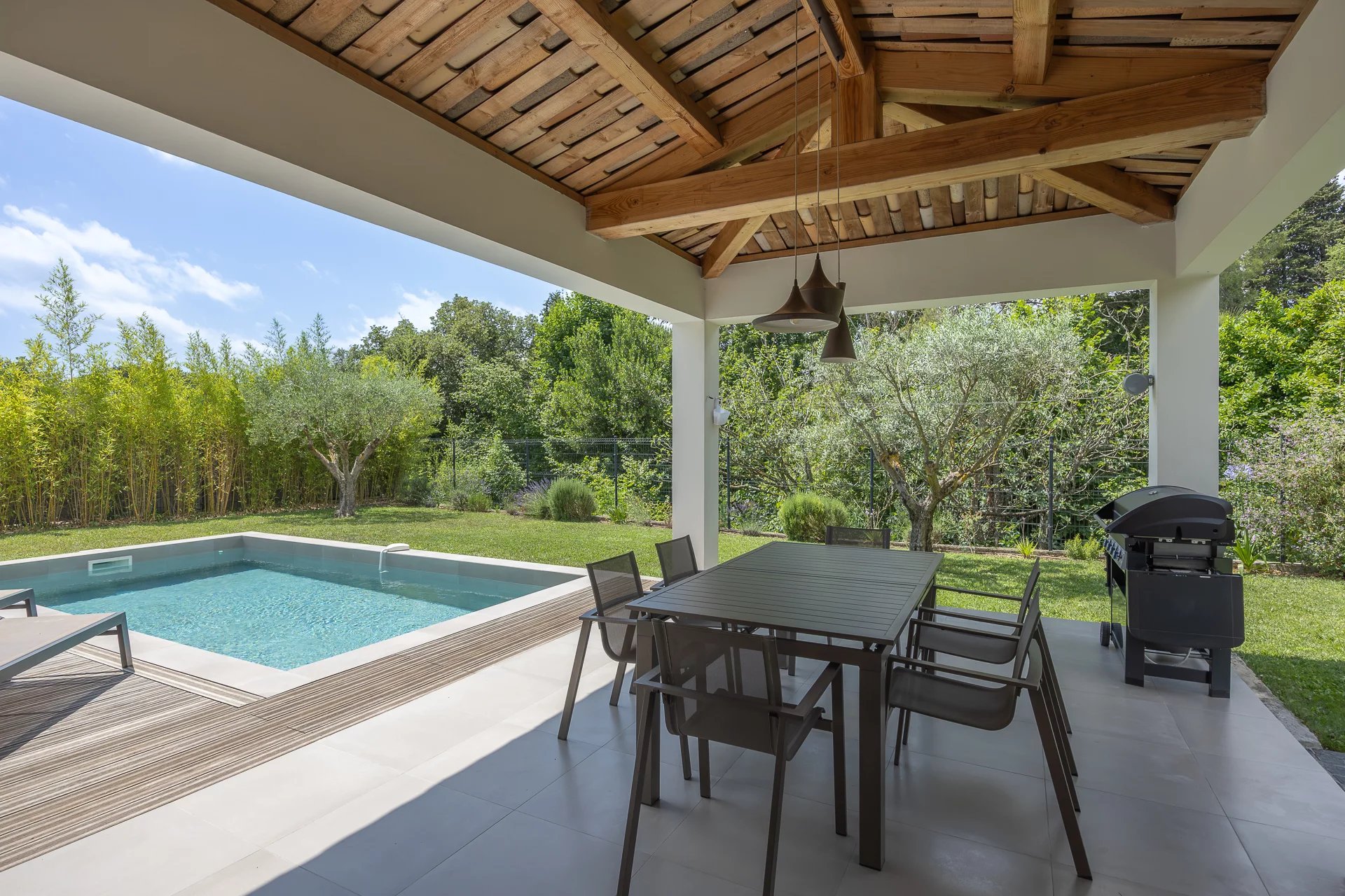 A covered terrace is perfect for spending quality time with family and friends, and the saltwater pool offers a refreshing escape during hot summer days.