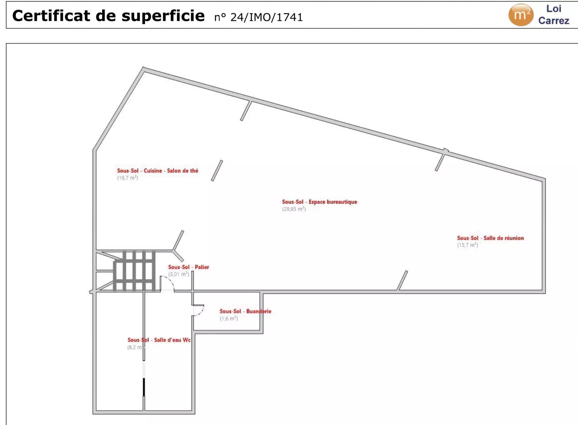 L’étage inférieur est notamment composé d’un vaste bureau, d’une salle de réunion, d’une cuisine ouverte avec son espace restauration, d’une buanderie et d’une salle d’eau avec WC.