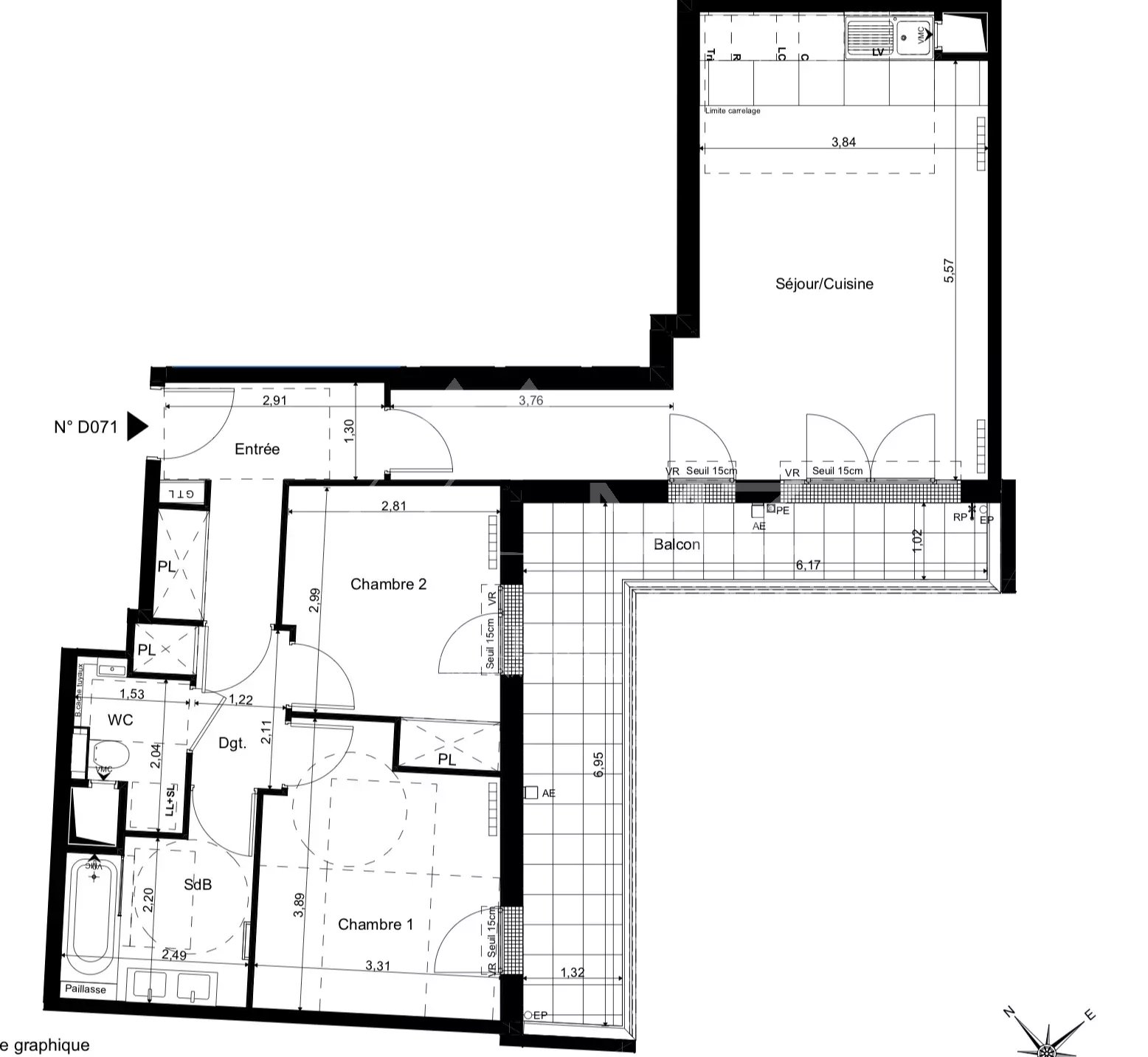 L'appartement comprend une entrée, une grande salle de séjour ouverte sur la cuisine, 2 chambres, une salle de bain, un grand balcon donnant sur le séjour et les chambres.