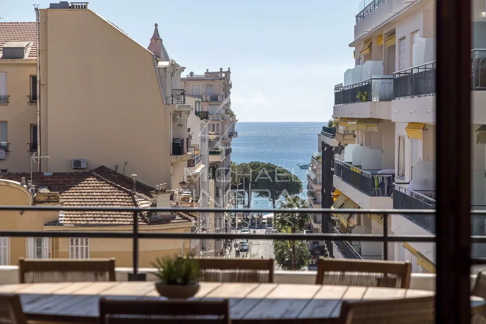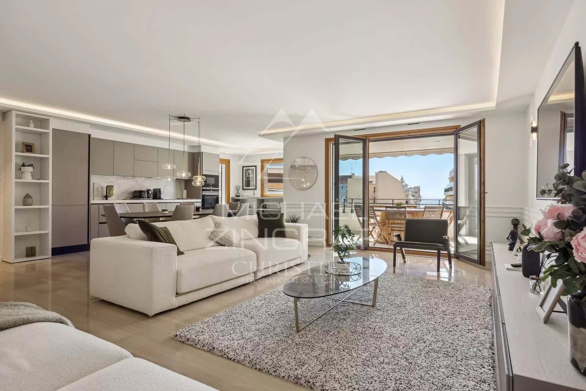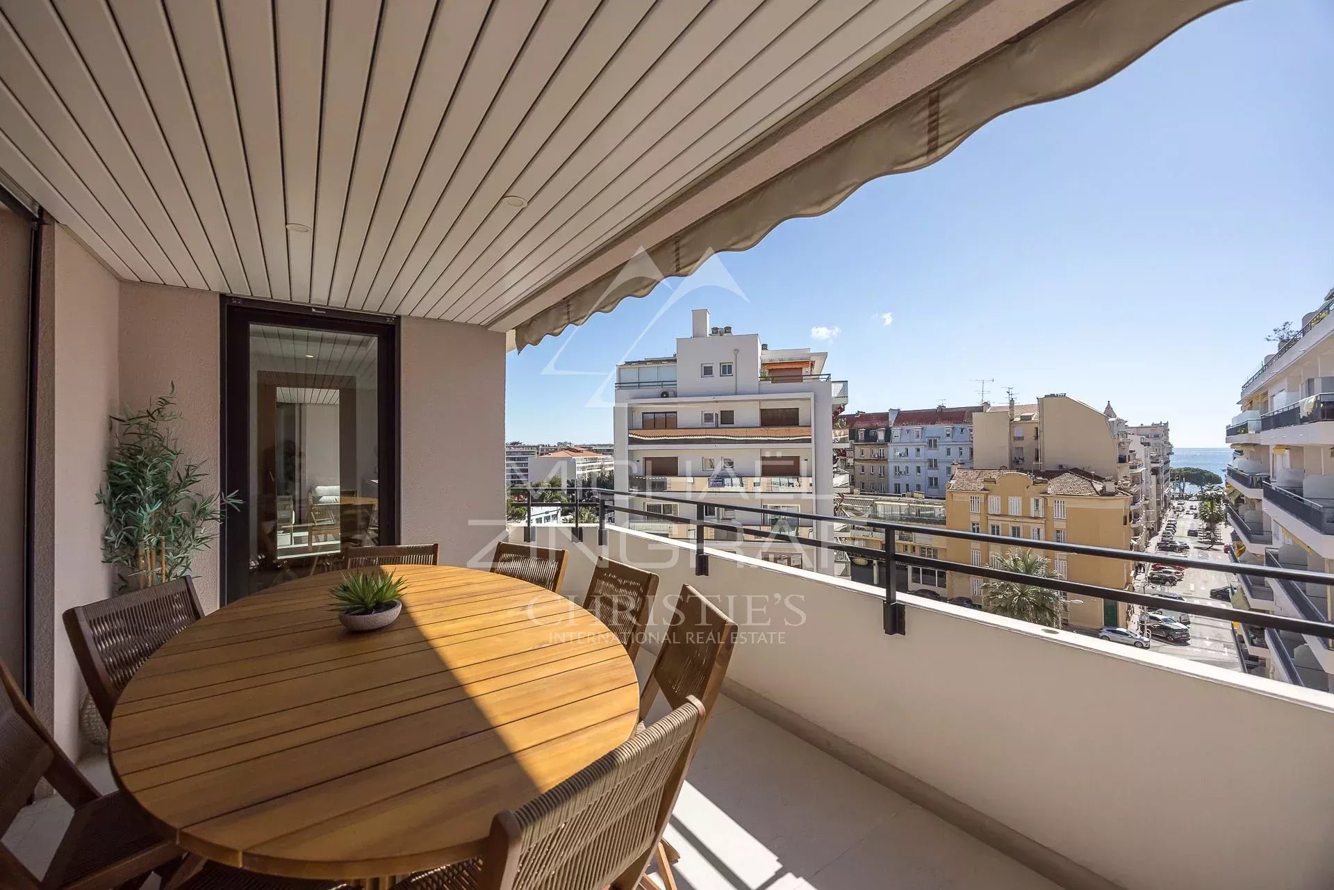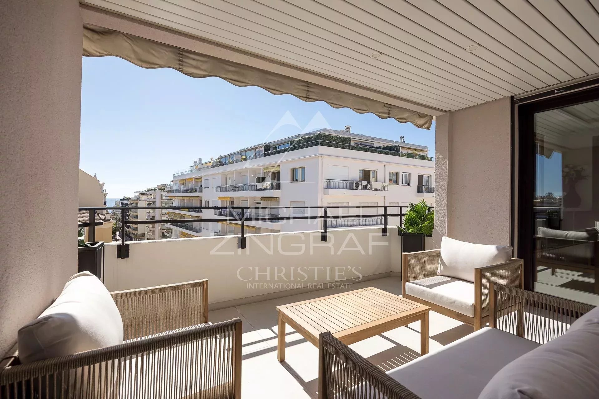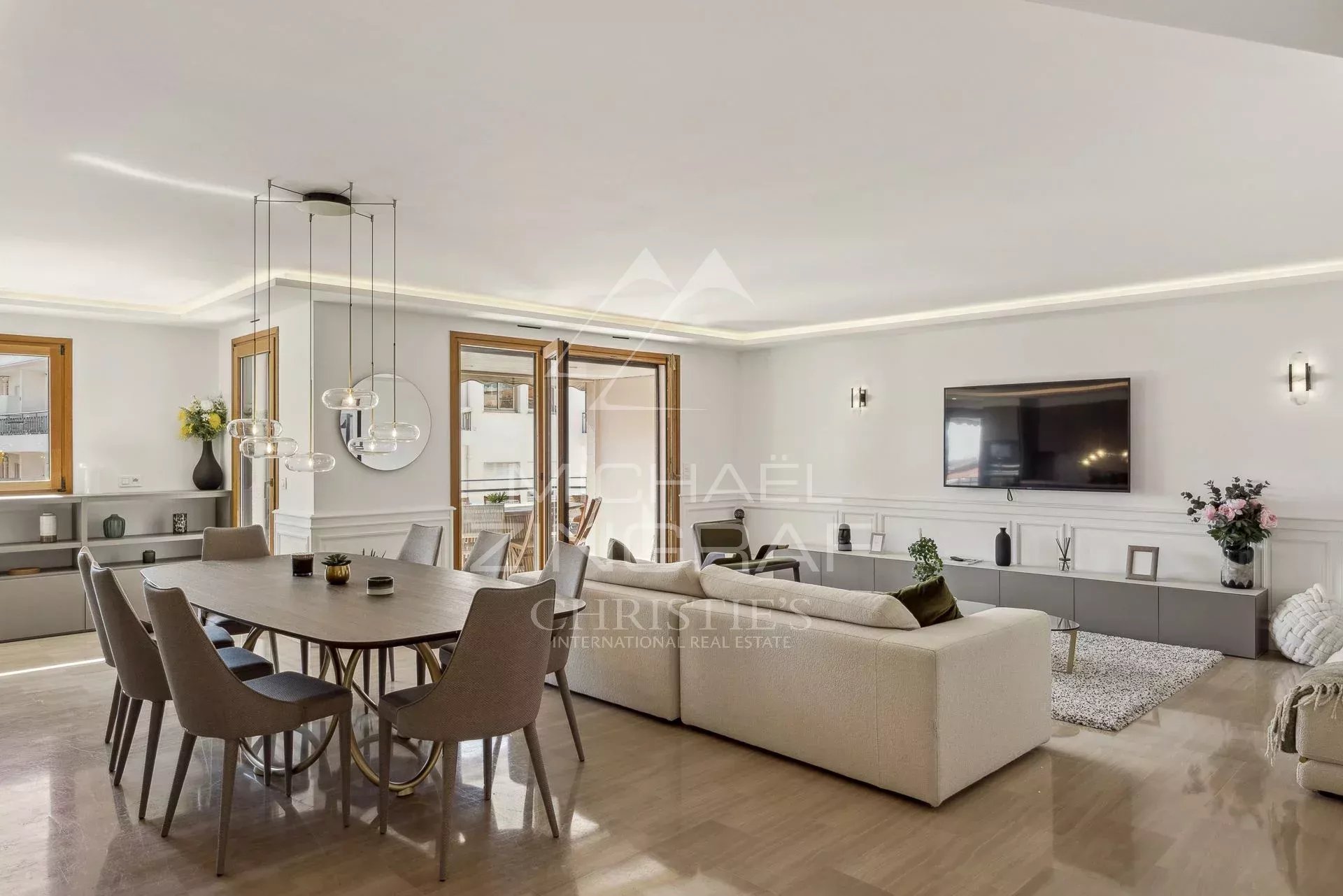 Idéalement situé proche de la Croisette, très bel appartement d'environ 134m², comprenant: une spacieuse entrée, séjour avec cuisine entièrement équipée, salle à manger, 4 chambres en suite dont deux en duplex. Coup de cœur assuré.