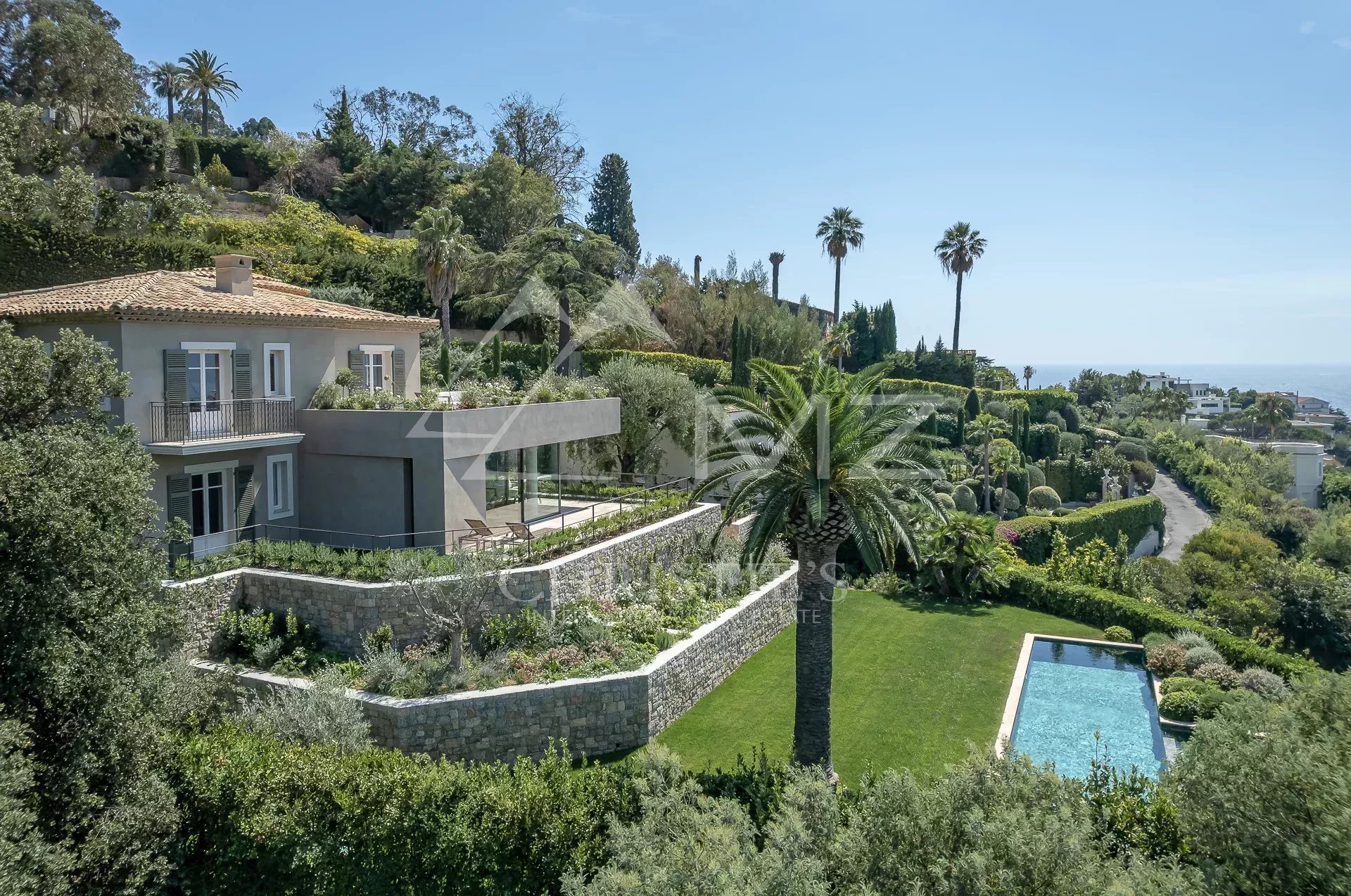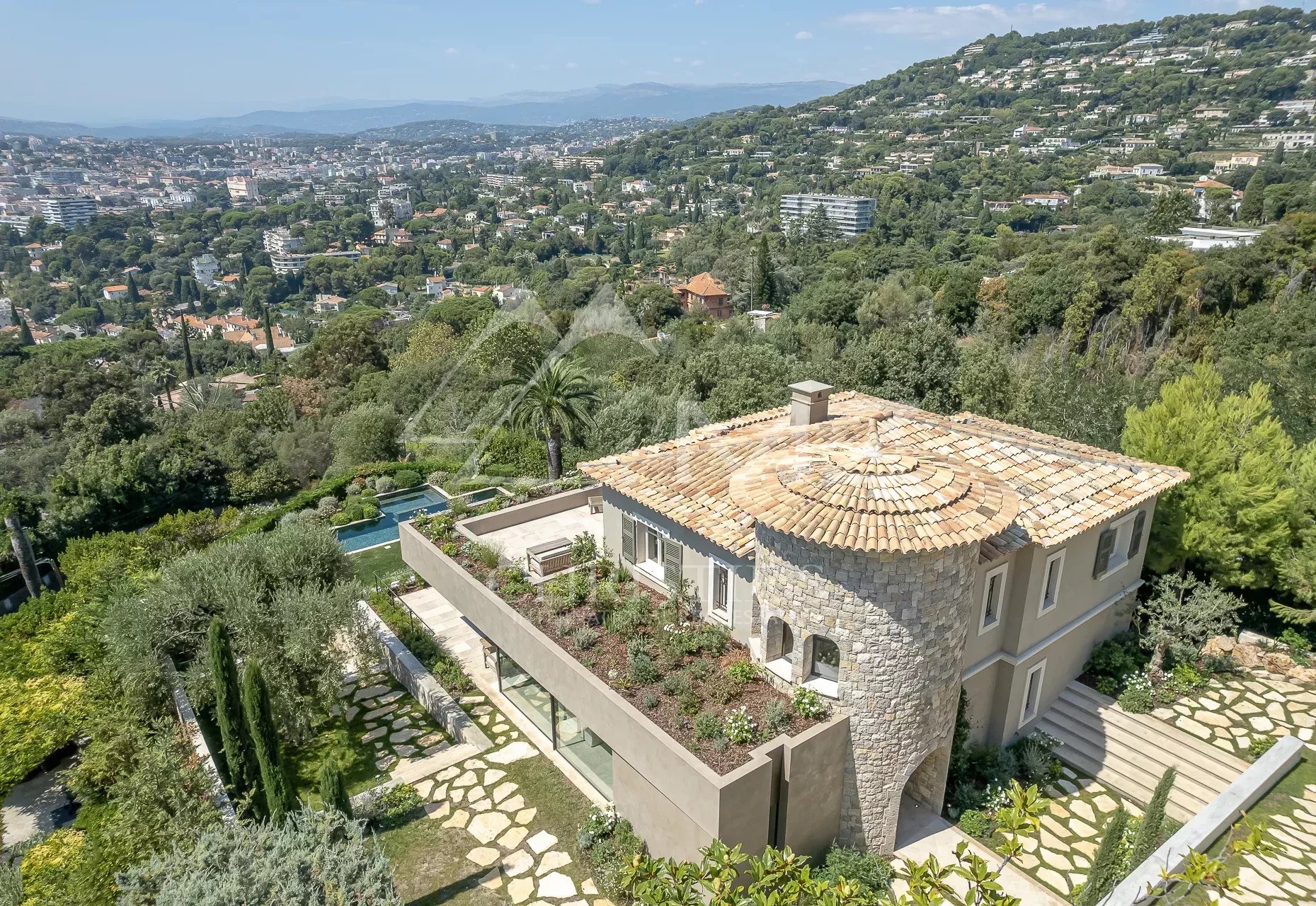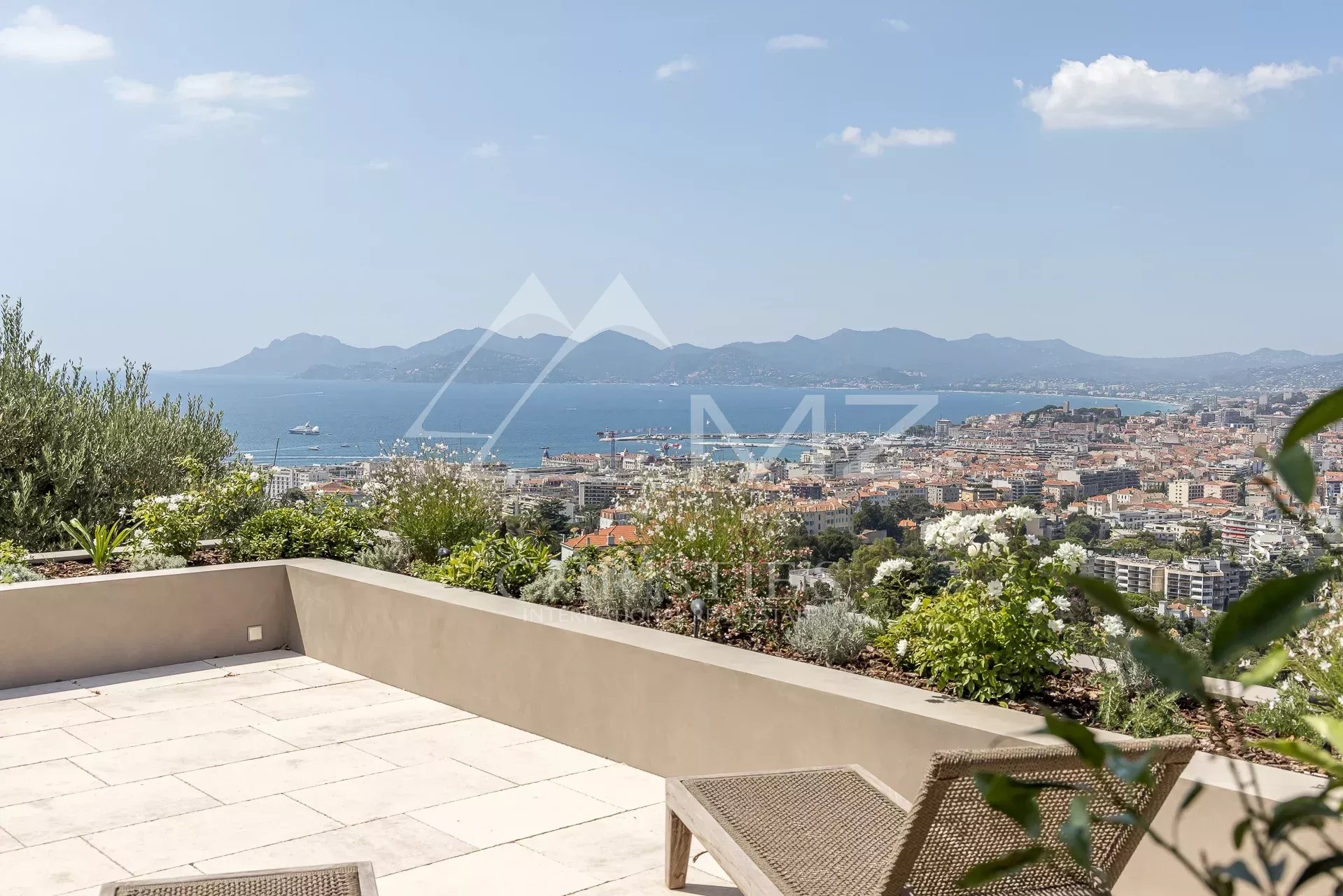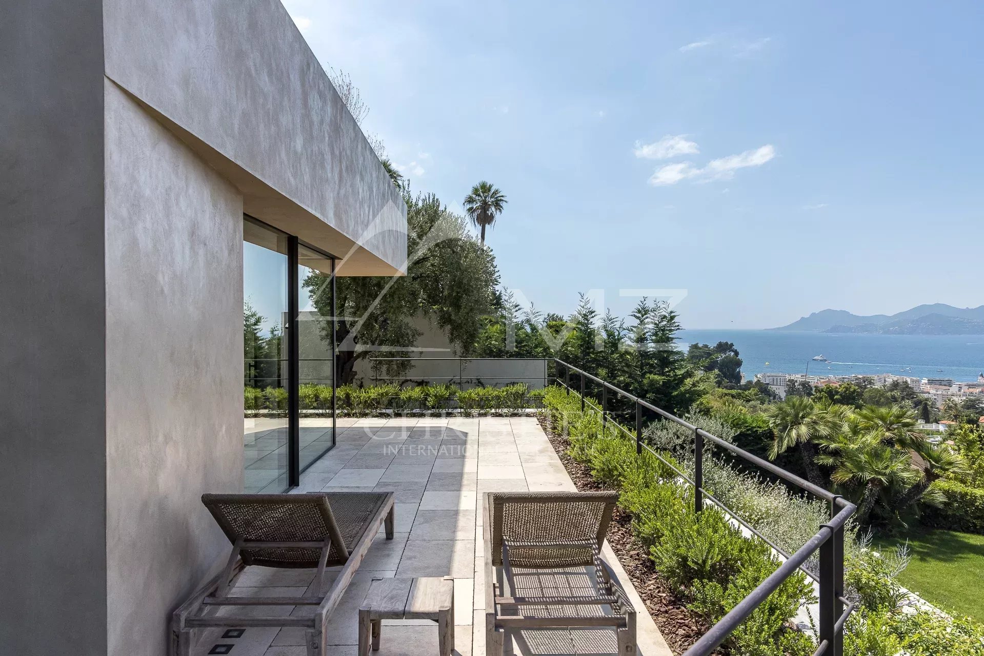 Rare, à quelques minutes du centre ville de Cannes, au cœur d'un domaine fermé, en position dominante, exceptionnelle propriété contemporaine neuve à la décoration raffinée, de 411m² environ. Offrant une vue mer panoramique sur la rade de Cannes et l'Estérel, 5 chambres en suite, salon, salle à manger, cuisine, salle de sport. Terrain avec piscine entièrement paysager d'essences Méditerranéennes.