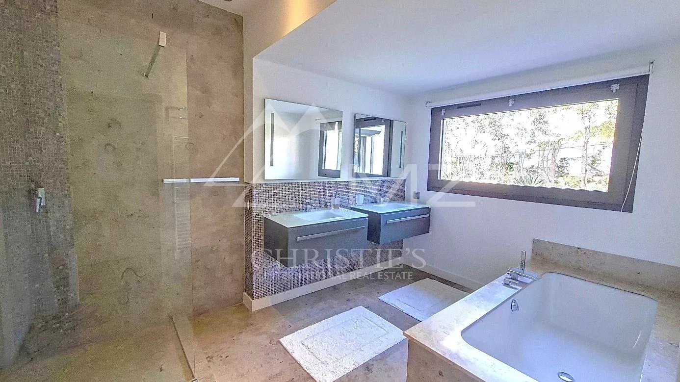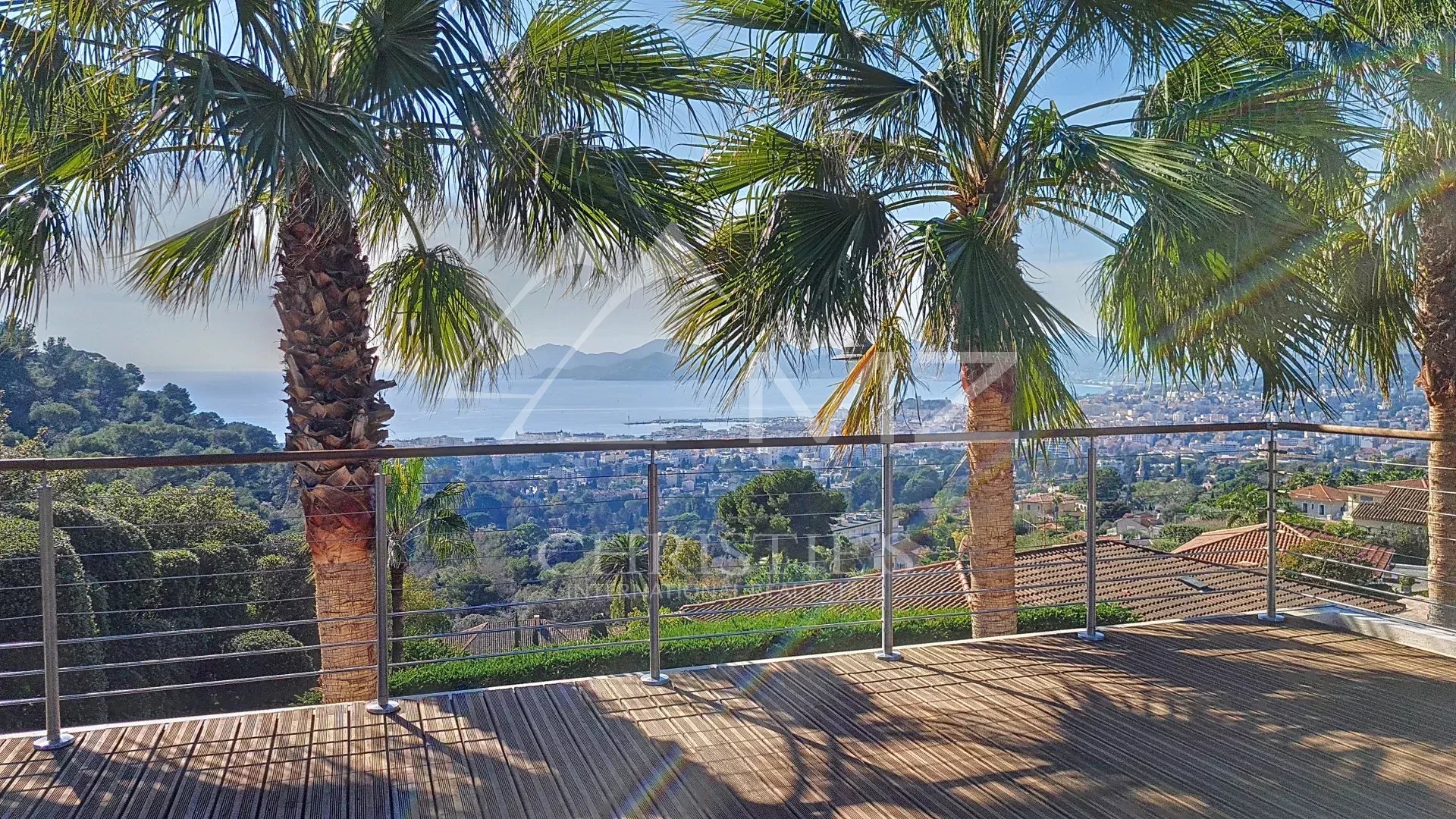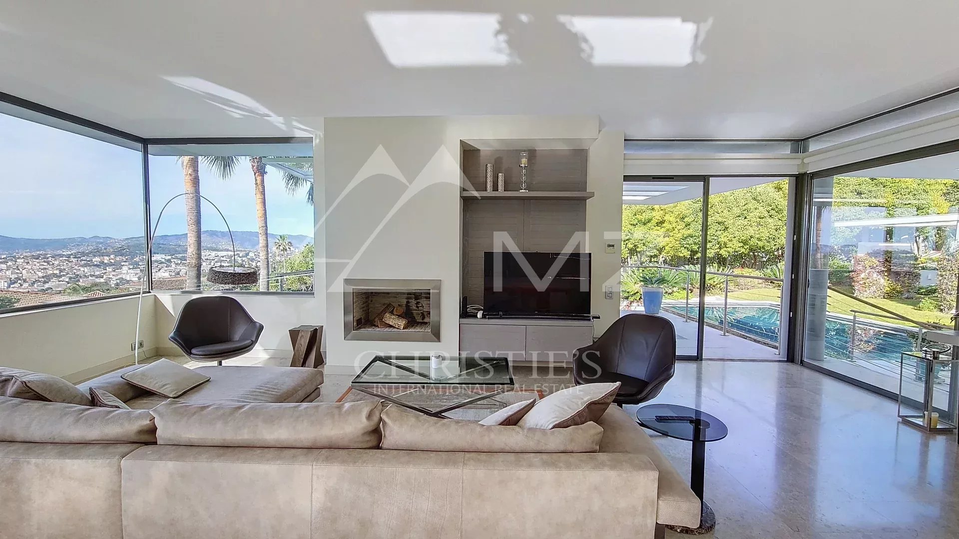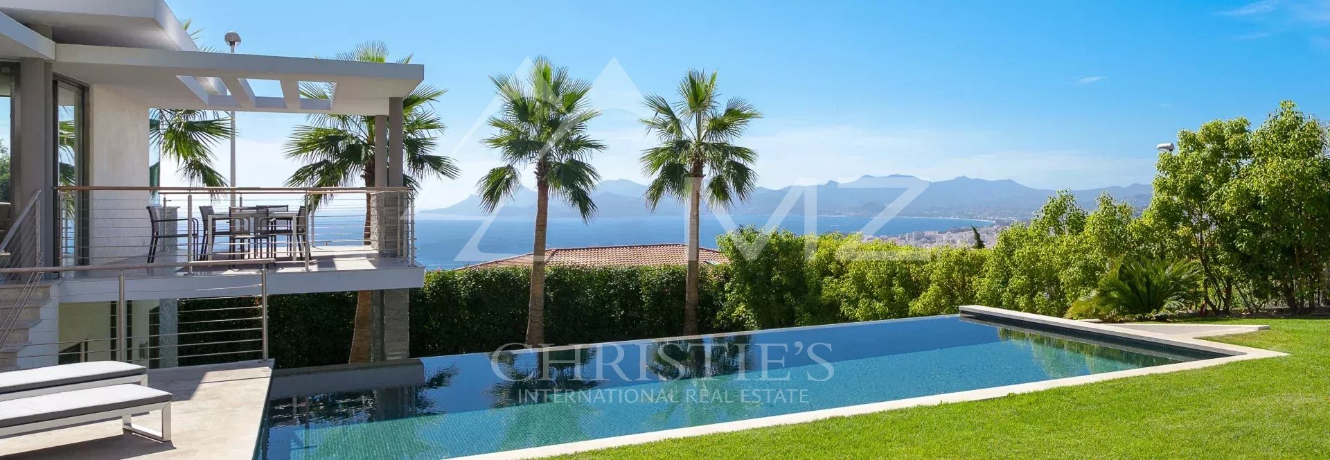 Cette lumineuse villa contemporaine idéalement située dans le secteur prestigieux de la Californie comprenant 4 chambres en-suite dont une suite parentale avec dressing bénéficie d'une vue mer panoramique exceptionnelle sur la baie de Cannes et l'Estérel.