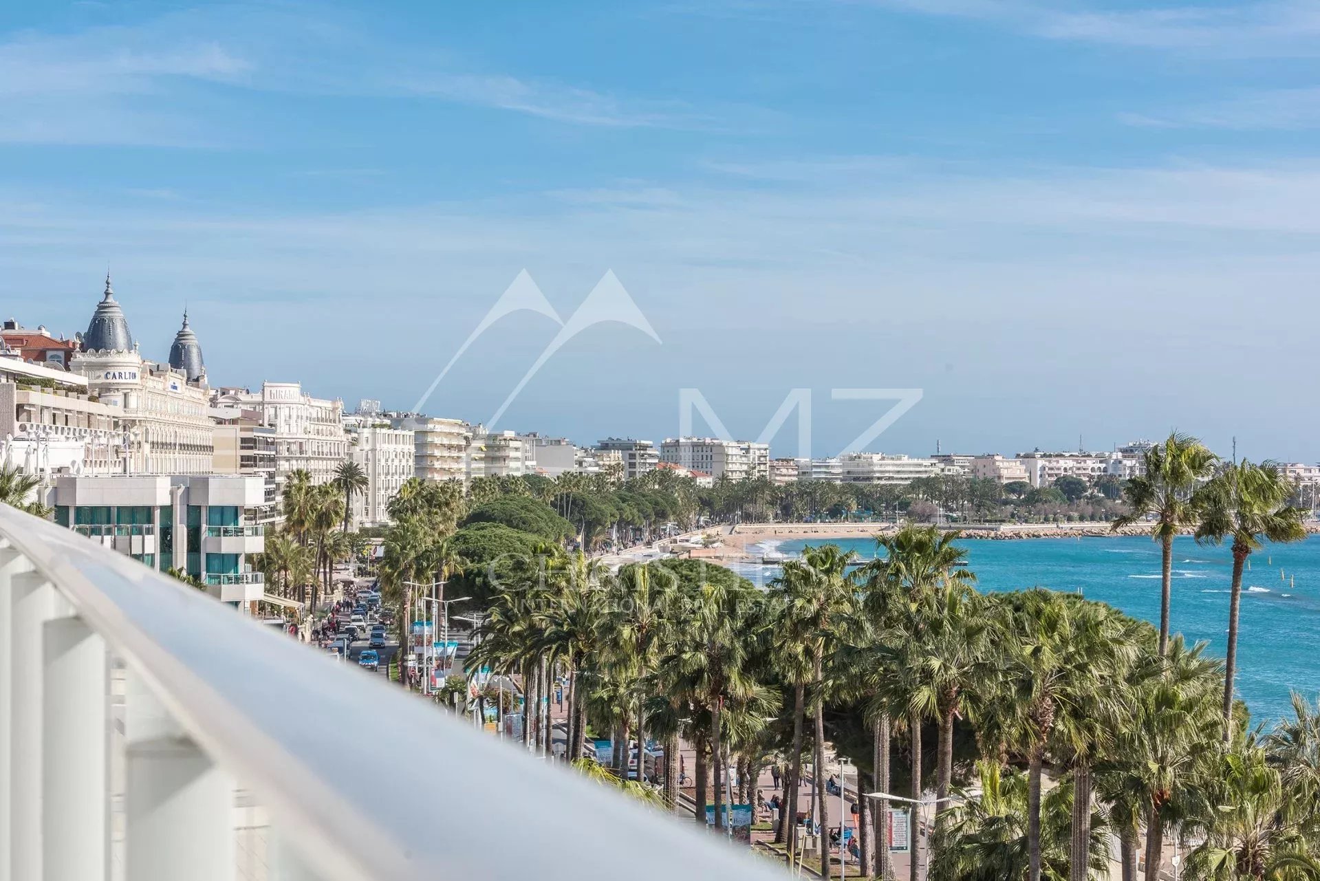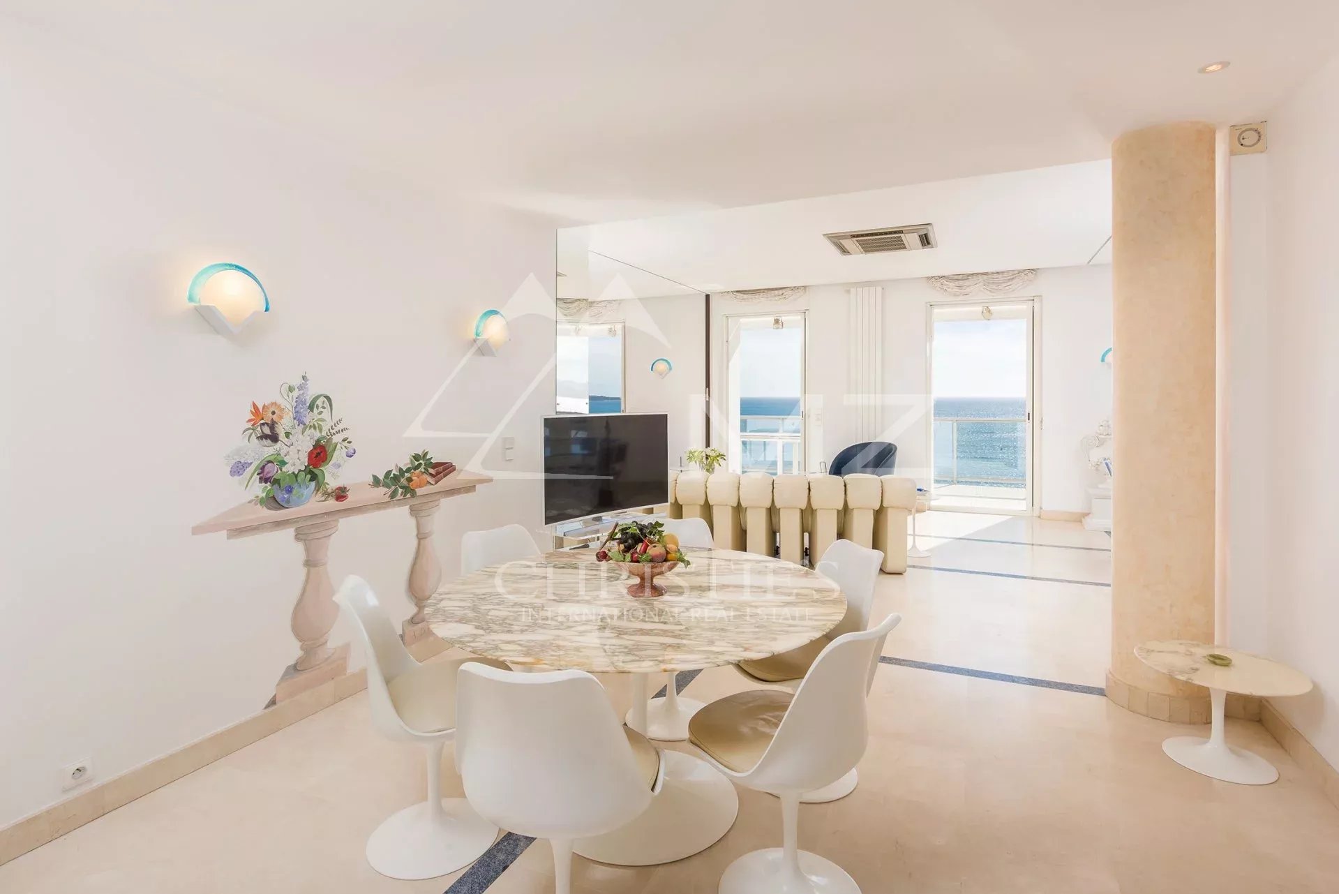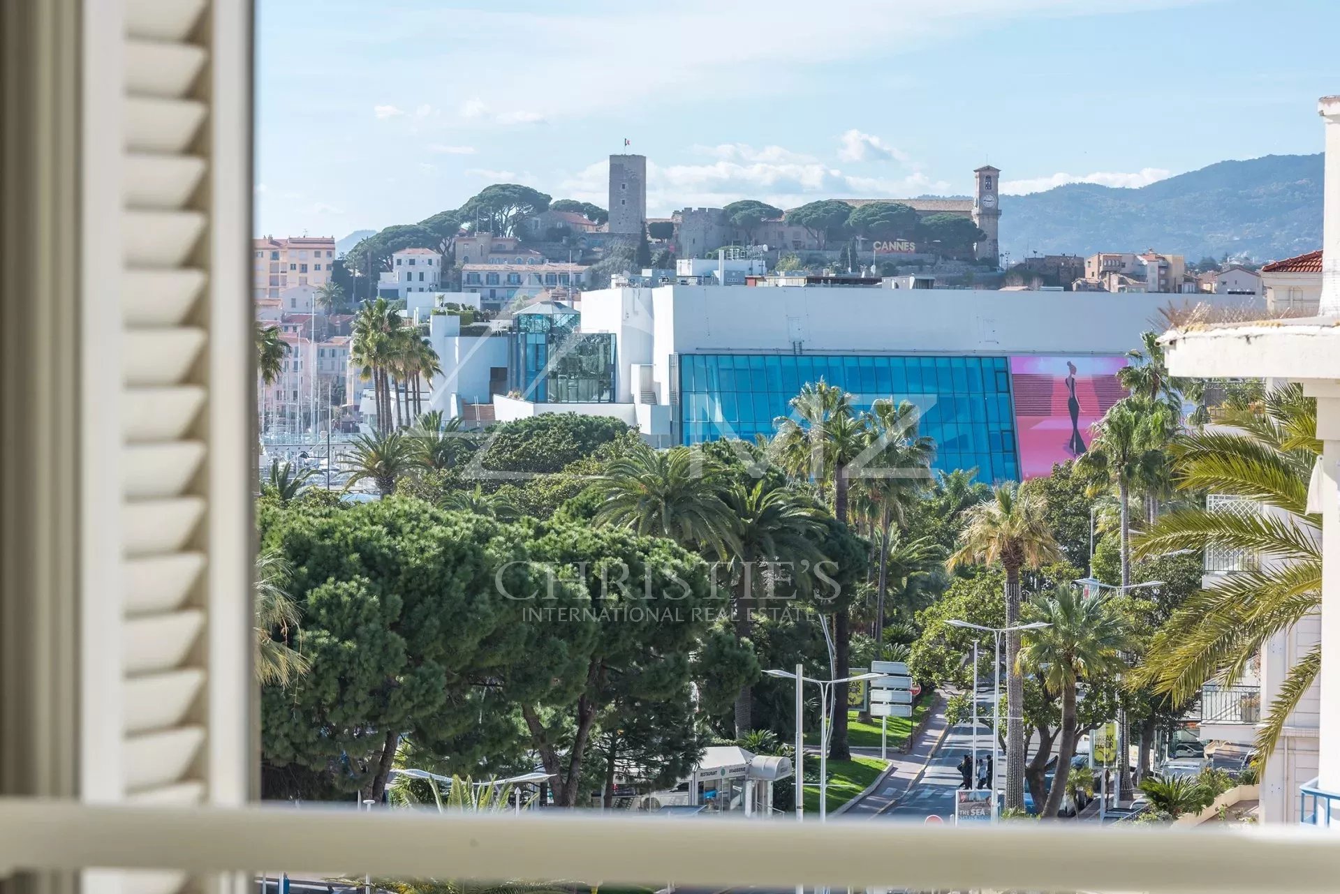 Idéalement situé et à pied du Palais des Festivals, cet appartement d'environ 200 m², avec vue mer et grande terrasse, comprend : un double séjour avec accès terrasse, une cuisine équipée, une salle à manger, deux chambres en suite avec salles d'eau, une chambre de maître avec salle de bains, une salle de bains indépendante, un studio équipé d'une cuisine, d'un lit double et d'une salle d'eau. Prestations de qualité.