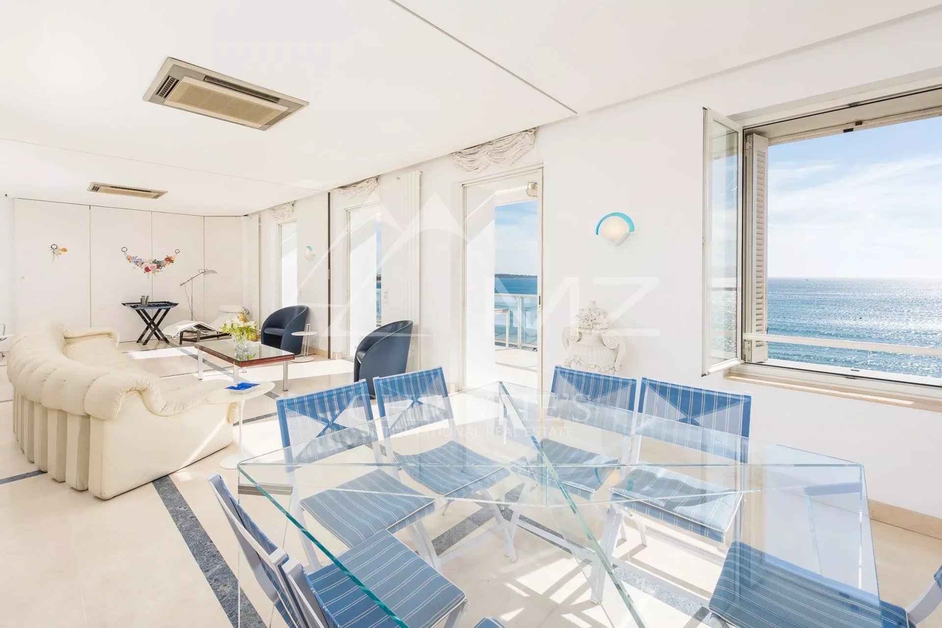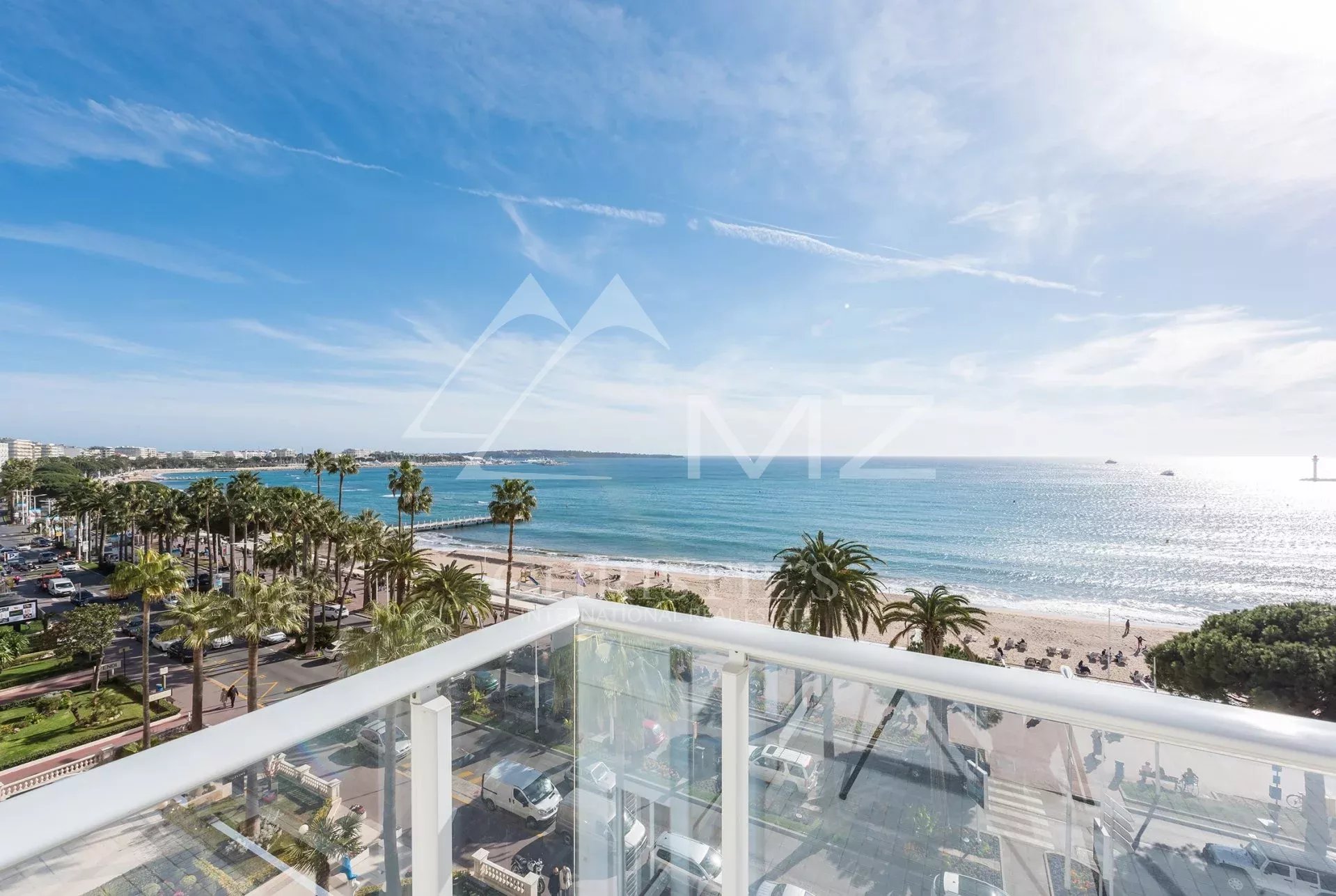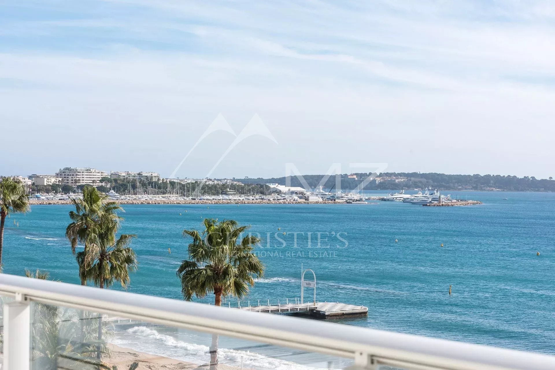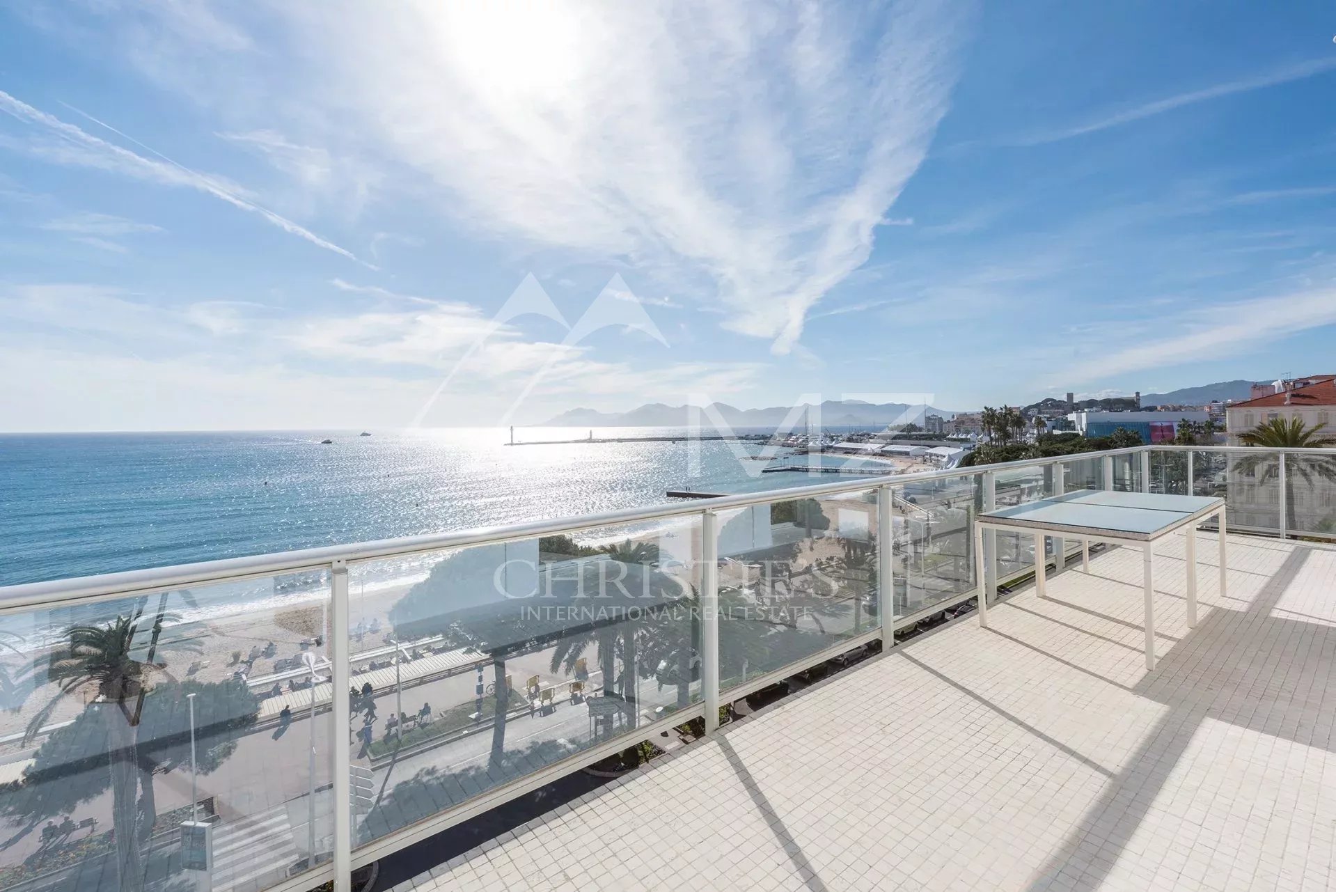 Idéalement situé et à pied du Palais des Festivals, cet appartement d'environ 200 m², avec vue mer et grande terrasse, comprend : un double séjour avec accès terrasse, une cuisine équipée, une salle à manger, deux chambres en suite avec salles d'eau, une chambre de maître avec salle de bains, une salle de bains indépendante, un studio équipé d'une cuisine, d'un lit double et d'une salle d'eau. Prestations de qualité.