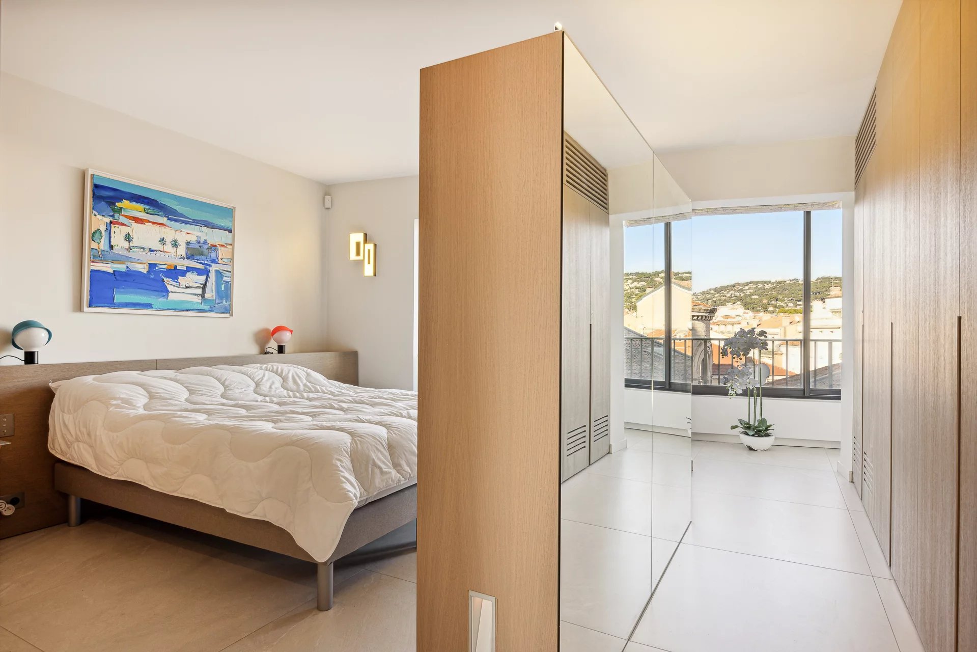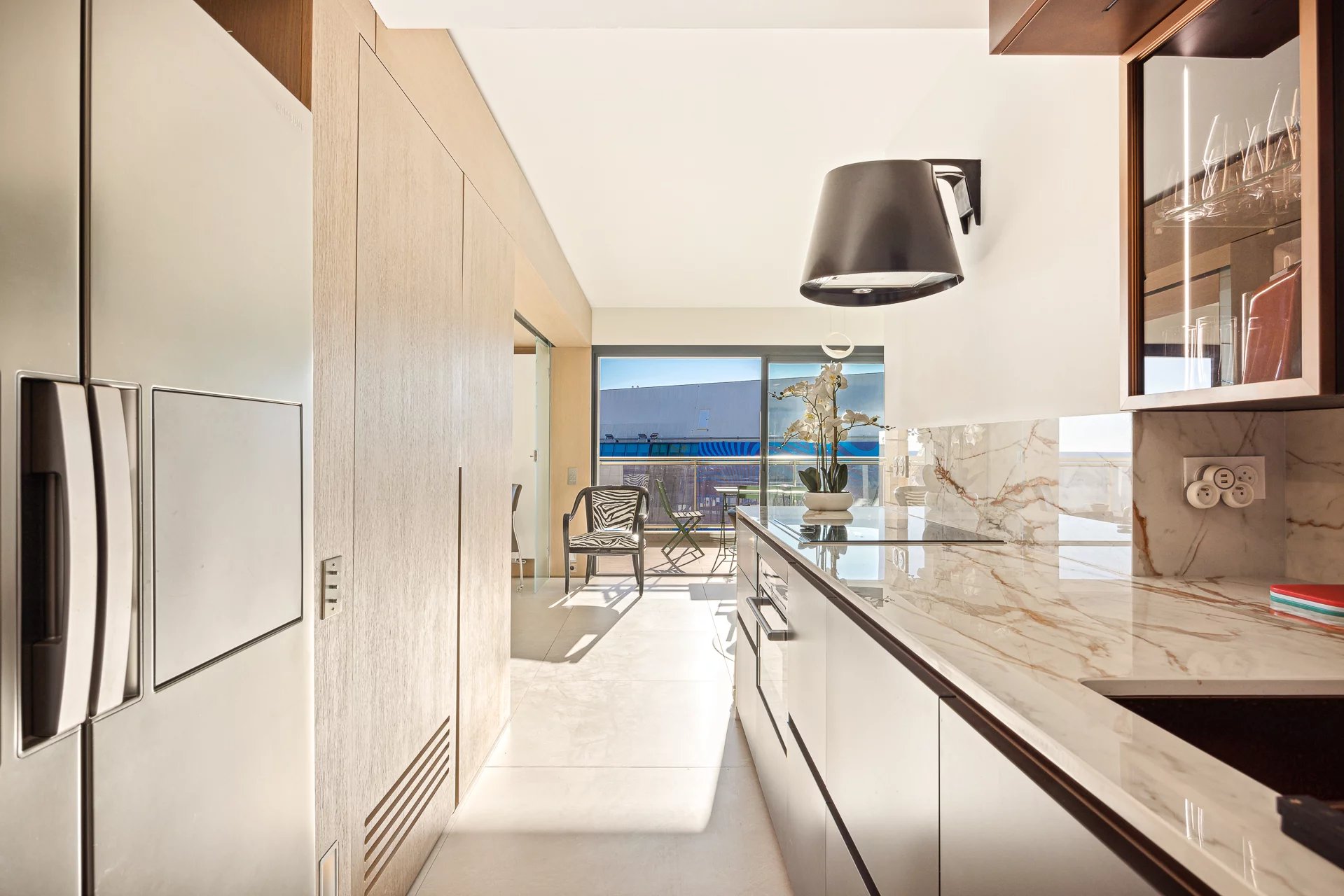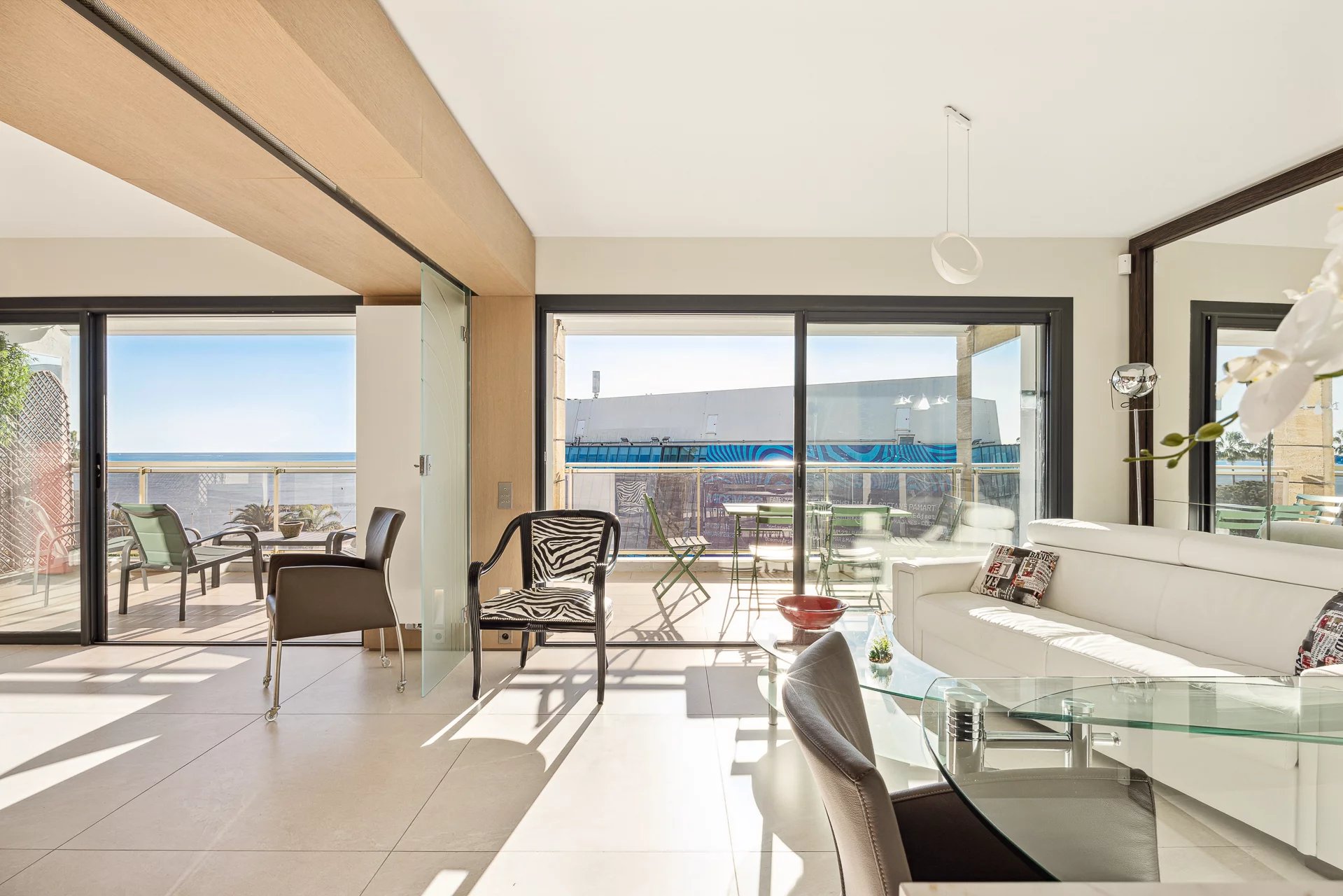 Dans la plus belle rue de Cannes, appartement d’environ 72 m2, comprenant : une cuisine ouverte équipée, un séjour, salon/, une chambre, une salle de douche, une chambre de maitre en suite avec salle de douche. Buanderie. Terrasse face au Palais des festivals. Un box.