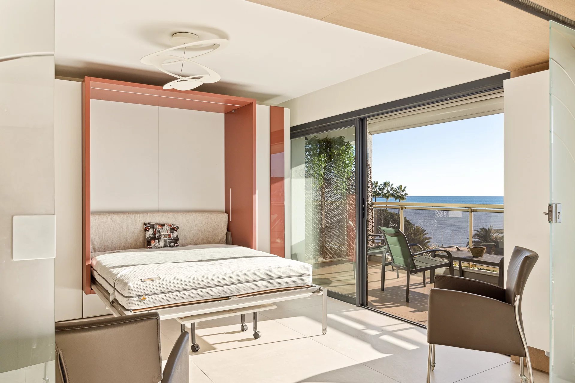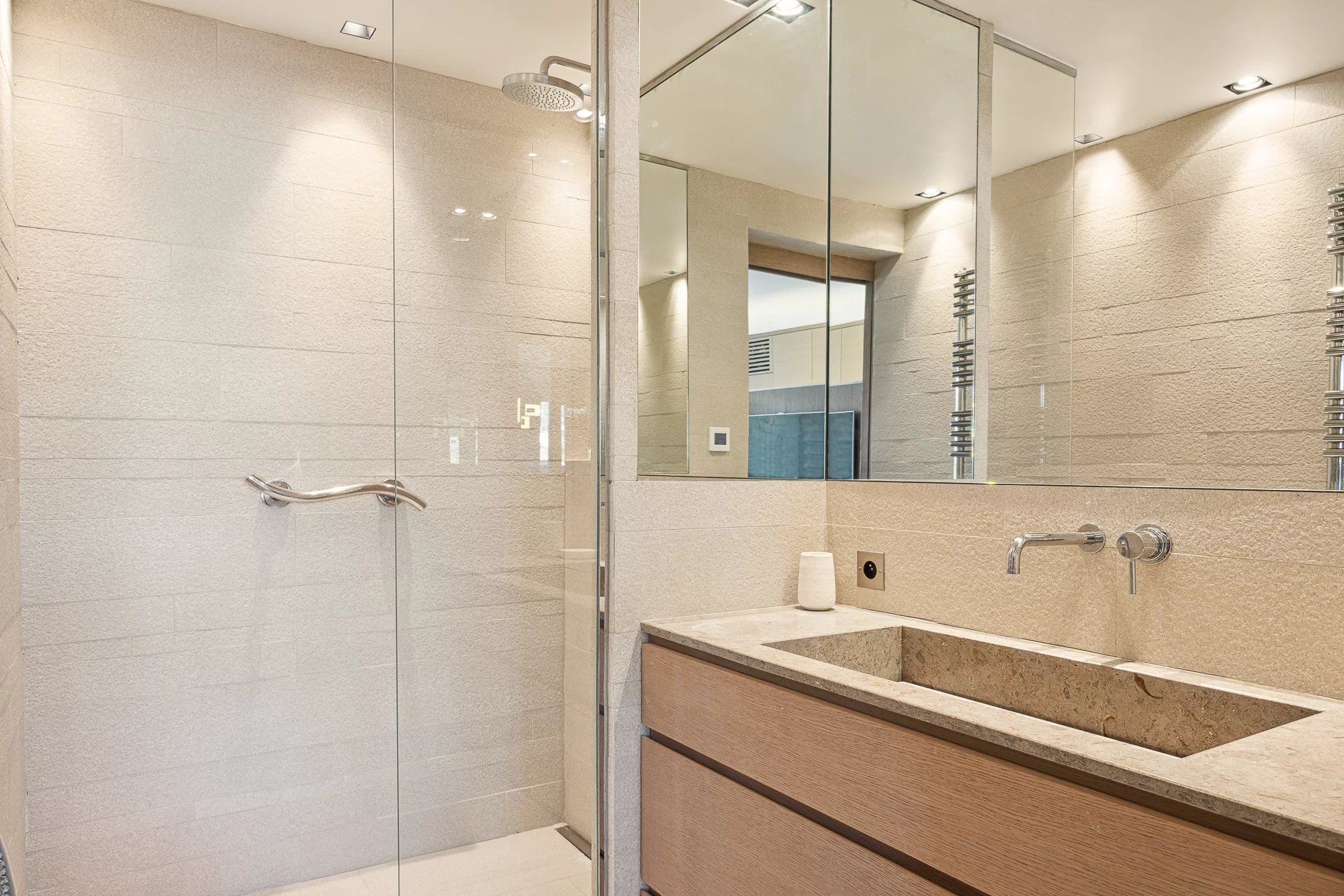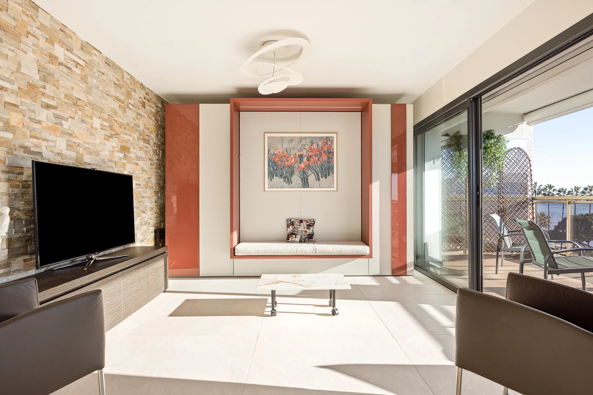 Dans la plus belle rue de Cannes, appartement d’environ 72 m2, comprenant : une cuisine ouverte équipée, un séjour, salon/, une chambre, une salle de douche, une chambre de maitre en suite avec salle de douche. Buanderie. Terrasse face au Palais des festivals. Un box.