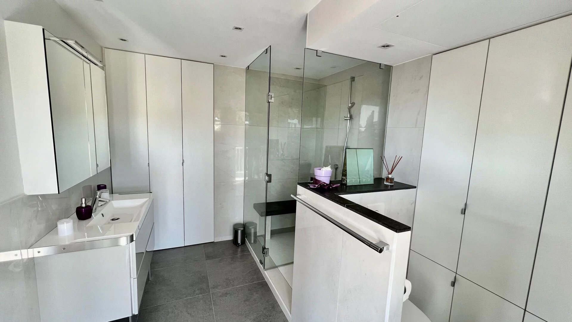 Un garage fermé de 25 m² avec porte motorisée, complété par la possibilité de stationner deux véhicules devant, ainsi qu’une grande cave aménagée avec douche – parfaite pour le retour de plage – viennent parfaire ce bien d’exception.
