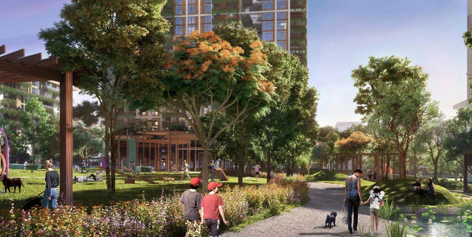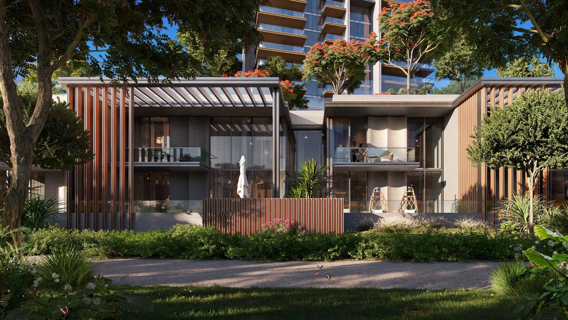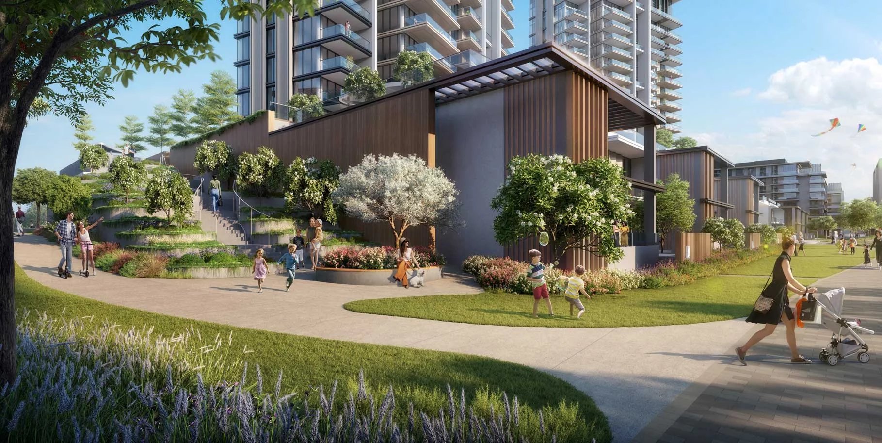 Les maisons de ville bénéficieront d’un jardin surélevé avec un accès privé au parc, entouré d’une végétation luxuriante pour une intimité optimale.