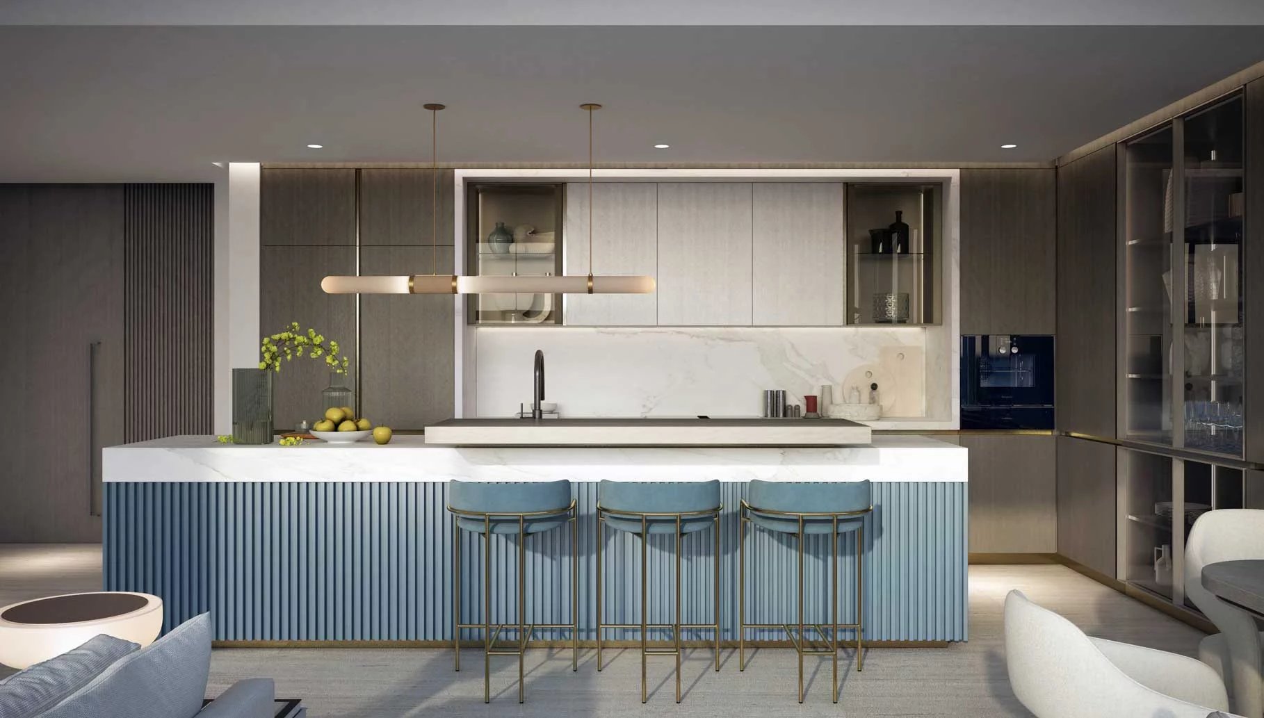 Cuisines élégantes équipées d’appareils intégrés et de finitions soigneusement sélectionnées.