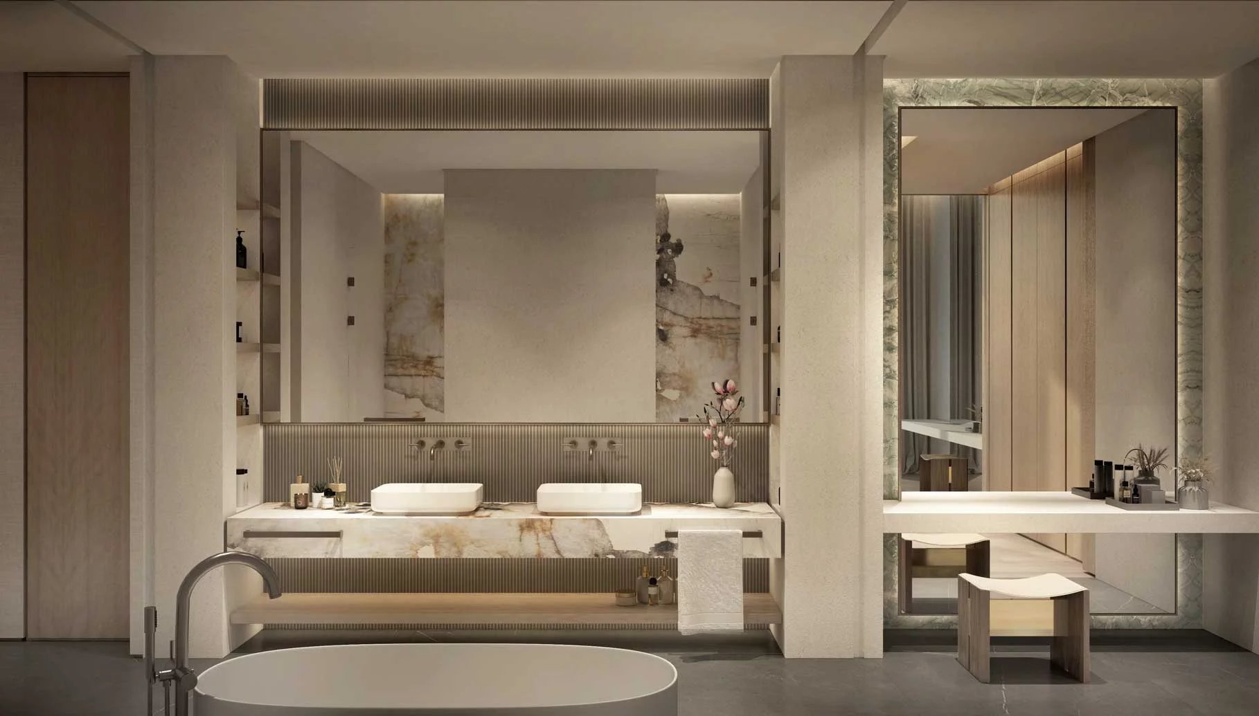 Un cadre de vie contemporain sublimé par des finitions haut de gamme et des vues panoramiques d'angle. Chambres dotées de baies vitrées pleine hauteur offrant une vue imprenable sur le parc. Salles de bains spacieuses avec une sélection variée de matériaux et d'équipements haut de gamme.
