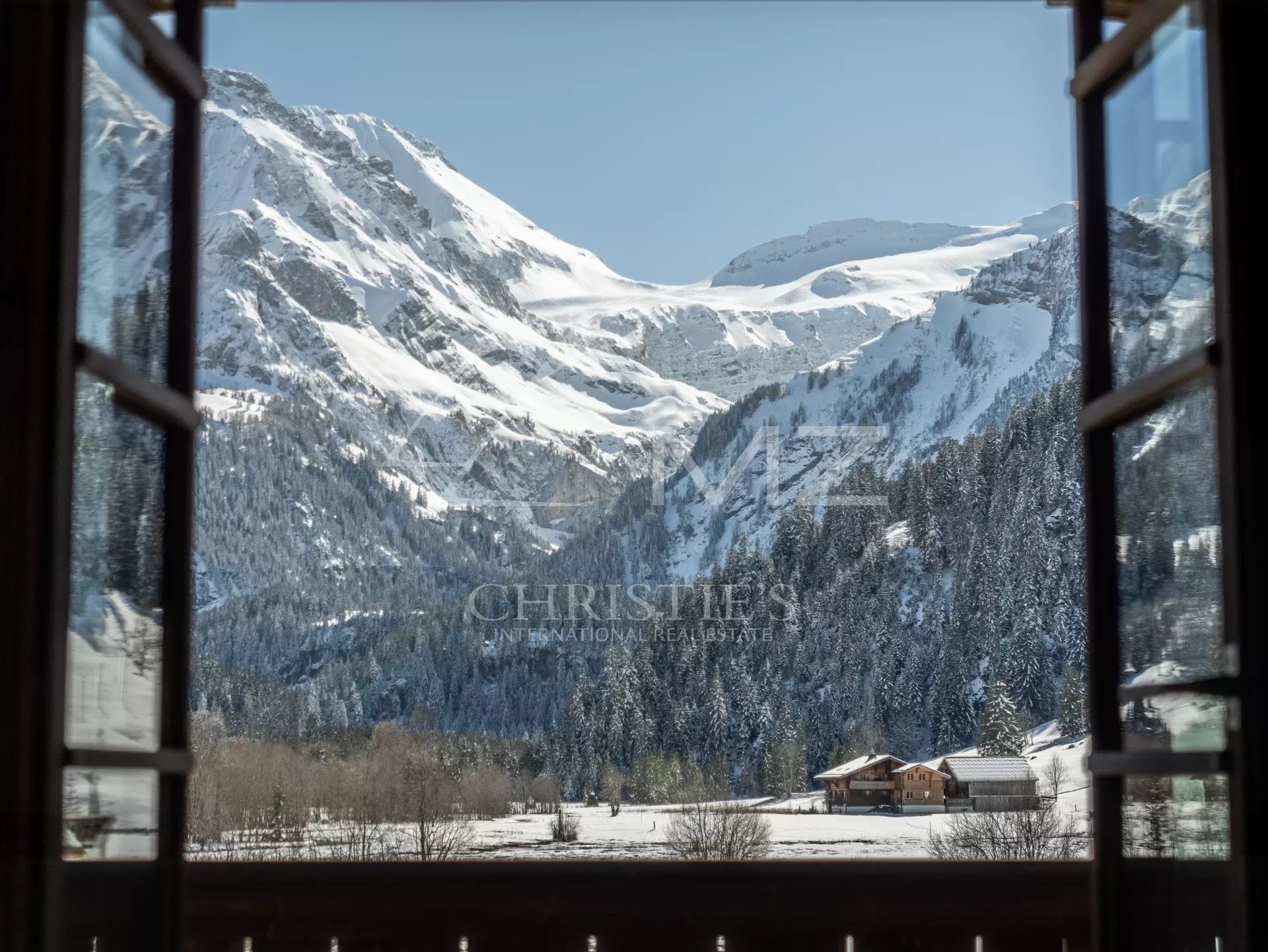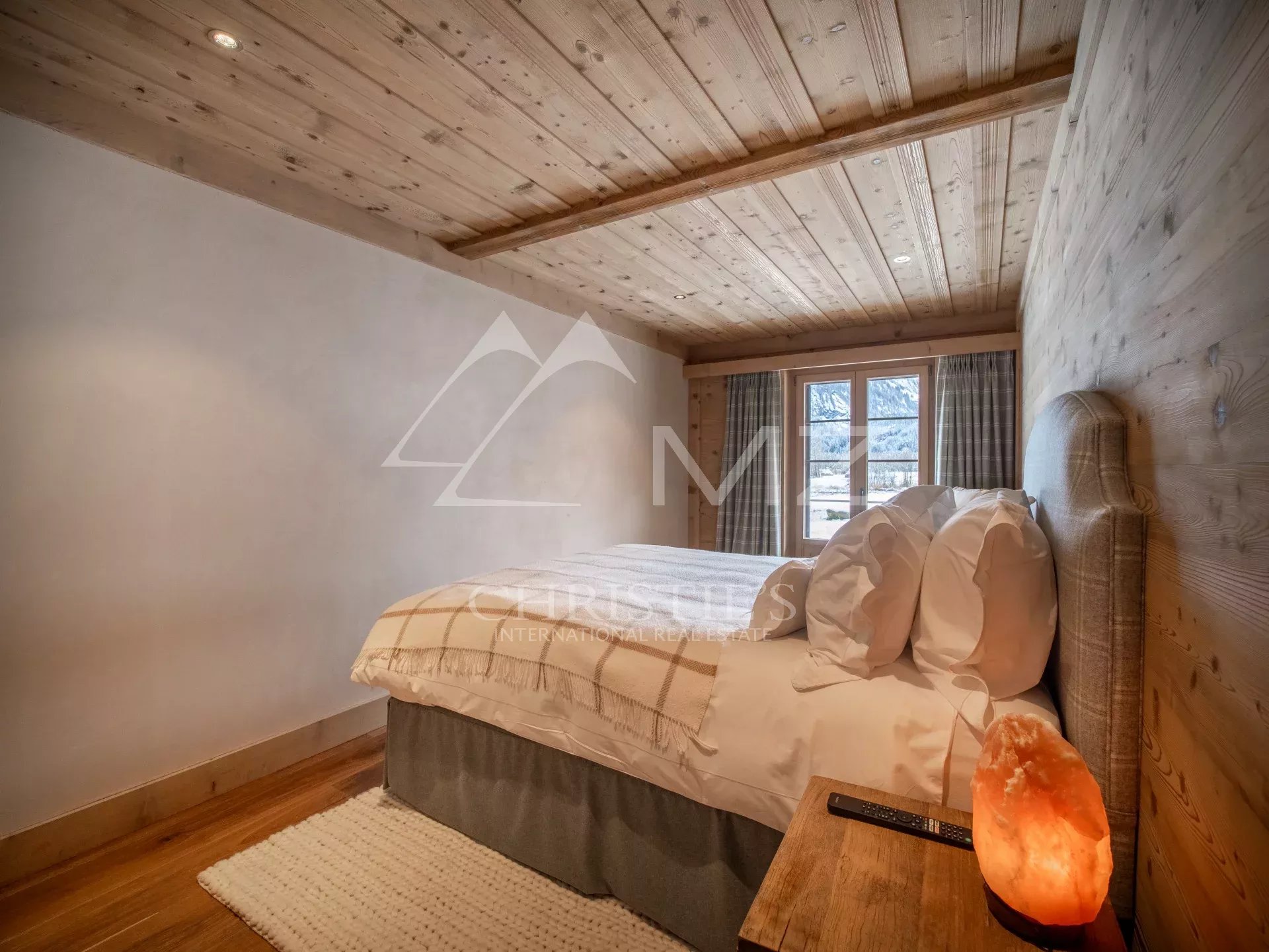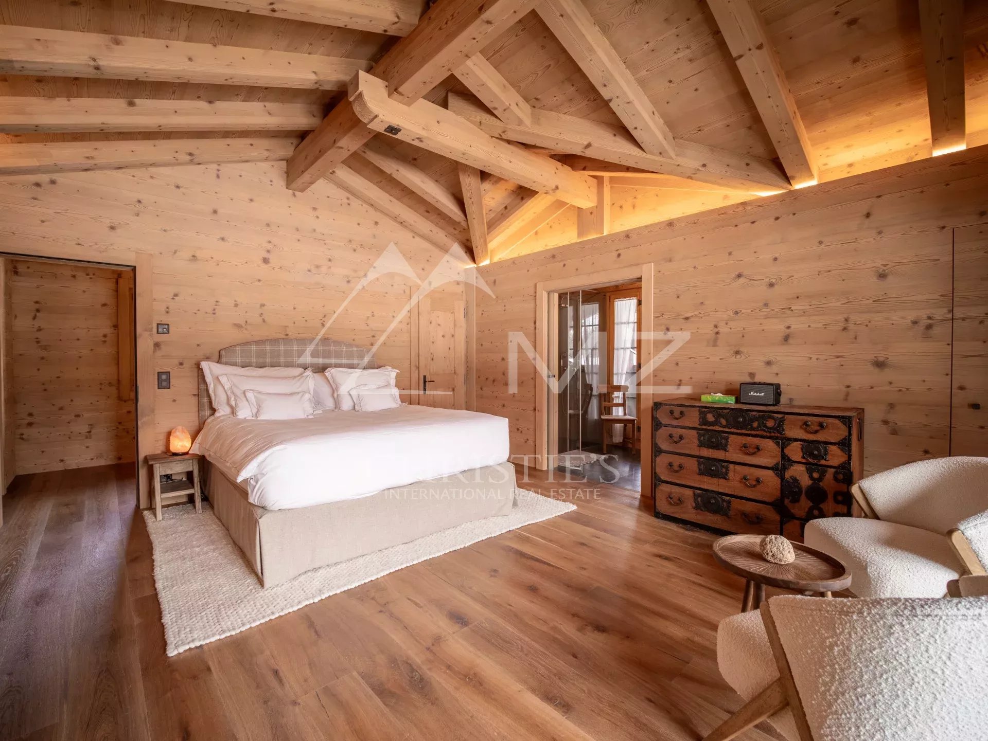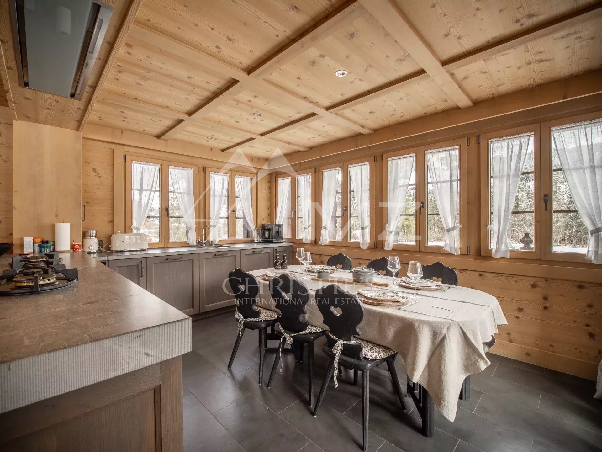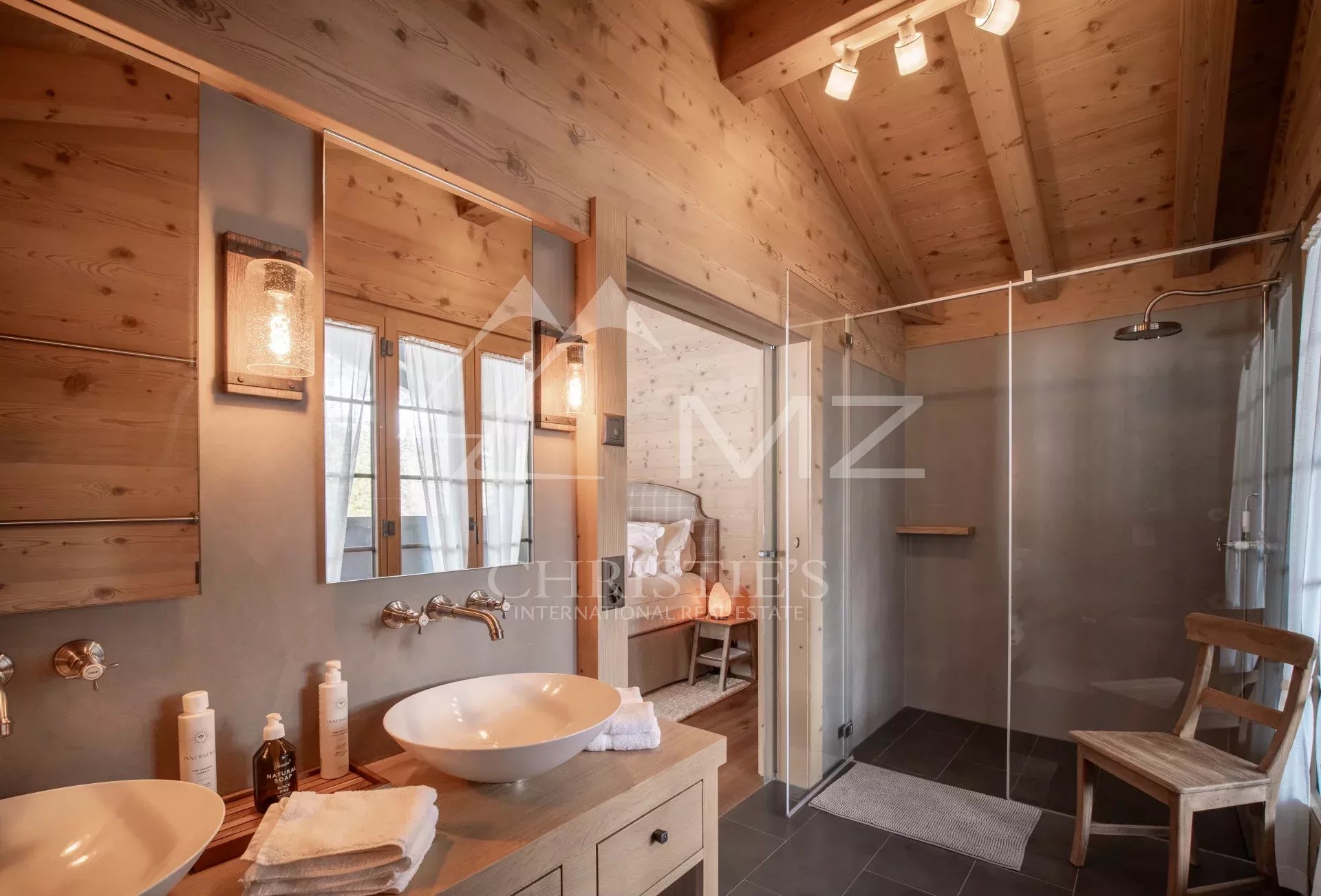 Chalet élégant avec 3 chambres, 3 salles de bains, salon avec cheminée et espace repas avec accès à une grande terrasse face aux montagnes.