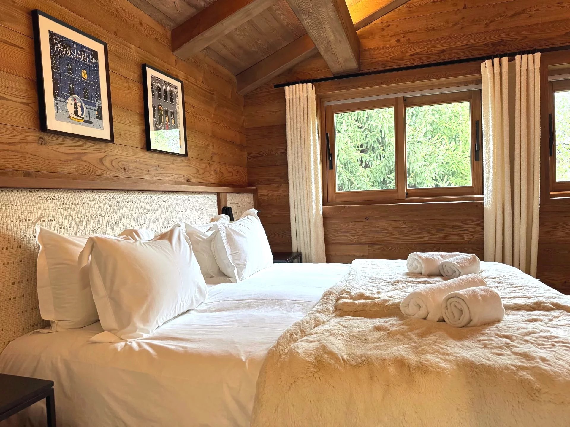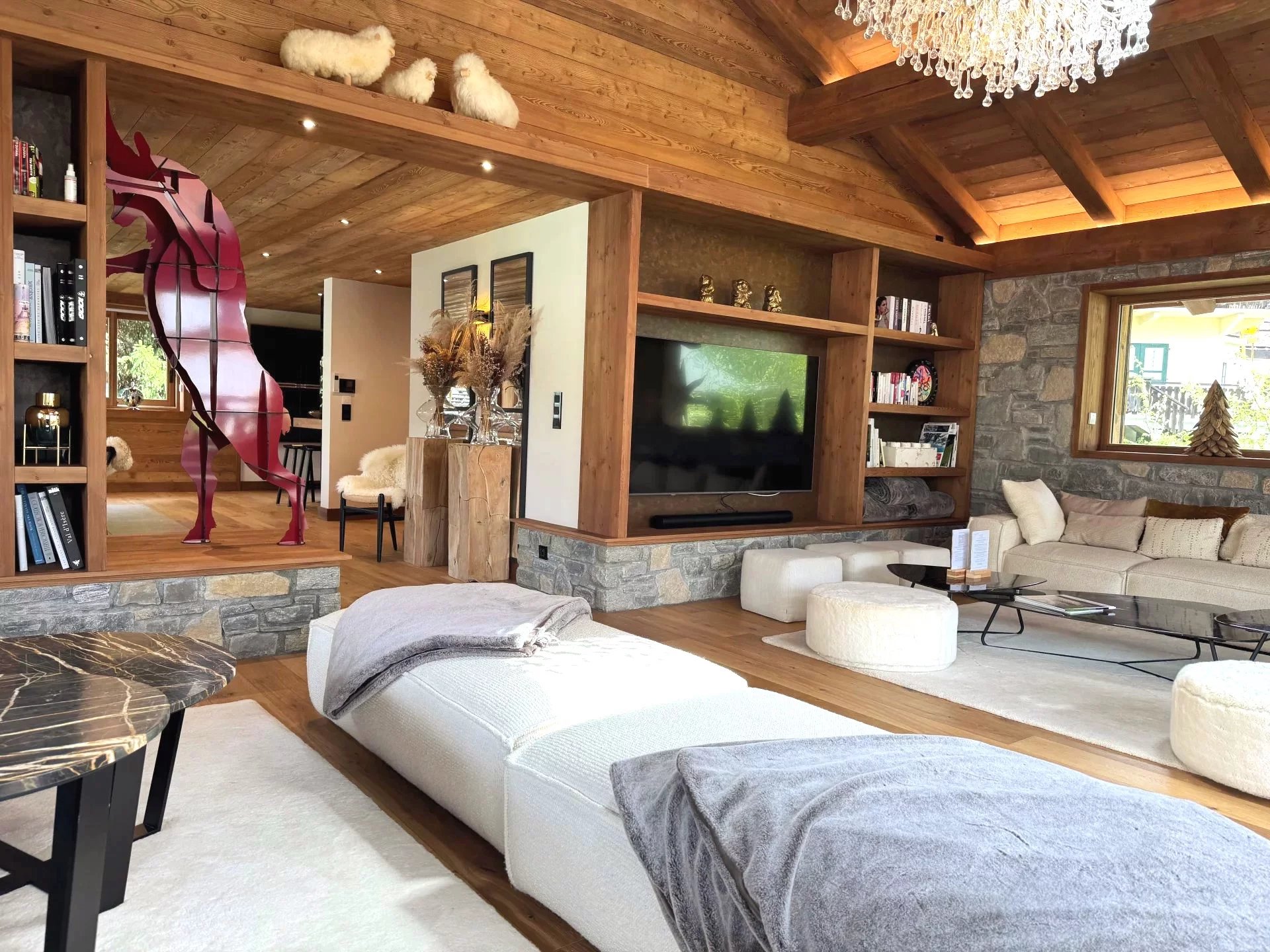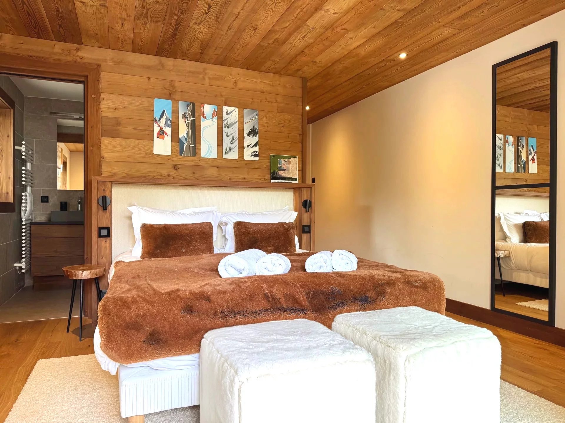 Cet chalet traditionnel offre cinq chambres en suite, dont une master avec volumes sous toiture, un vaste double salon-salle à manger avec plafond cathédrale, cheminée fermée, ainsi qu'une cuisine équipée ouverte, et s'ouvrant sur une vaste terrasse Sud-Ouest.