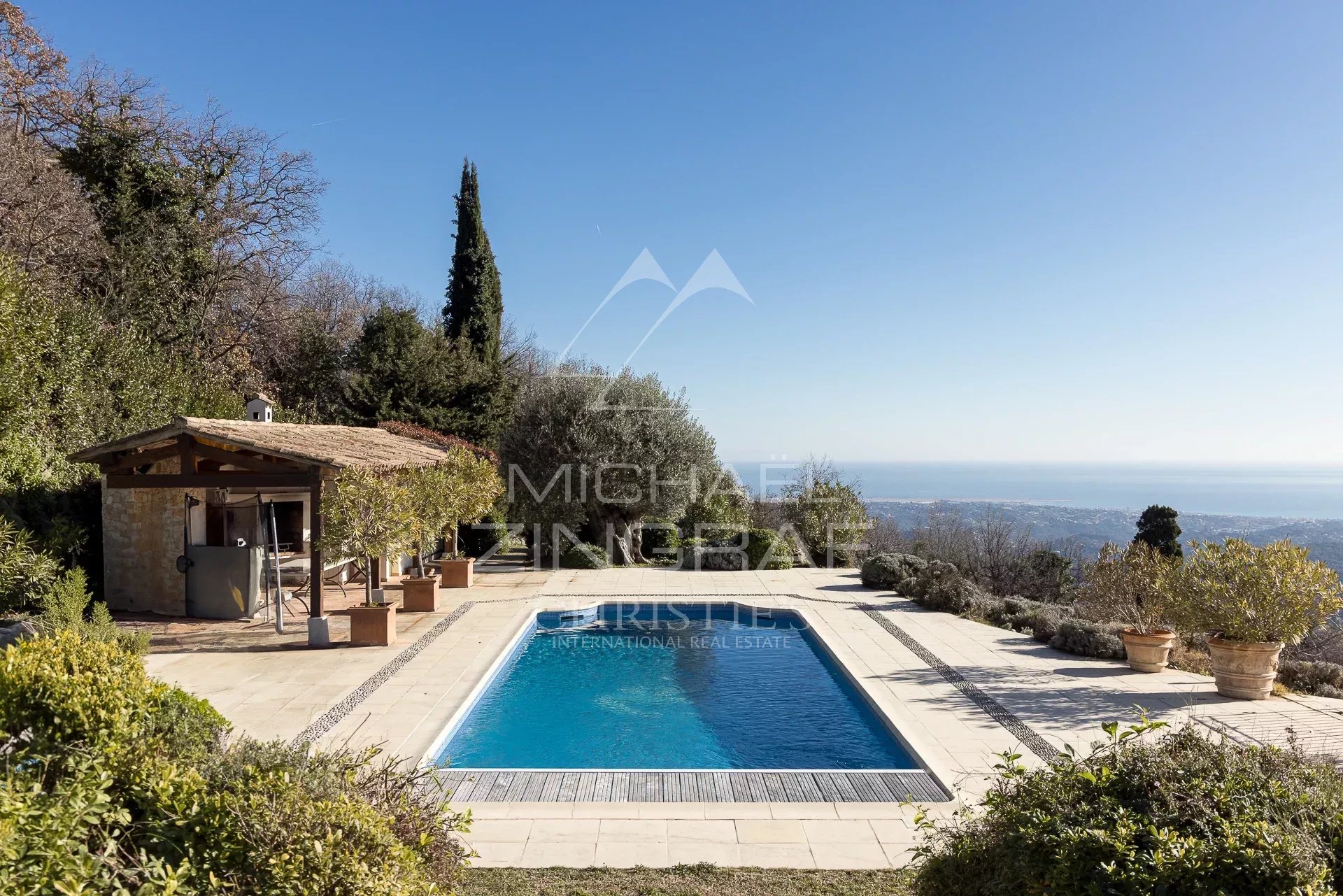 Située au bout d’un cul-de-sac, sans vis-à-vis et dans un calme absolu mais non isolée, cette somptueuse villa offre une vue mer à couper le souffle et sur le Cap d’Antibes. Proche de Saint-Paul, elle séduit par son architecture mêlant élégance provençale et touches contemporaines.