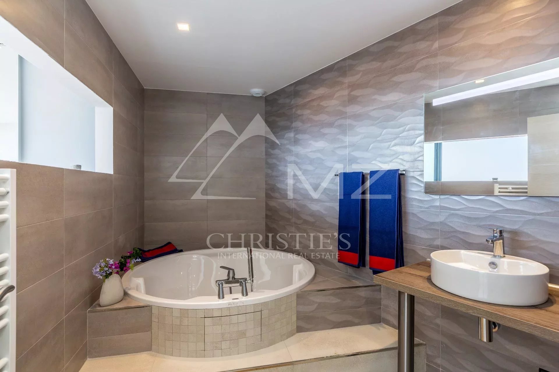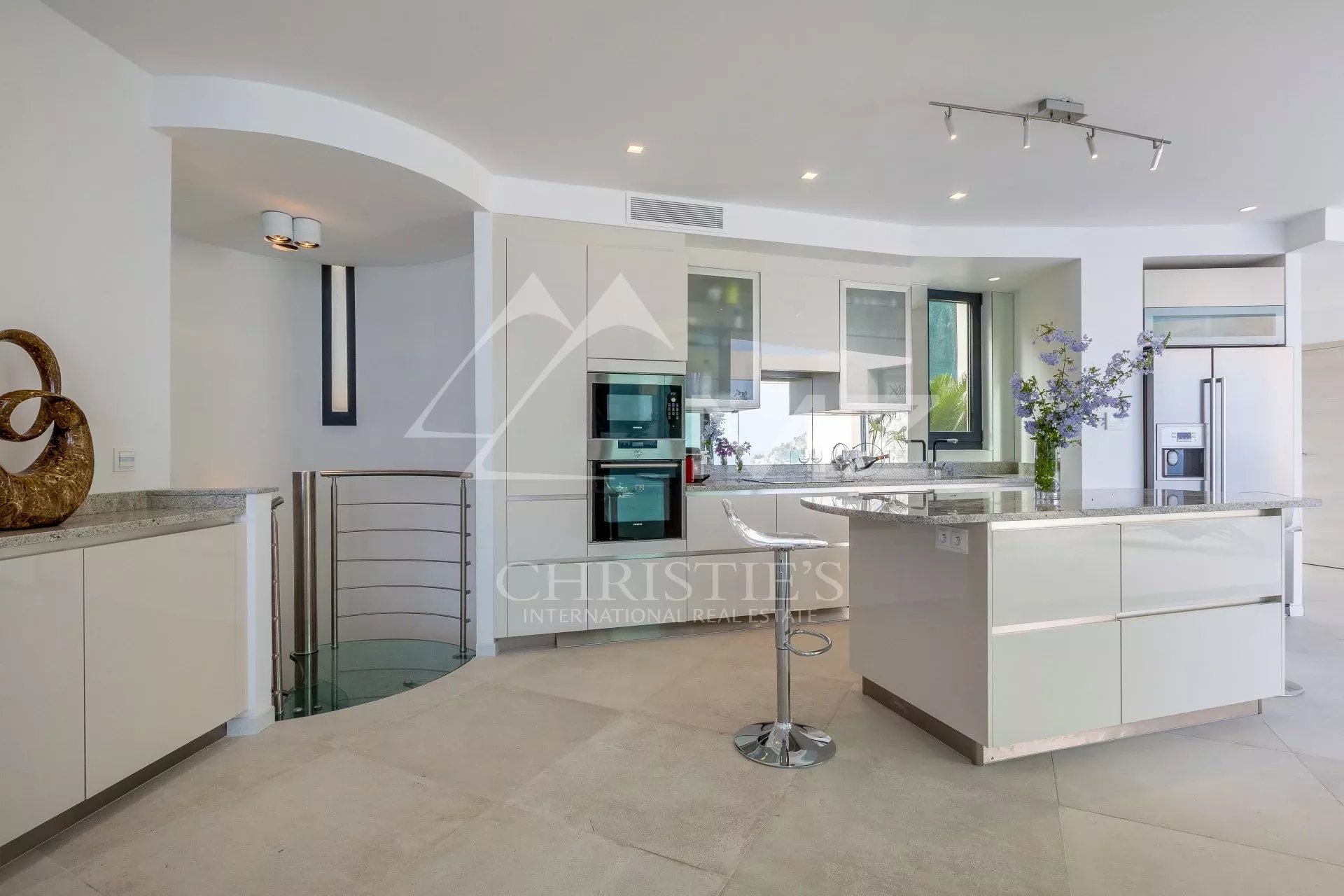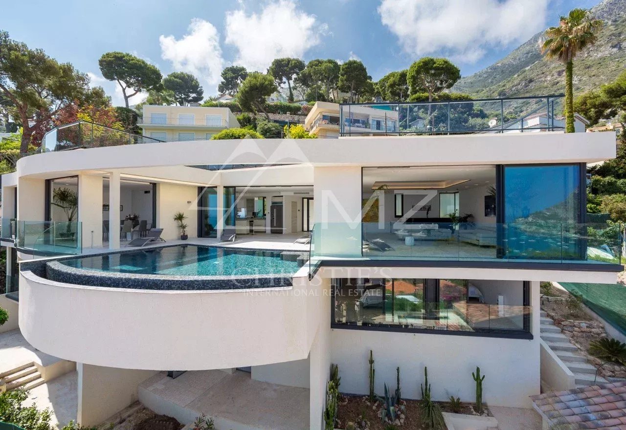 Villa contemporaine d'environ 365 m2 offrant un panorama exceptionnelle sur la mer. La propriété bénéficie de prestations de première qualité. Au niveau jardin, elle se compose d'une grande réception, salle à manger avec cuisine américaine ouvrant sur terrasse et espace de vie autour de la piscine, et d'une chambre avec salle douche en-suite. En rez-de-chaussée : 4 chambres chaqune avec vue mer et sa salles de bains/douche en-suite, coin bar, buanderie et réserve. Toit terrasse et 4 parkings. A 10 minutes à pieds de la mer.
