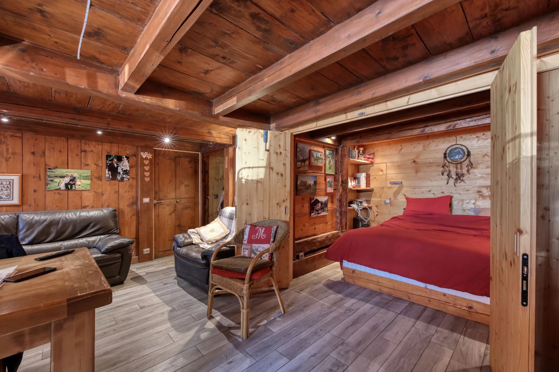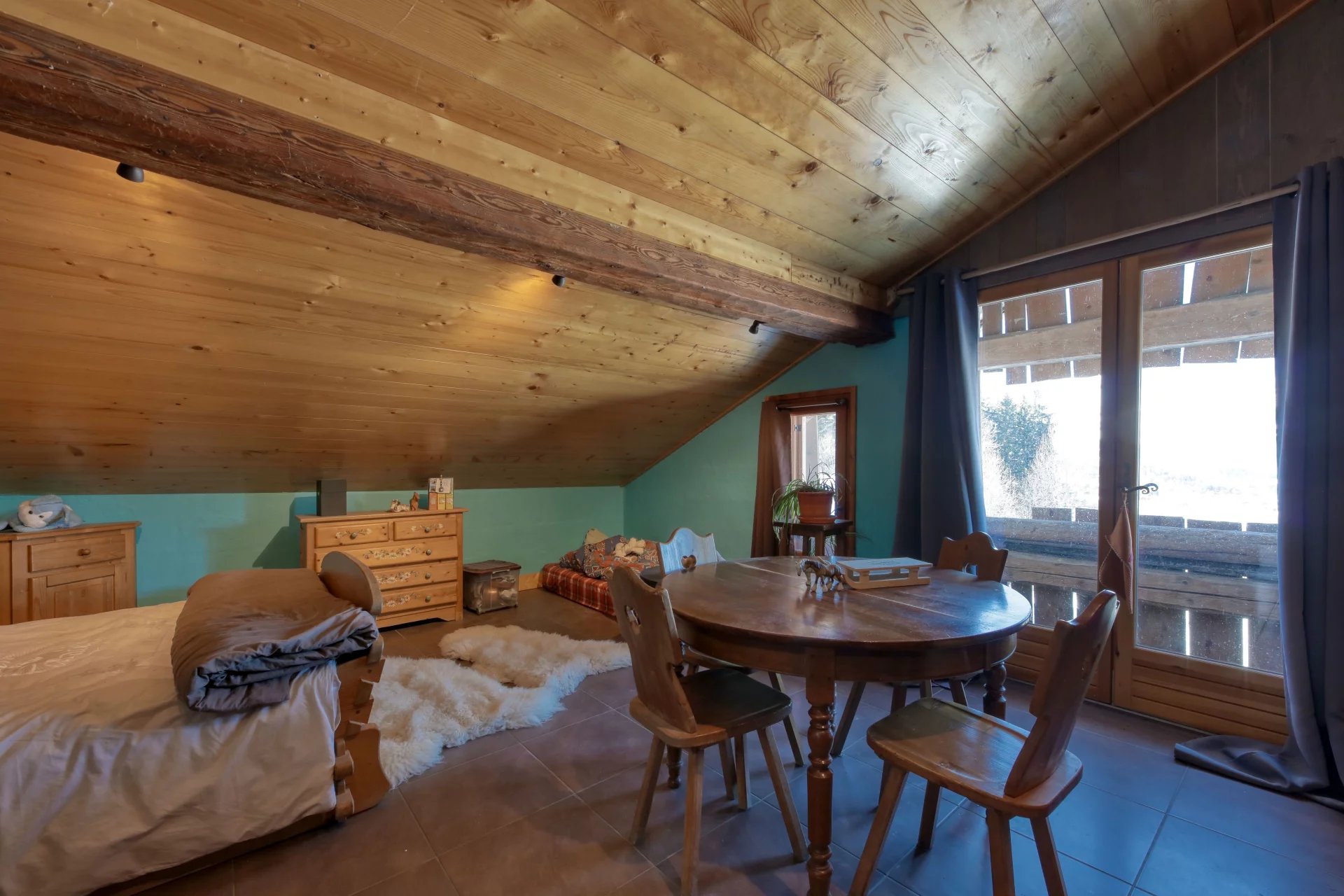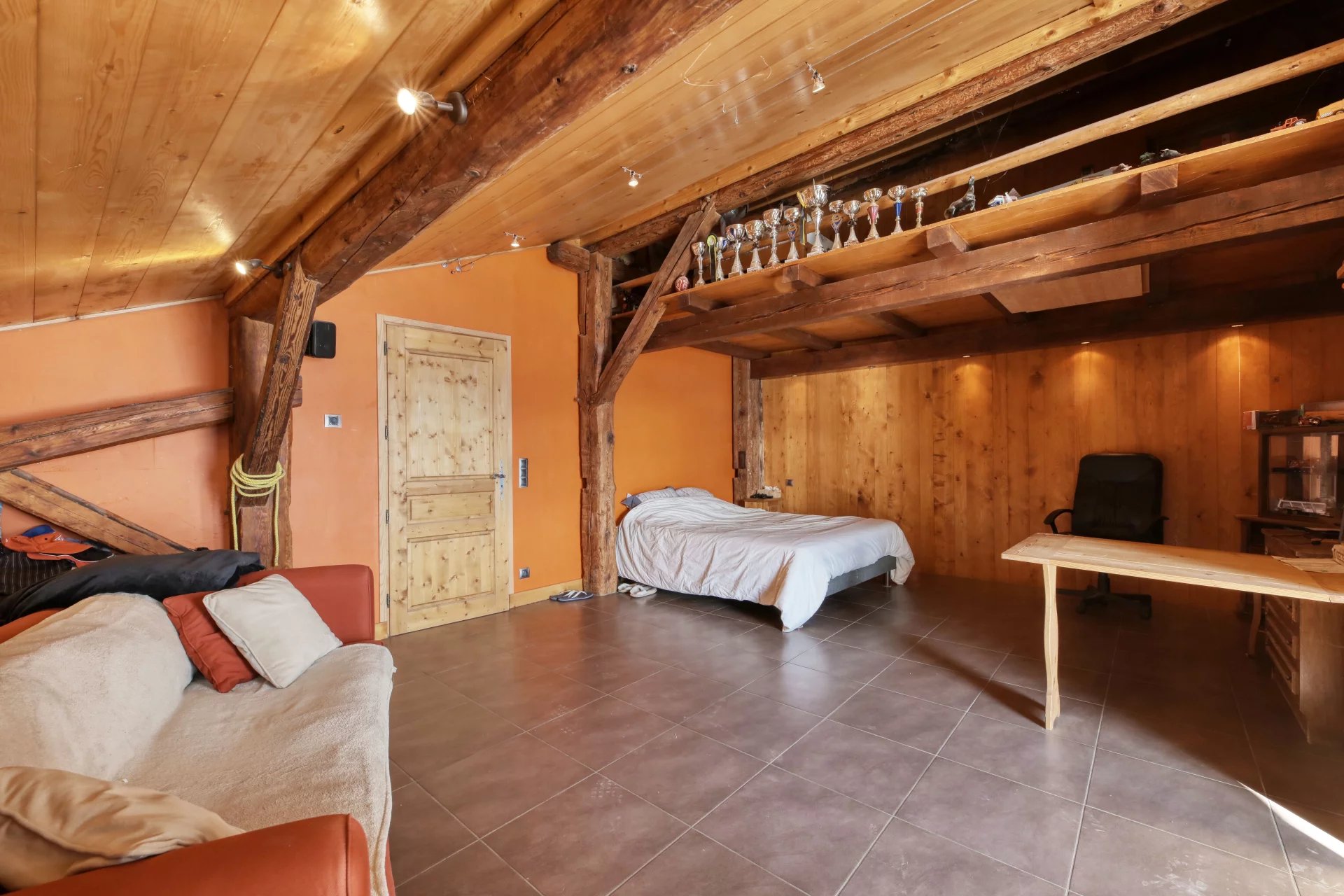 A proximité immédiate des pistes, son cadre champêtre et paisible séduit. La bâtisse de 500 m2 dispose d'une confortable partie habitation comprenant un salon/salle à manger avec terrasse Sud-Ouest, une cuisine séparée, quatre chambres, un bureau, et un dressing.