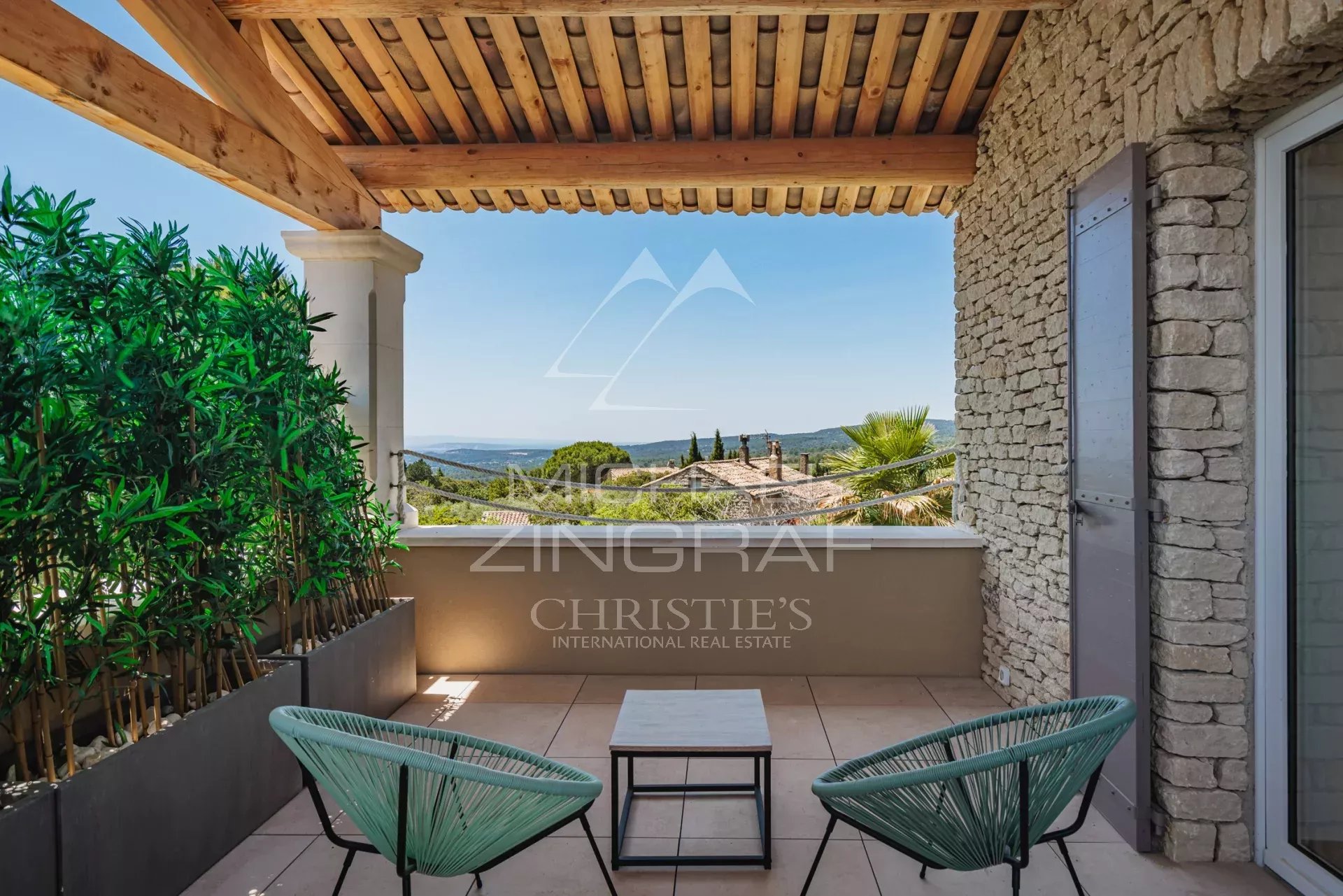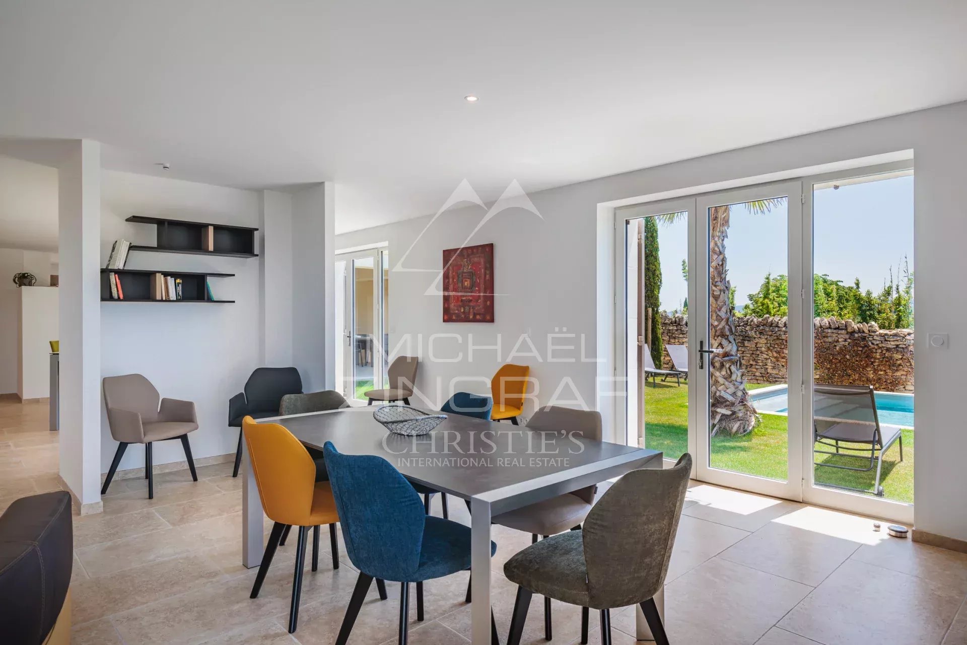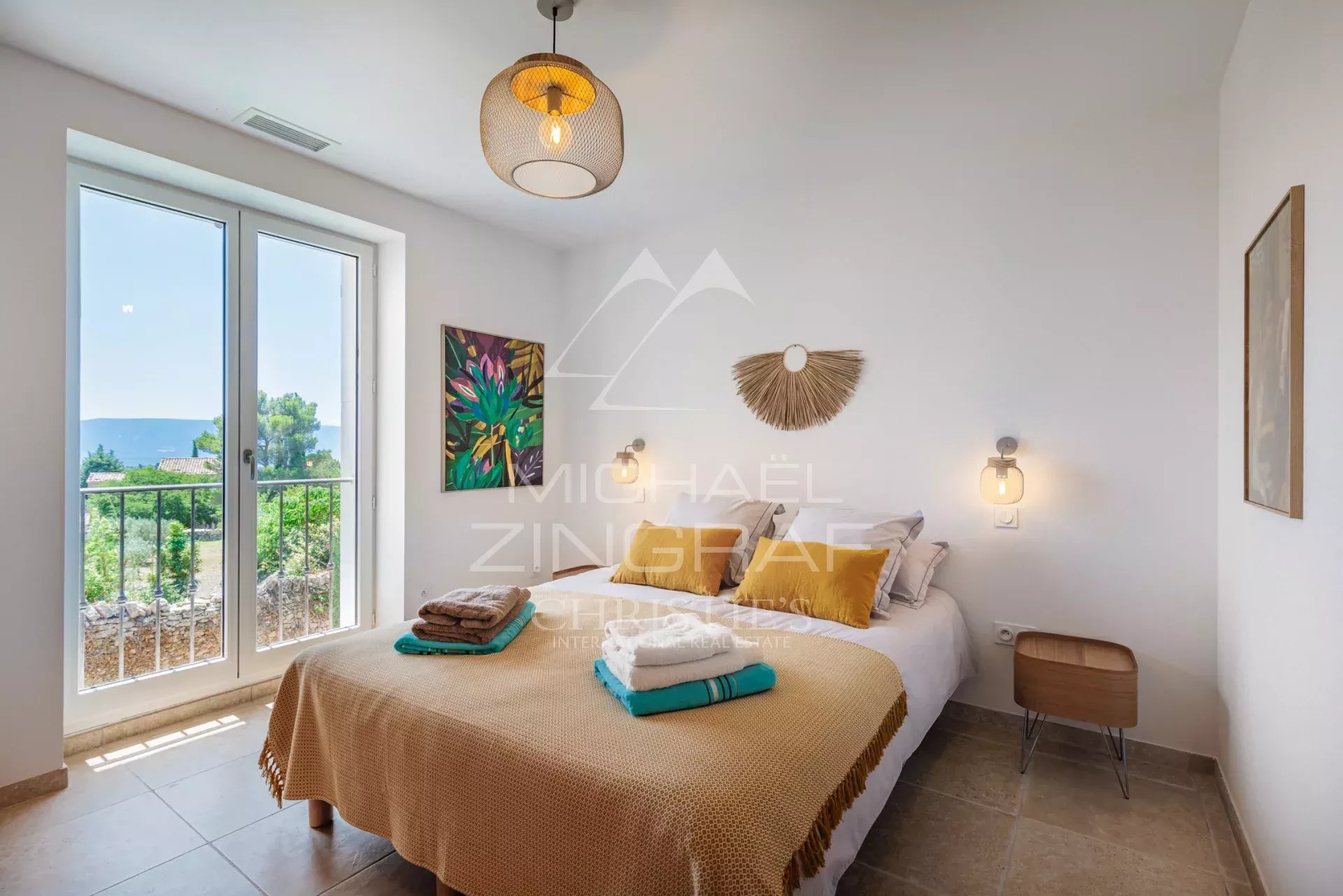 L'intérieur, moderne et lumineux, propose deux niveaux bien agencés avec l'espace jour en rez-de-jardin, ouvert et fonctionnel. L'espace nuit, à l'étage, comprend 5 belles chambres en suite, dont la plus spacieuse avec une terrasse privative et une vue sur le village perché.