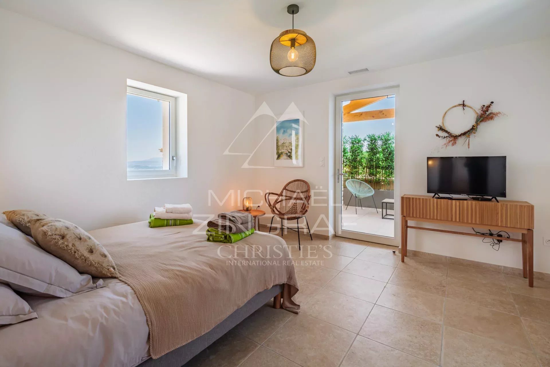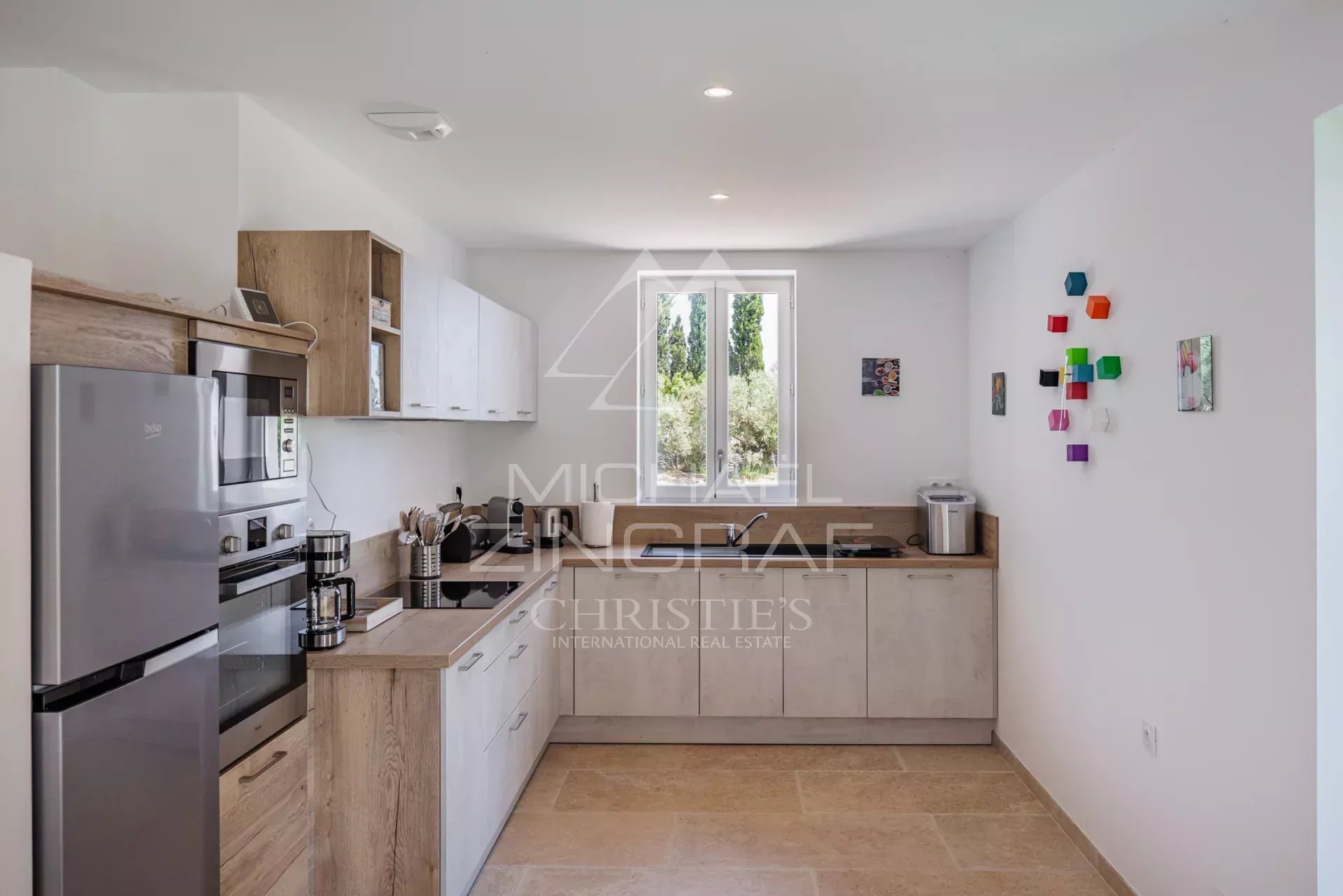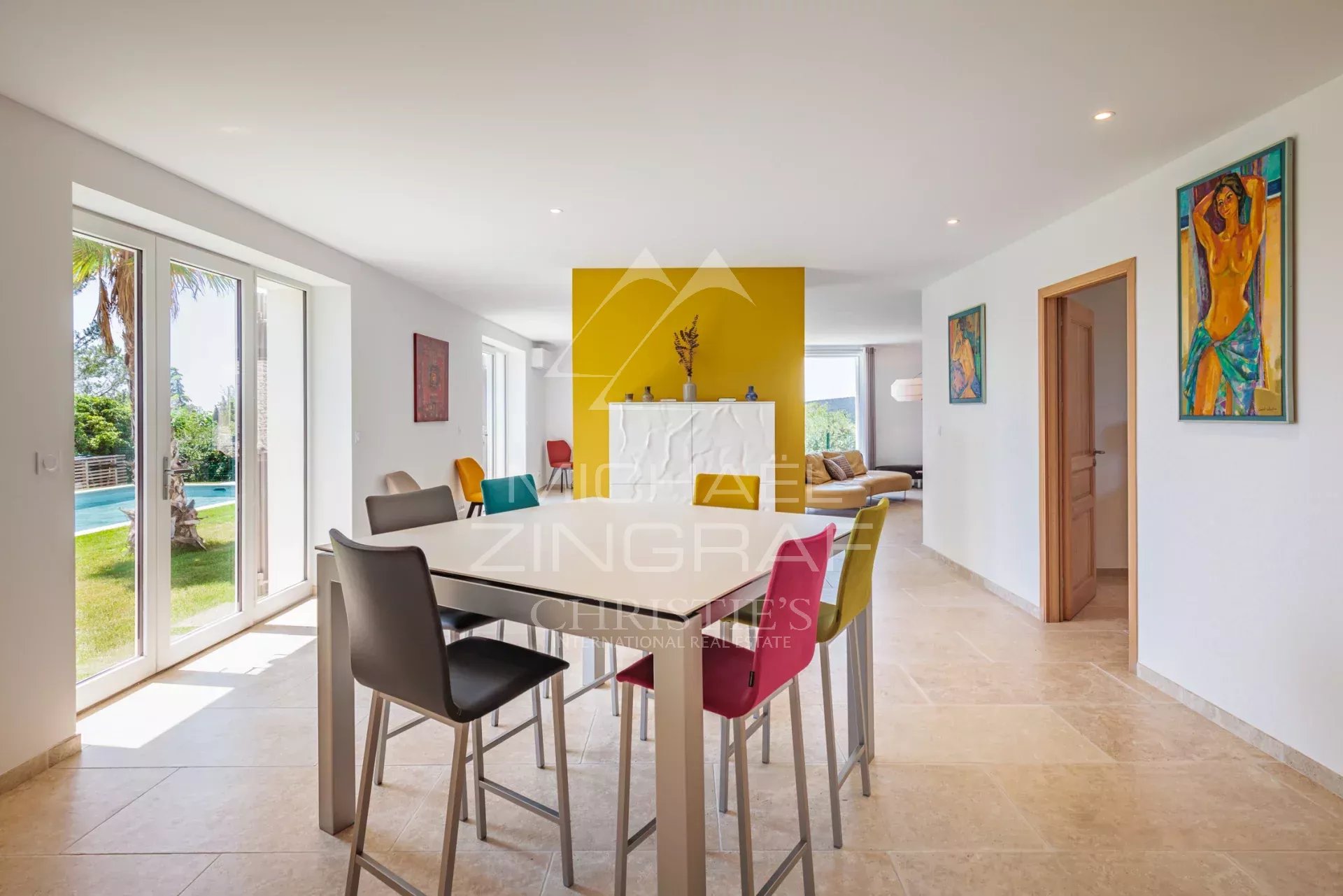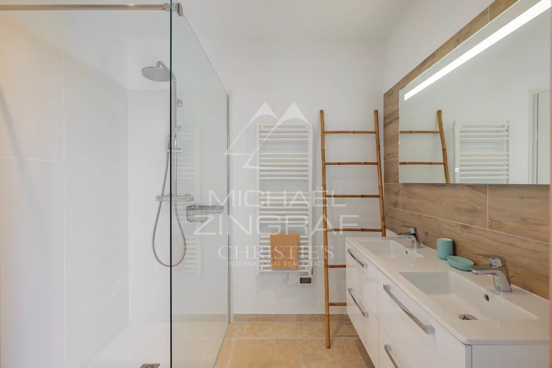 L'intérieur, moderne et lumineux, propose deux niveaux bien agencés avec l'espace jour en rez-de-jardin, ouvert et fonctionnel. L'espace nuit, à l'étage, comprend 5 belles chambres en suite, dont la plus spacieuse avec une terrasse privative et une vue sur le village perché.