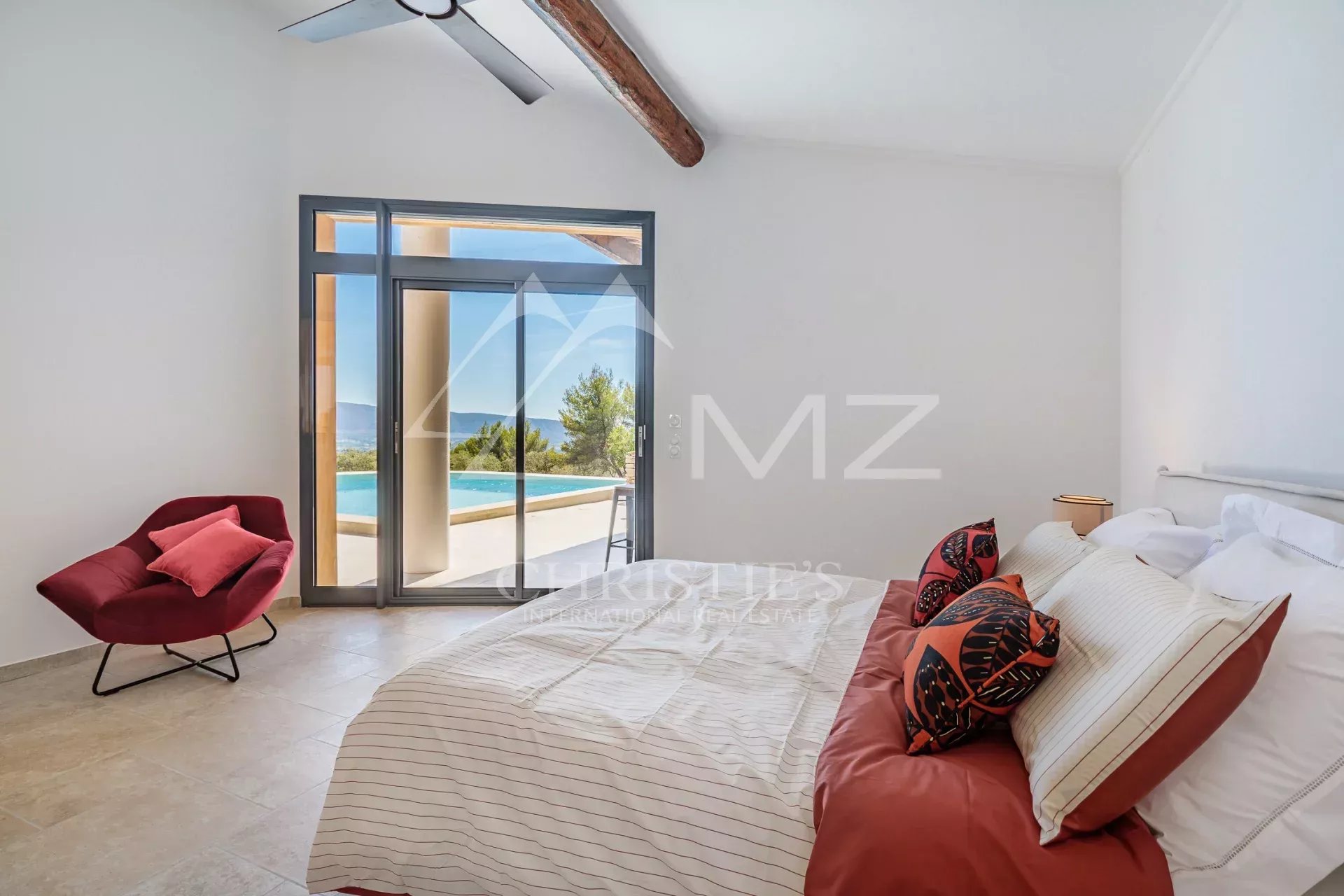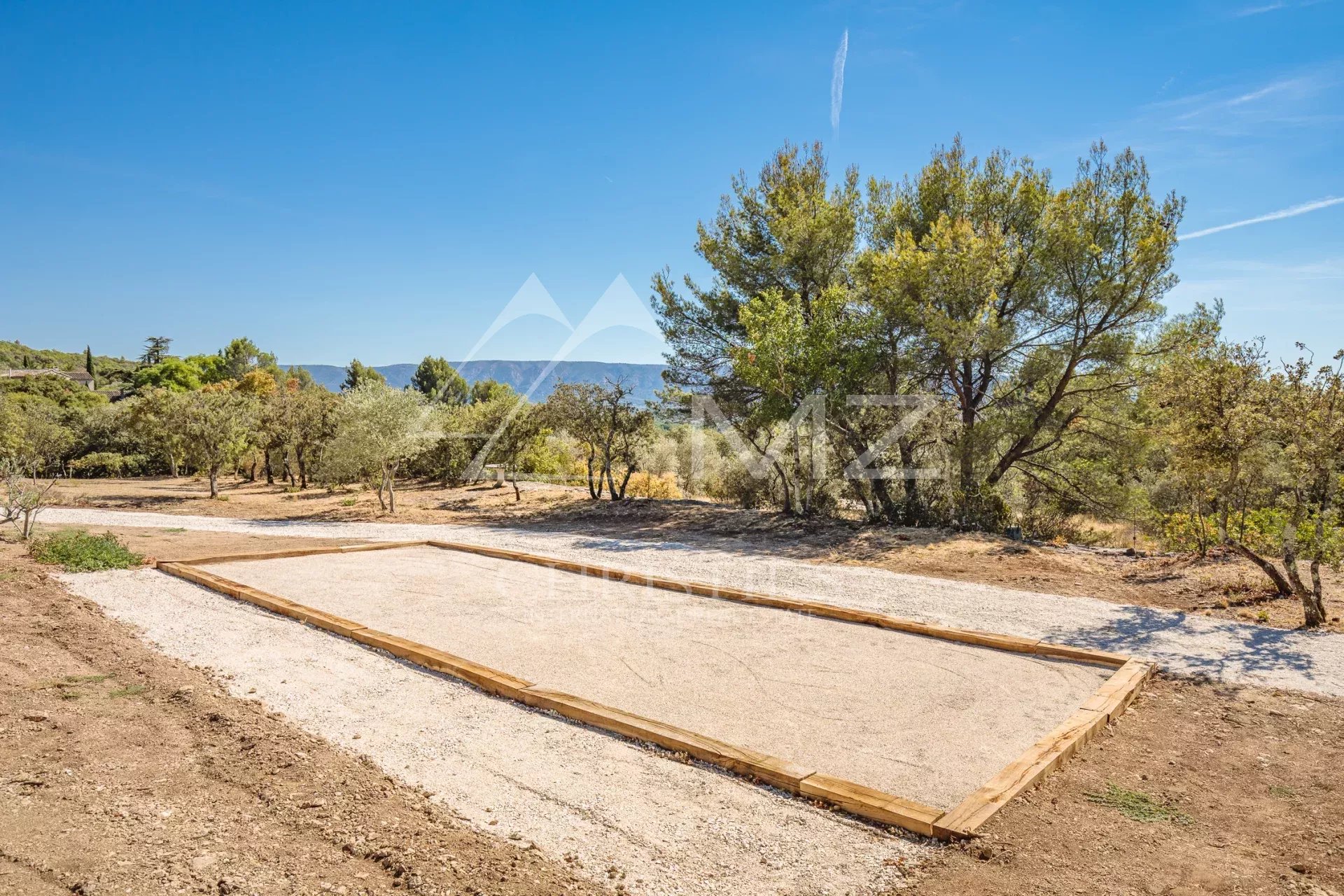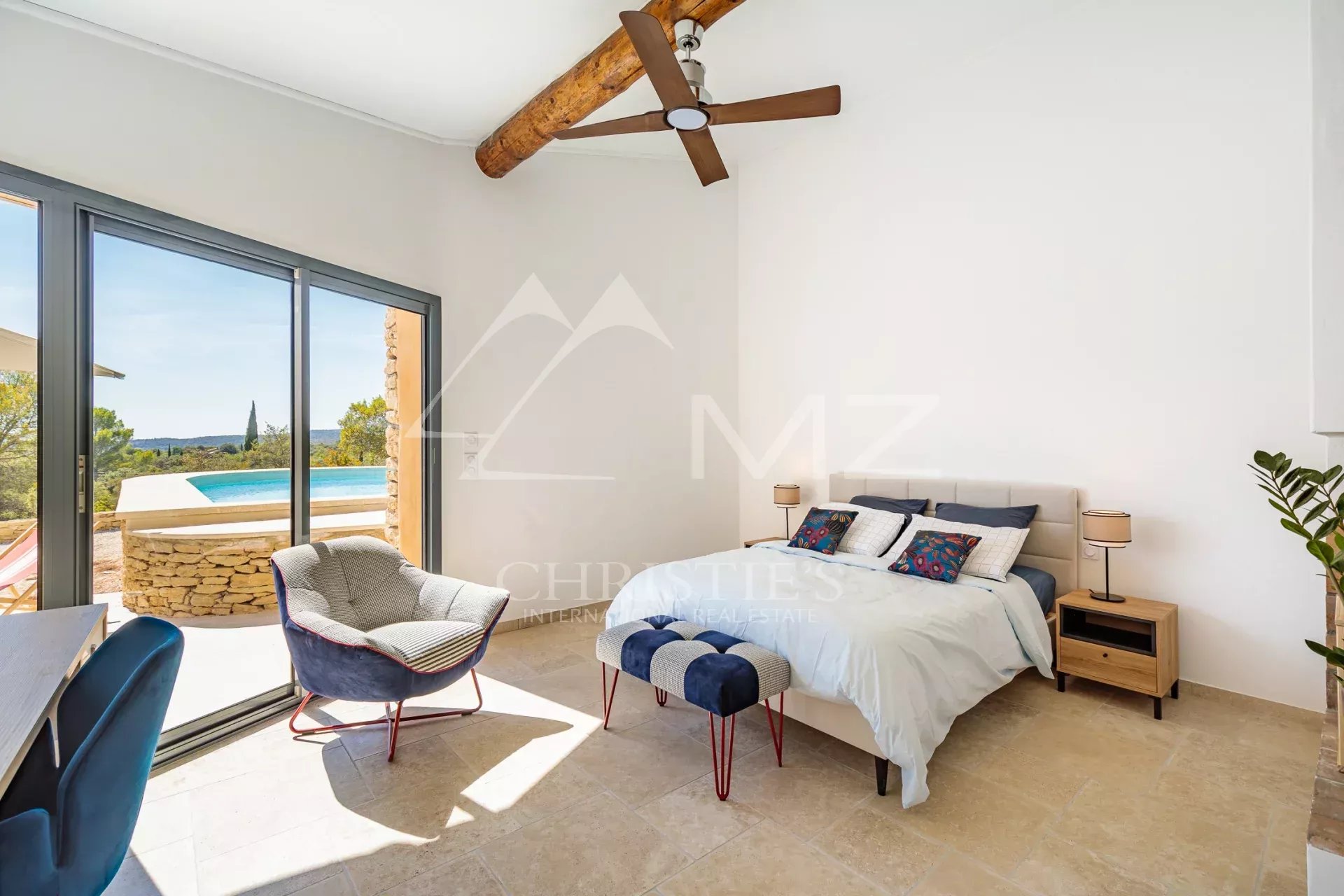 Une spacieuse terrasse de plus de 180 m² offre des espaces déjeuner et détentes aménagés avec une vue dégagée sur le massif du Luberon, une belle piscine chauffée de 7x7 m, avec un côté arrondi, des transats, un parasol...