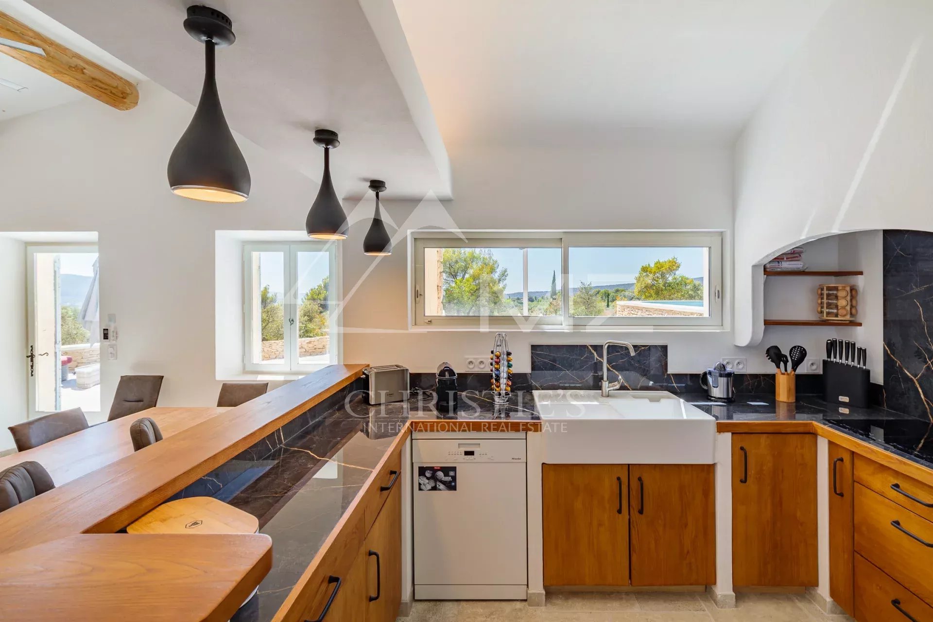 À quelques kilomètres du village de Gordes, dans un quartier calme et sans nuisance, très belle maison restaurée au cœur d'un ensemble arboré de chênes et d'oliviers.
