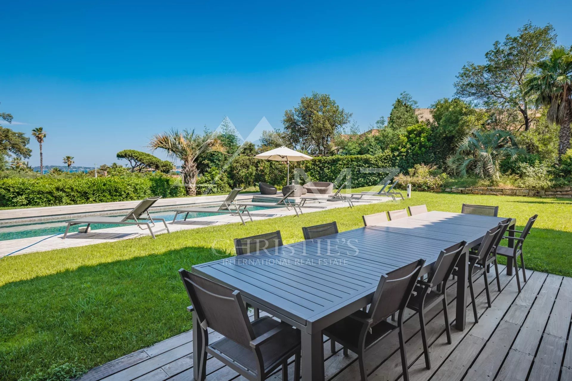Offrant des prestations haut de gamme, elle dispose d'un salon, une cuisine ouverte équipée, de 7 chambres avec 6 salles de bains, une piscine, un jacuzzi, un pool house et un garage, le tout entouré d'un jardin arboré et d'un joli aperçu mer.