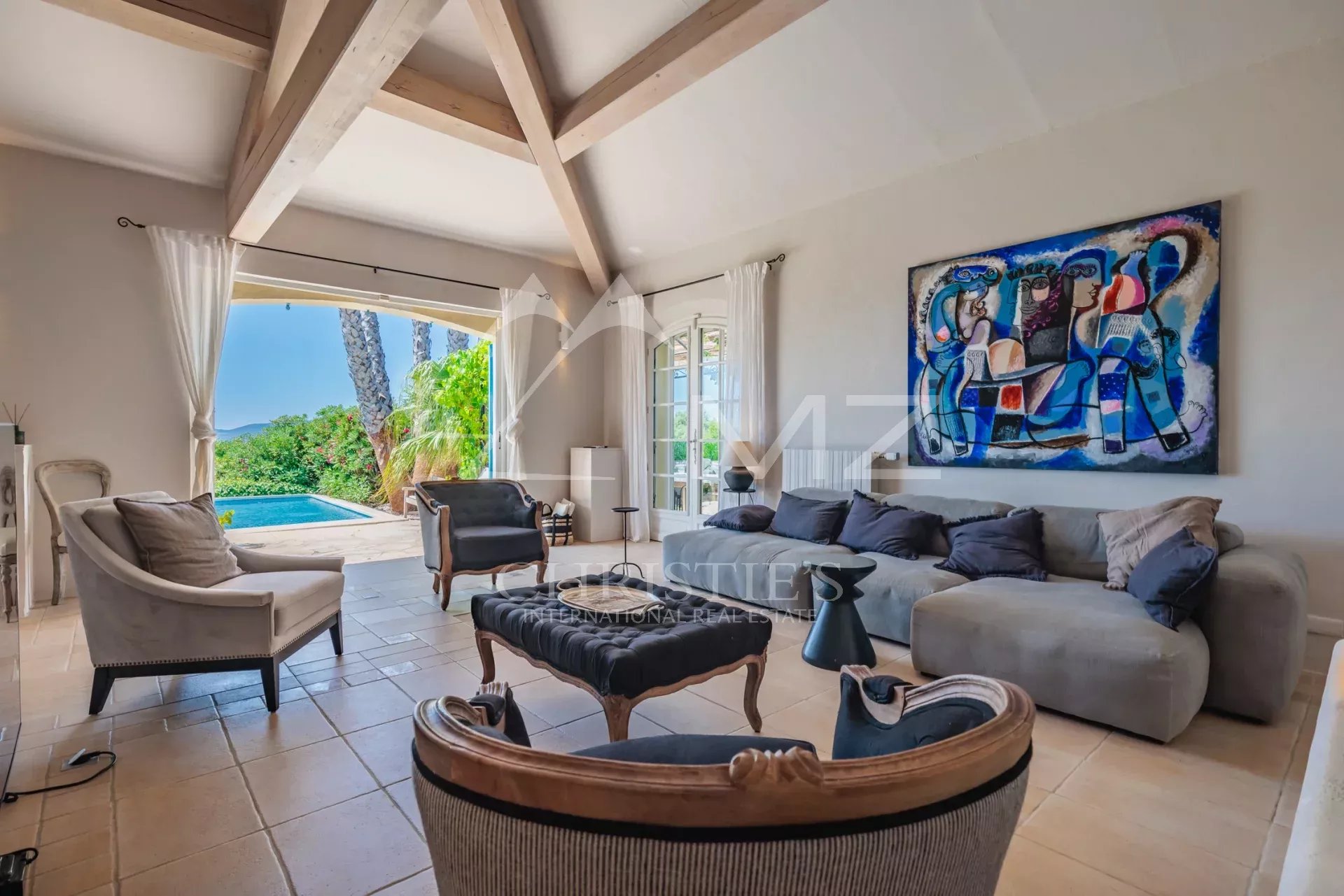 Cette jolie villa provençale récemment classée 5 étoiles, située sur les hauteurs de Grimaud, avec sa piscine chauffée à débordement et son jardin arboré est composée d'un salon, salle à manger, une cuisine, 5 chambres avec 5 salles de bain ou douche et dispose d'une belle vue mer.