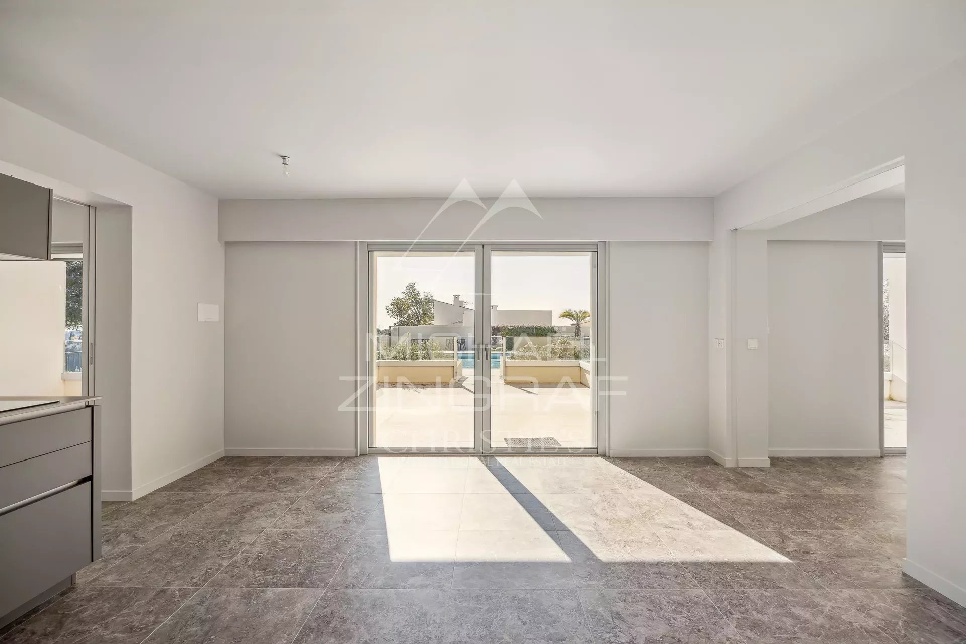 Le deuxième appartement, d’environ 141 m², inclut également un salon/séjour avec une cuisine américaine et un accès à une terrasse spacieuse offrant une vue sur la mer. Il comprend trois chambres en suite, des toilettes pour invités, une cave et un garage non clos.