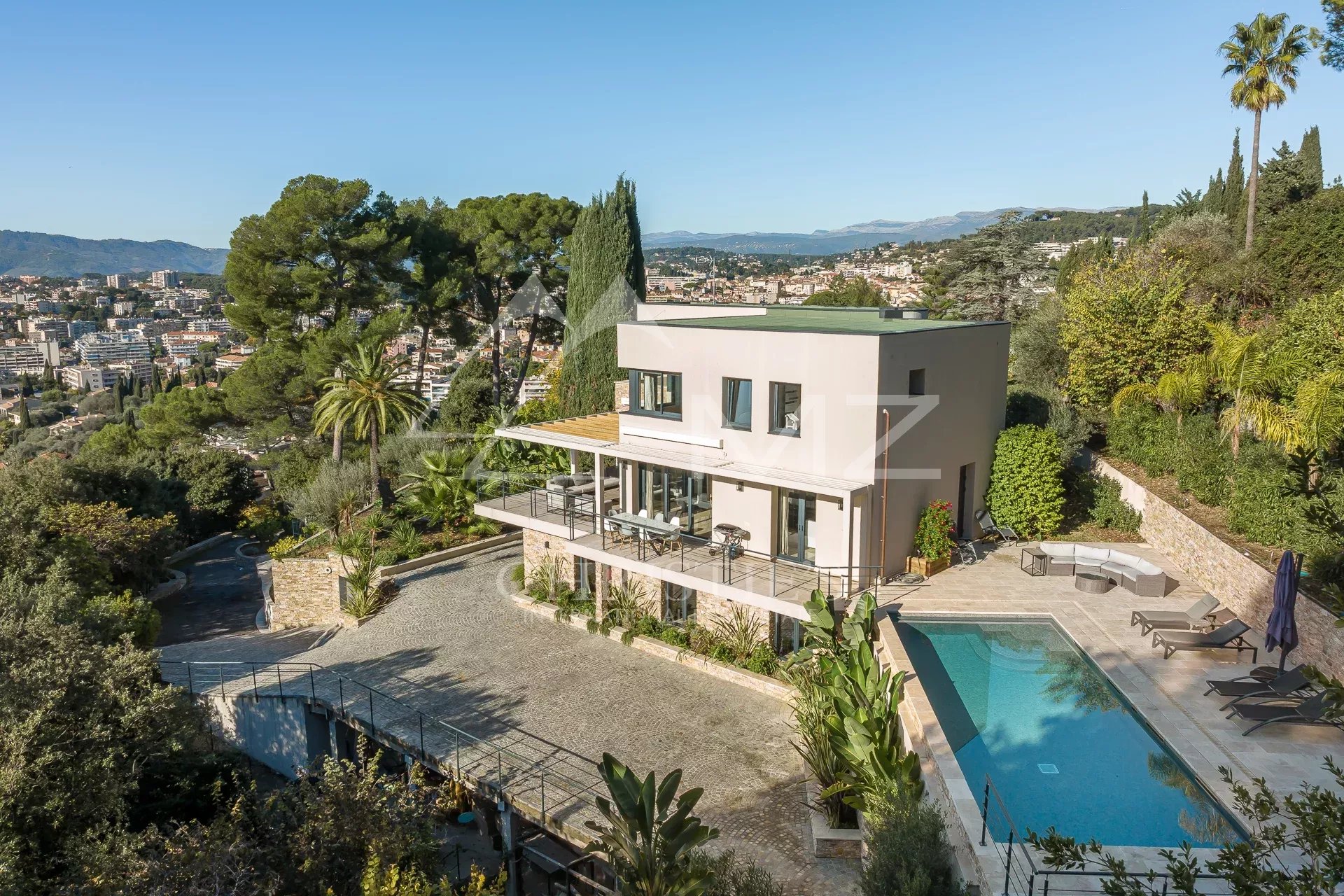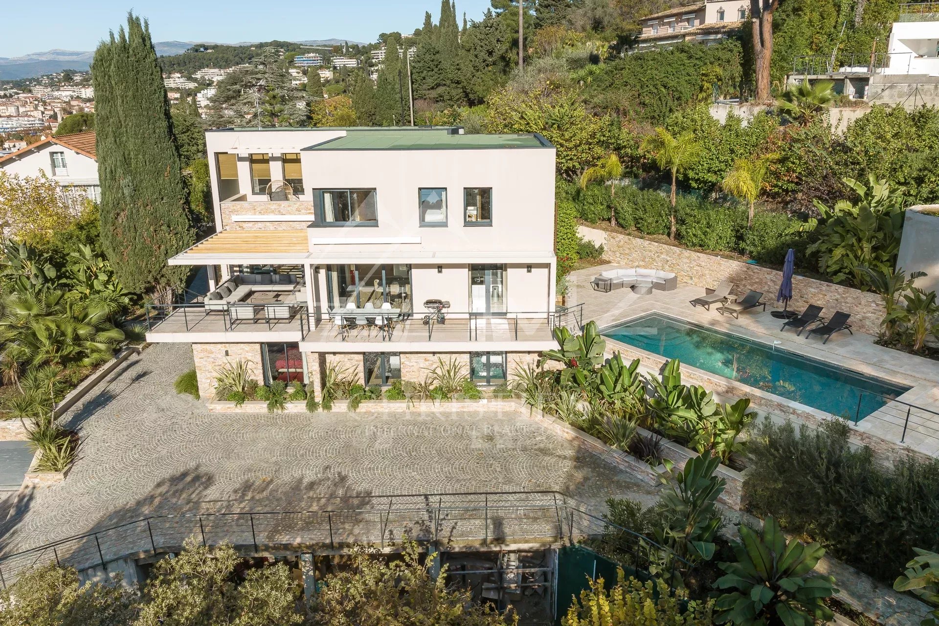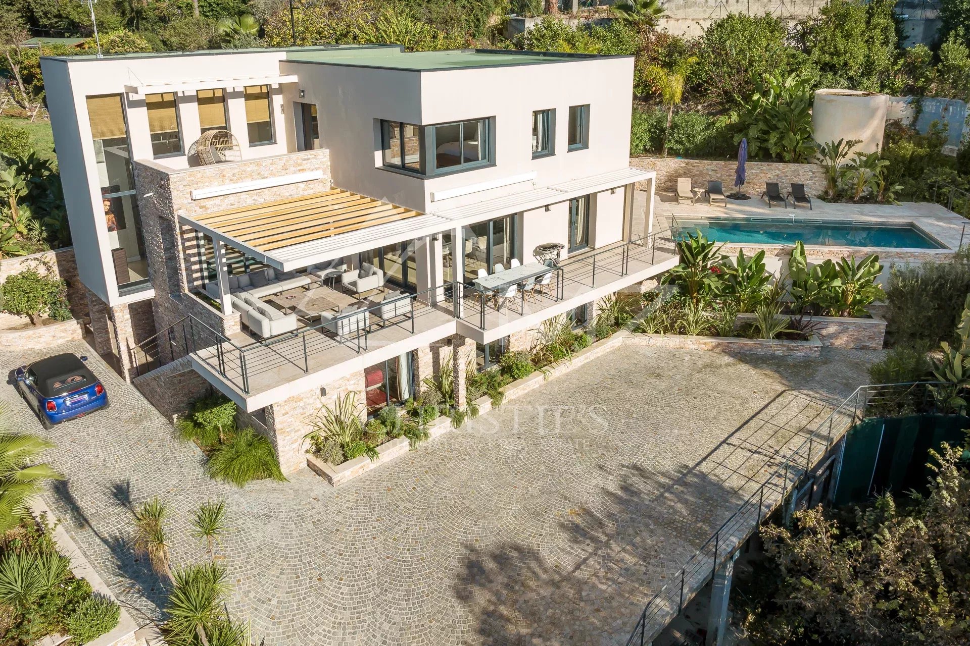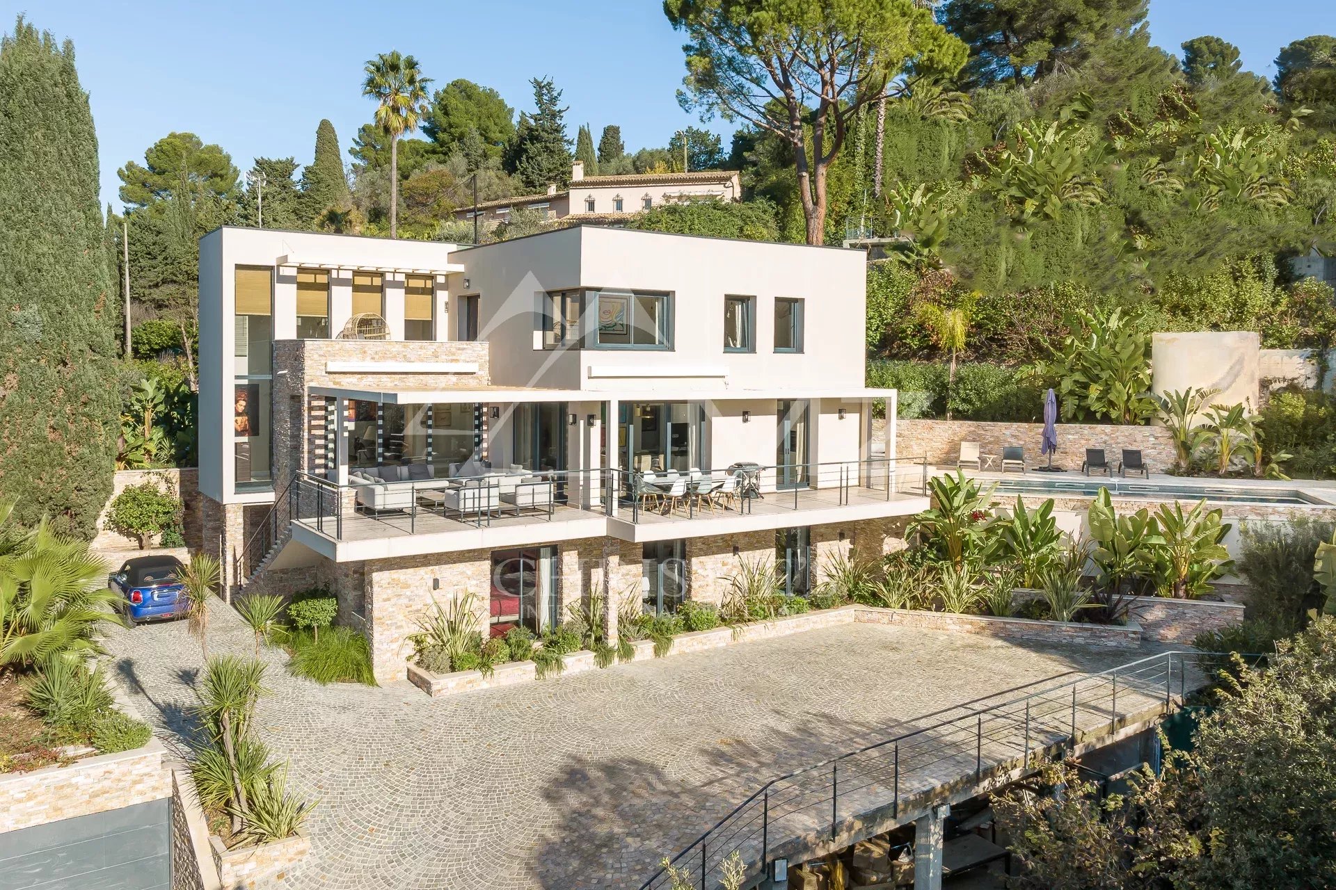 Exceptionnelle propriété contemporaine à la décoration raffinée, de 300m² environ. Offrant une vue mer sur la rade de Cannes et l'Estérel, 5 chambres en suite, salon, salle à manger, cuisine, solarium, buanderie. Terrain avec piscine chauffée entièrement paysager. Garage.