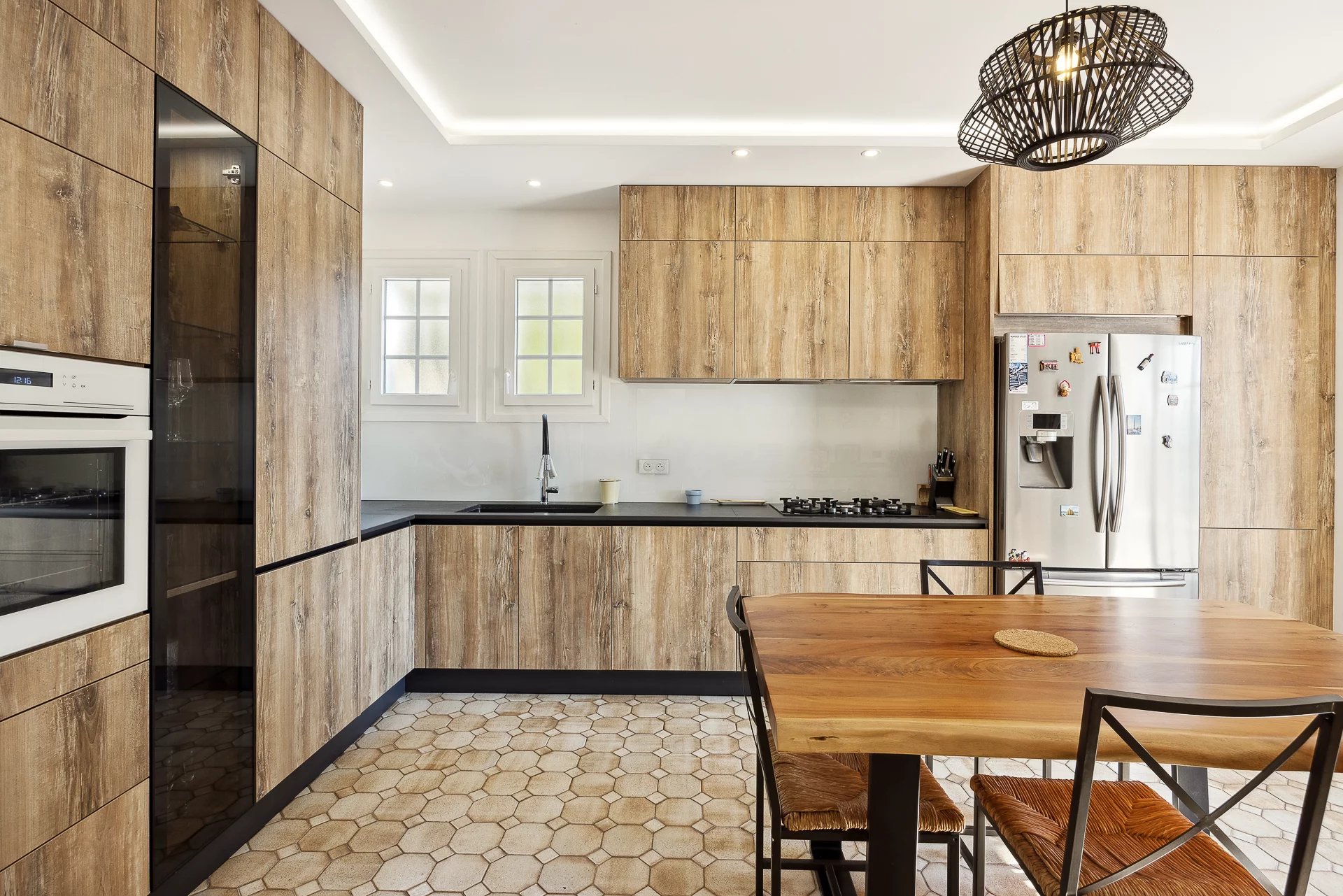Cette propriété, avec un potentiel de personnalisation, offre des volumes intéressants et une belle luminosité. Un atout notable : une piscine située au niveau des espaces de vie, offrant un potentiel pour une circulation fluide entre intérieur et extérieur.