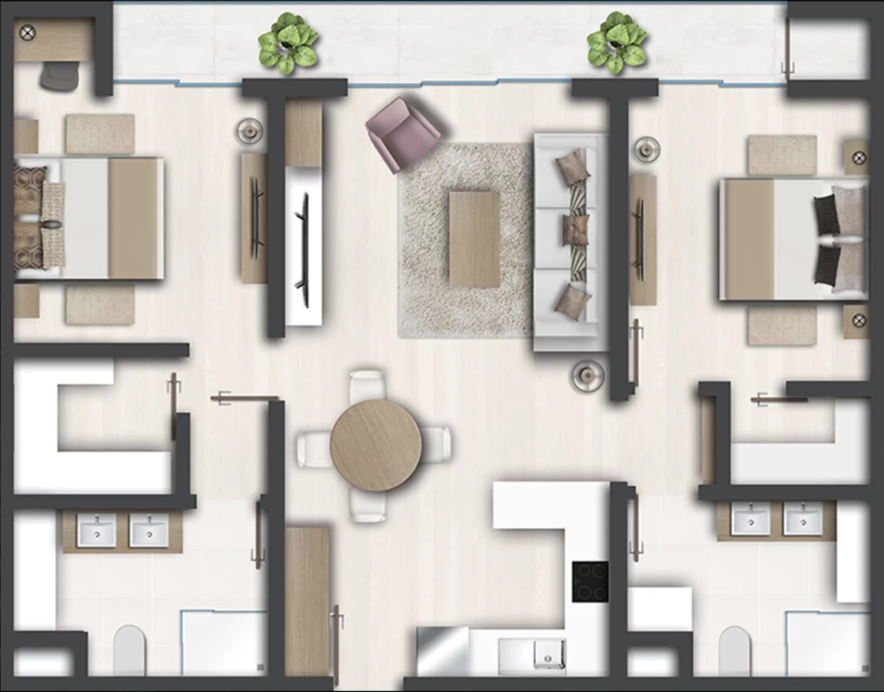 Modernes et lumineux cet appartement de 2 chambres offre un espace de vie comprenant une cuisine ouverte. La salle à manger et le salon donnent vue sur une terrasse ou un balcon. Les chambres climatisées ont une salle de bains attenante avec douche et WC ainsi qu'un dressing.