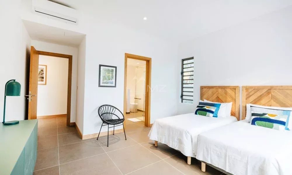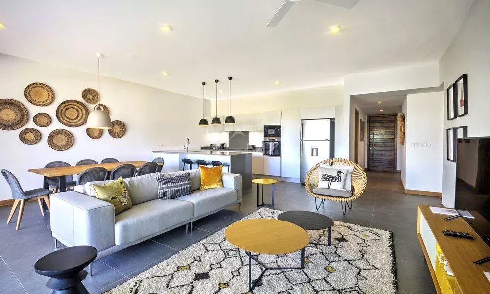 La pièce à vivre est composée de la cuisine, de la salle à manger et du salon. Vous aimerez ce salon pour sa lumière naturelle et son ouverture sur la terrasse ou le balcon de l'appartement. Les chambres sont conçues pour être confortables, reposantes et intimes. Chaque chambre dispose de sa propre salle de douche avec double lavabo. Dans la suite principale, un lit king size. Un charmant appartement en toute saison à l'île Maurice. Que ce soit à l'intérieur ou à l'extérieur, l'aménagement de ce bien offre à chacun la possibilité de se détendre. L'accès à la piscine commune se trouve à quelques pas de votre appartement.