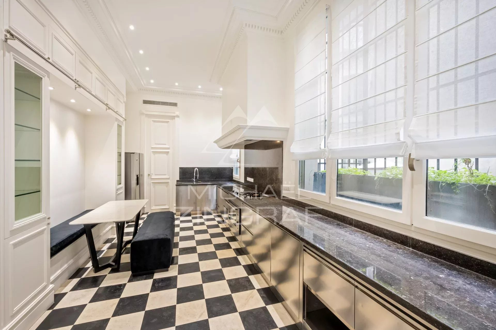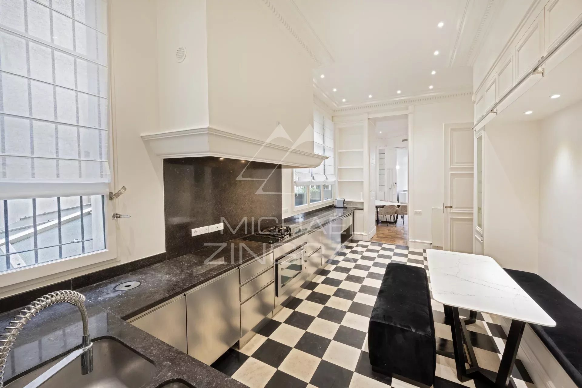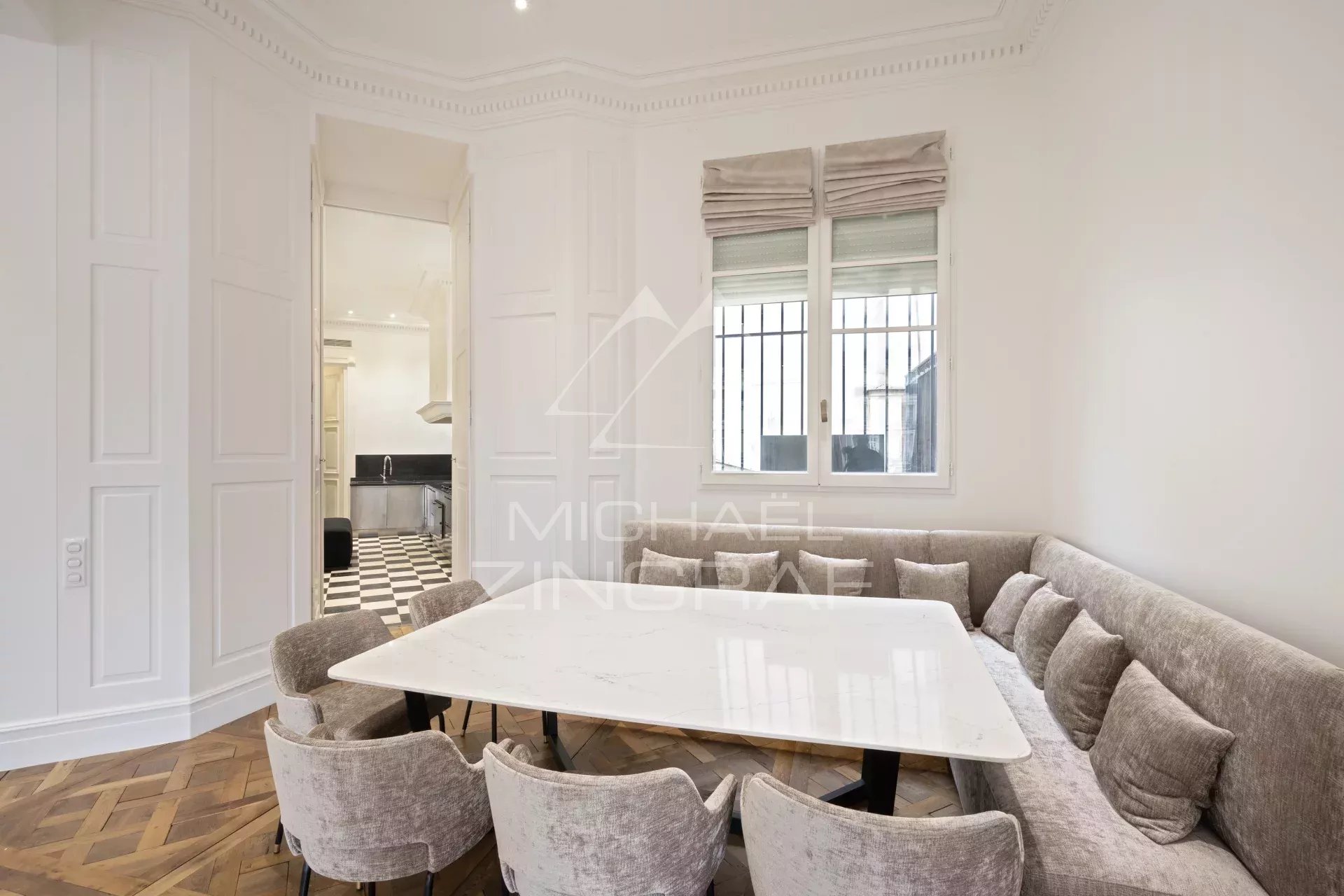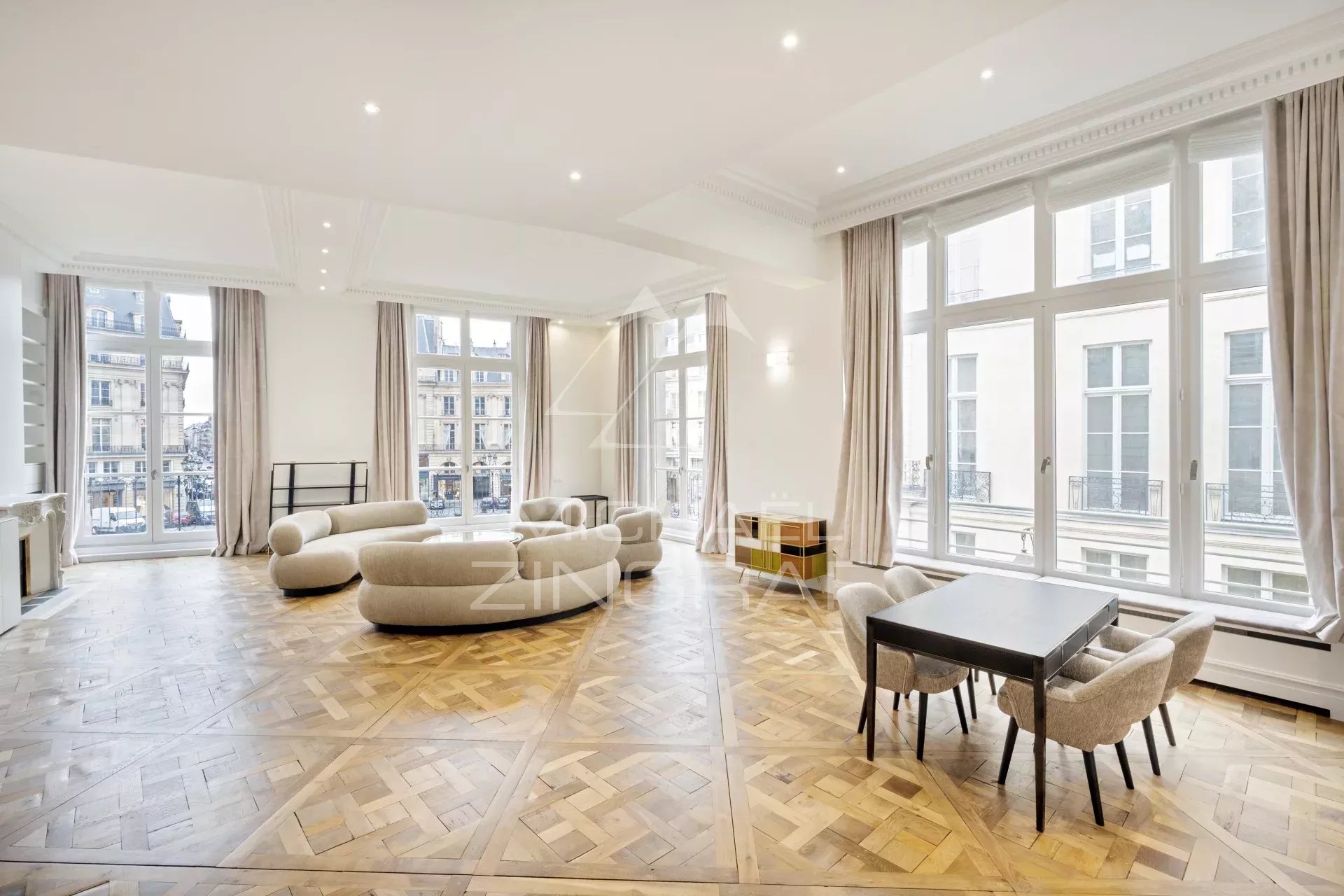 - un espace séjour de plus de 94m² ouvert sur un balcon donnant sur la Place des Victoires, bénéficiant d'un parquet Versailles d'origine et d'une avec hauteur sous plafond de plus de 4 mètres,