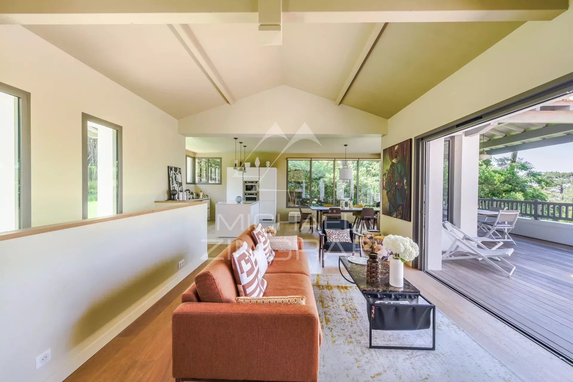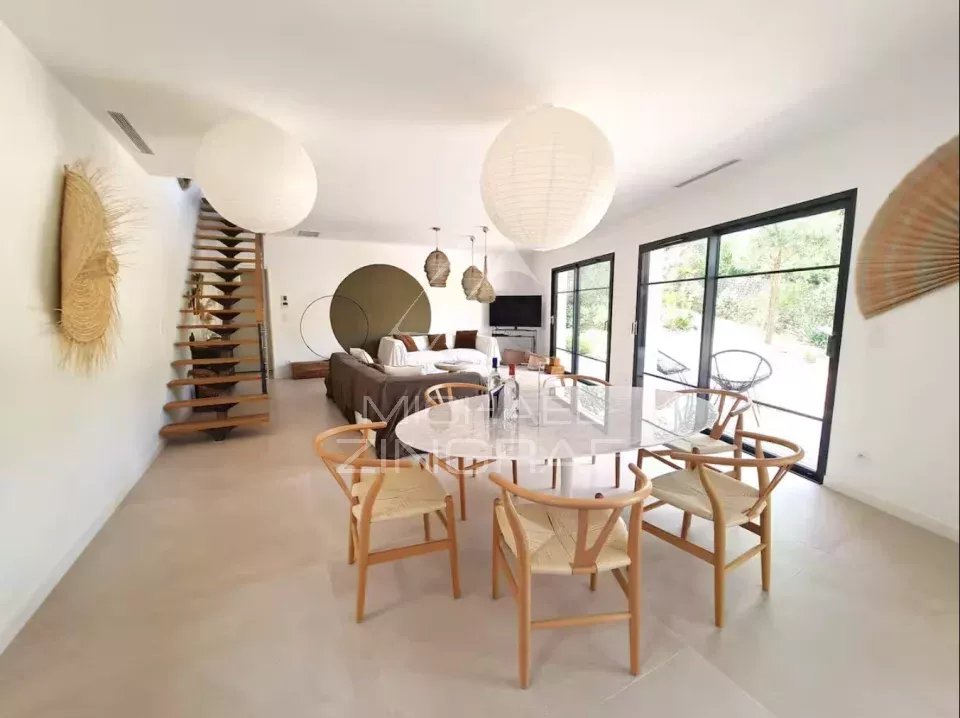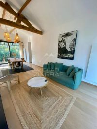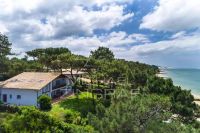 Idéalement située à 300 mètres de la plage, cette villa en bois sur trois niveaux offre de belles prestations dans un environnement boisé très calme ainsi qu'un aperçu sur le...