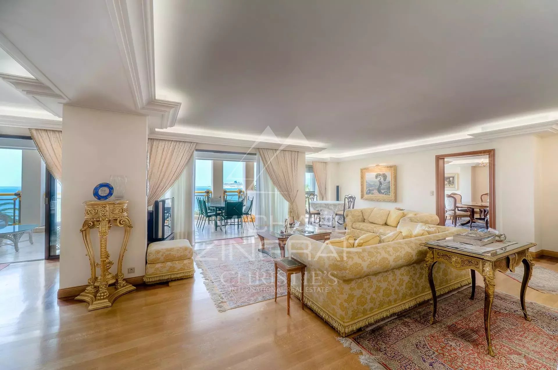 Idéalement situé et à pied du Palais des Festivals, cet appartement d'environ 200 m², avec vue mer et grande terrasse, comprend : un double séjour avec accès terrasse, une cuisine...