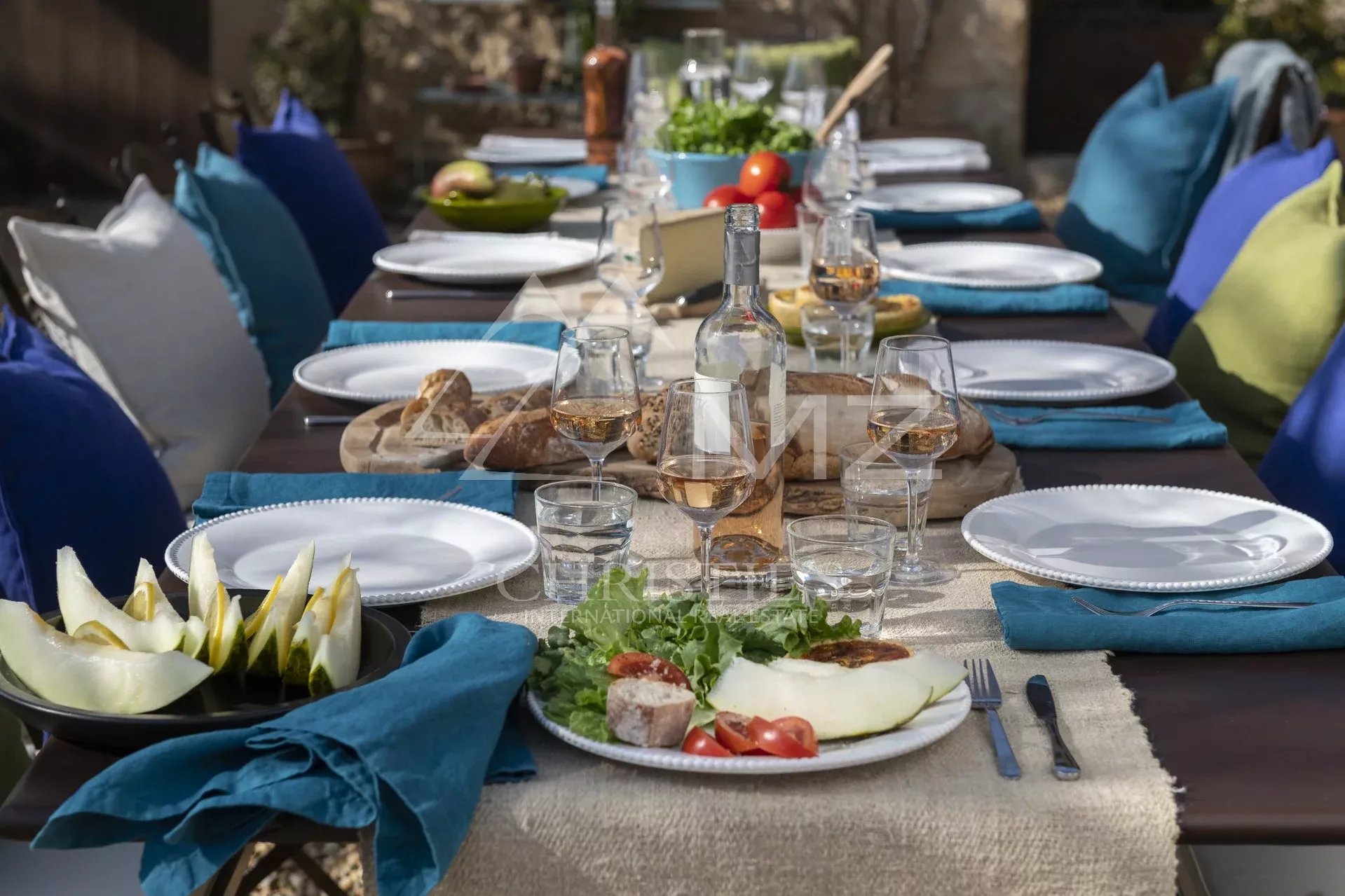 De beaux volumes et des prestations très soignées caractérisent la maison principale qui propose 4 vastes suites avec leurs terrasses indépendantes. Deux autres suites en annexes complètent cet ensemble rare pouvant accueillir confortablement jusqu'à 18 convives.
